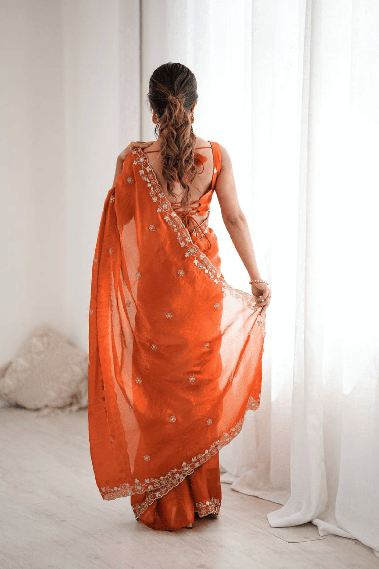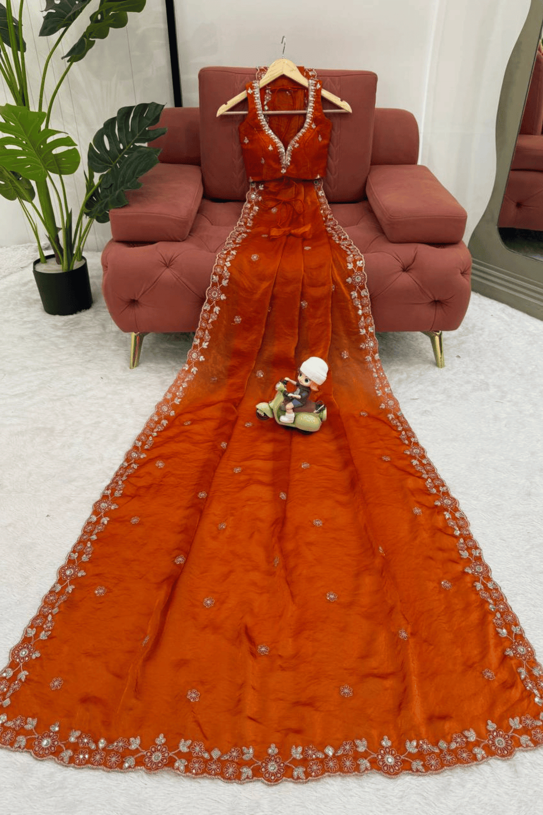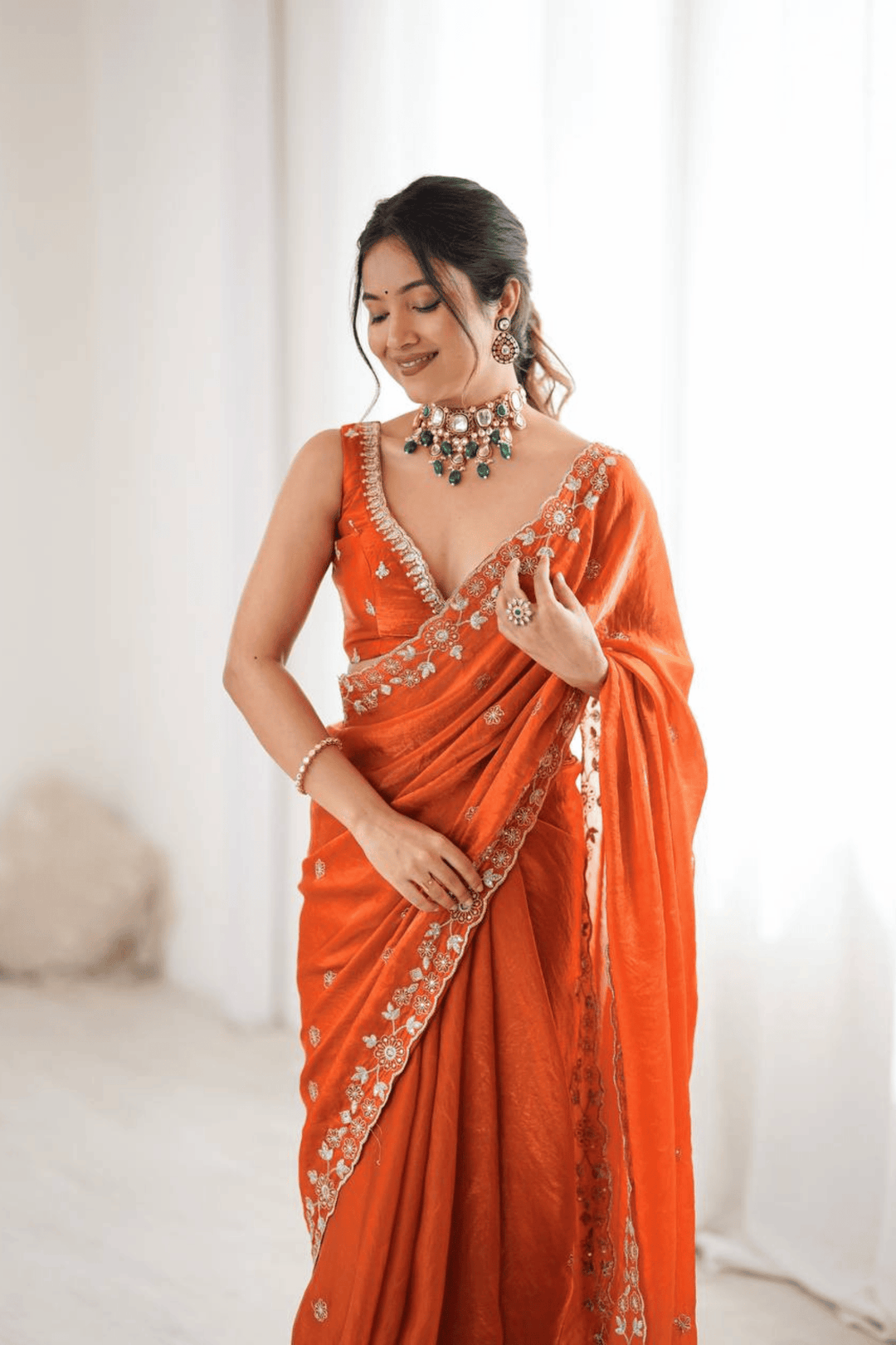 This ready-to-wear orange organza Glamwiz saree is a celebration of lightness, grace, and effortless charm. Delicately adorned with thread and sequins embroidery, its sheer, breezy fabric makes it perfect for daytime festivities, ceremonies, or garden weddings.