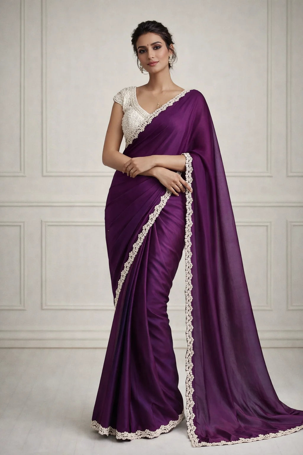 Fall in love with power dressing through Purple saree, a ready to wear saree that blends sultry elegance with bold femininity. Rich in color and adorned with delicate embellishments along the border, this saree is designed for the woman who commands attention with effortless grace.