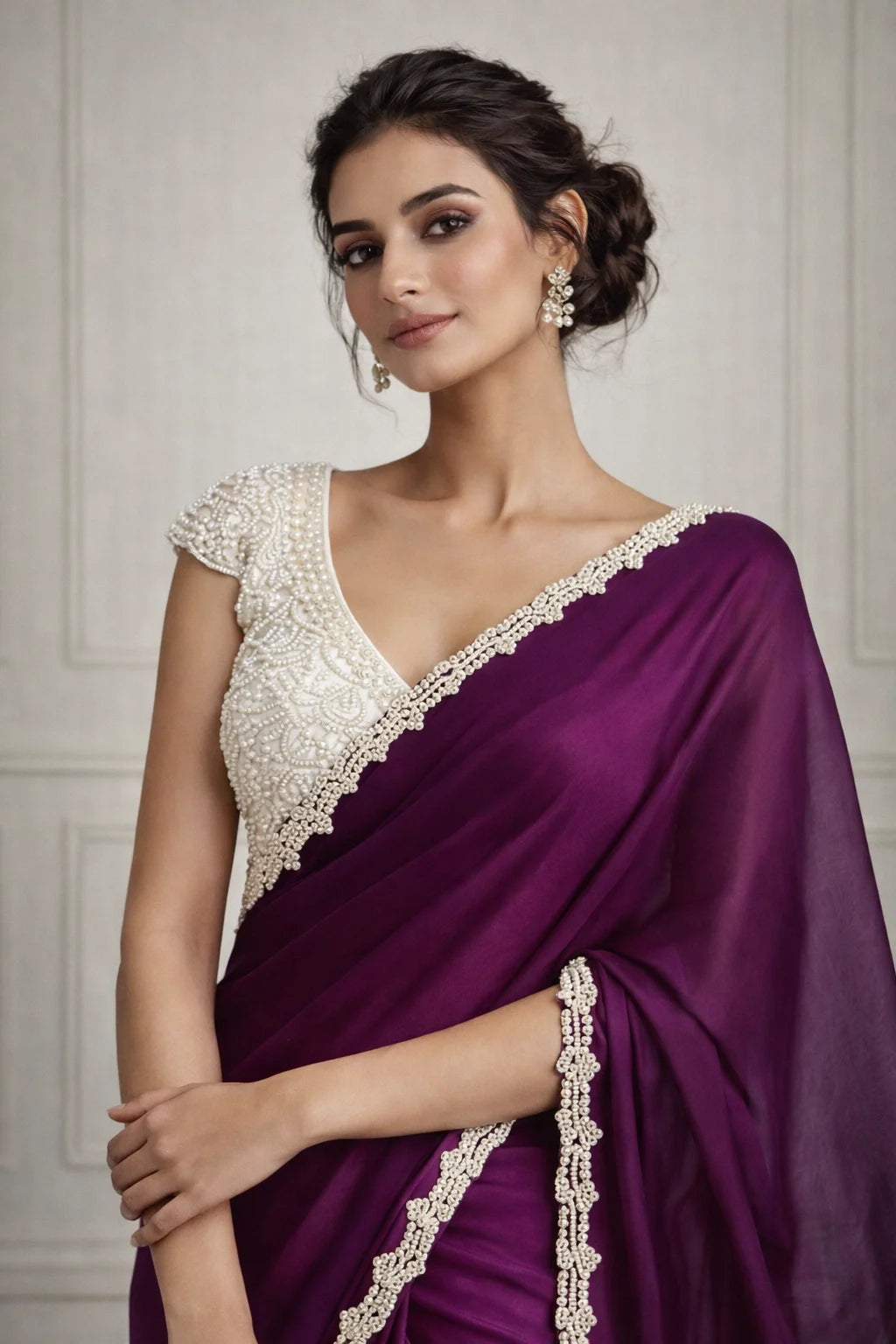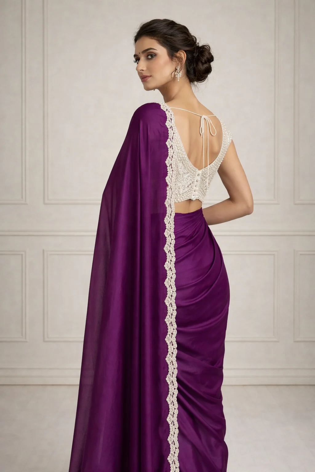 Purple Wine Ready-to-Wear Saree with Stitched Pearl Blouse