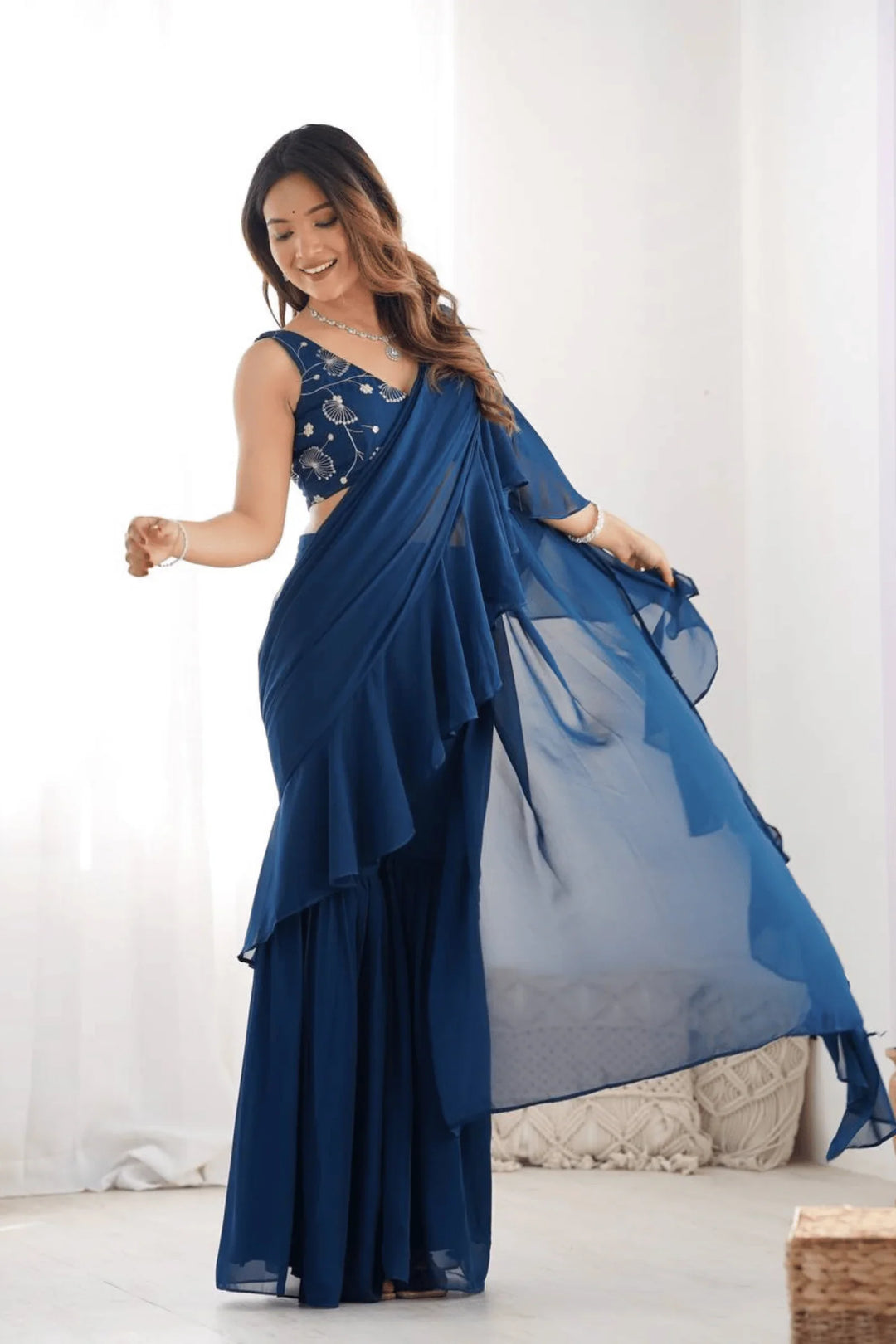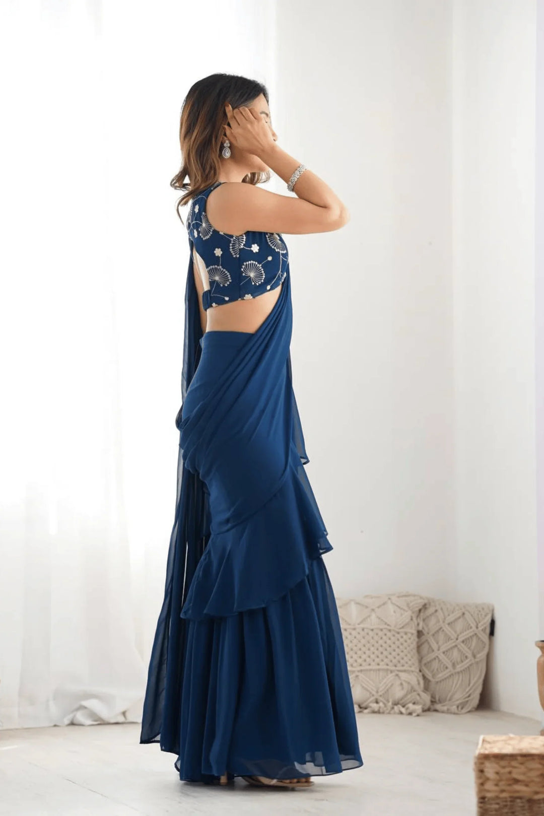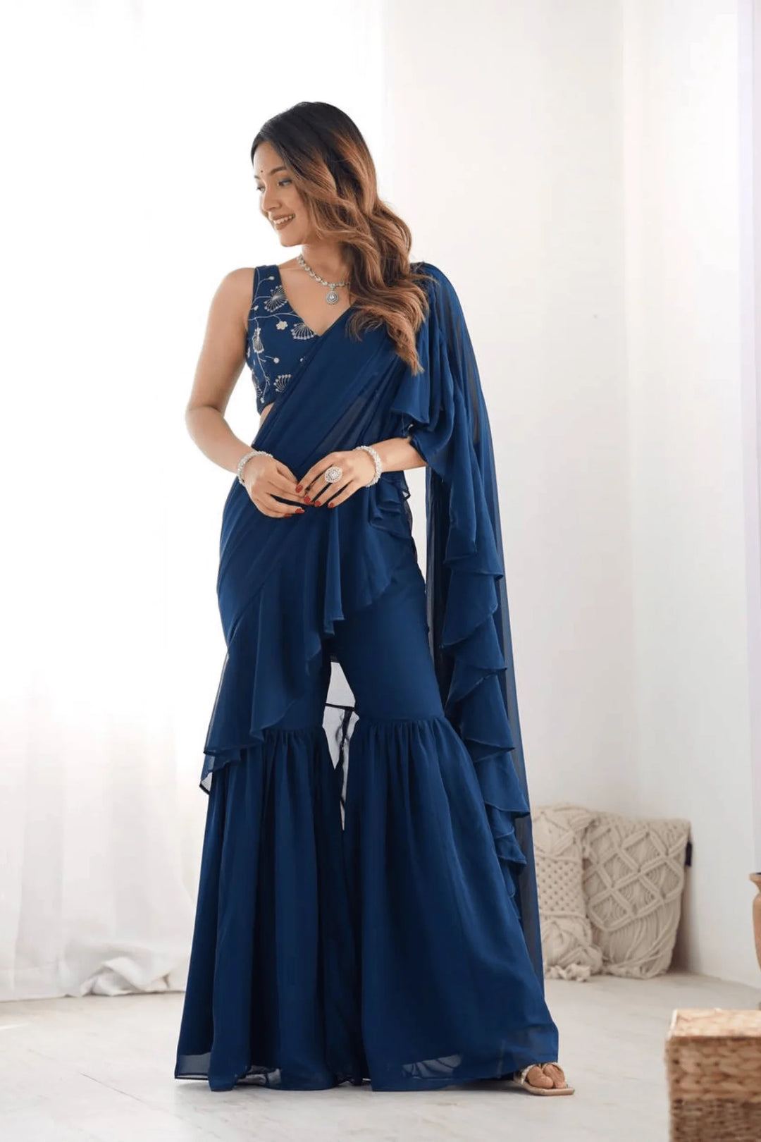 Our Latest collection of Ready to Wear Sharara saree with timeless addition for the upcoming festivities and weddings. Ready To Wear Sharara Saree With Full Stitched Blouse Premium Fox Georgette Fabric.