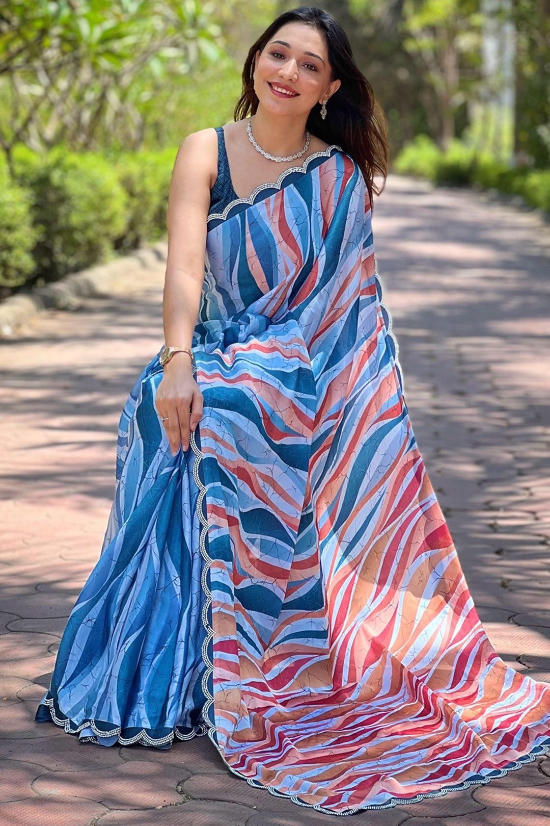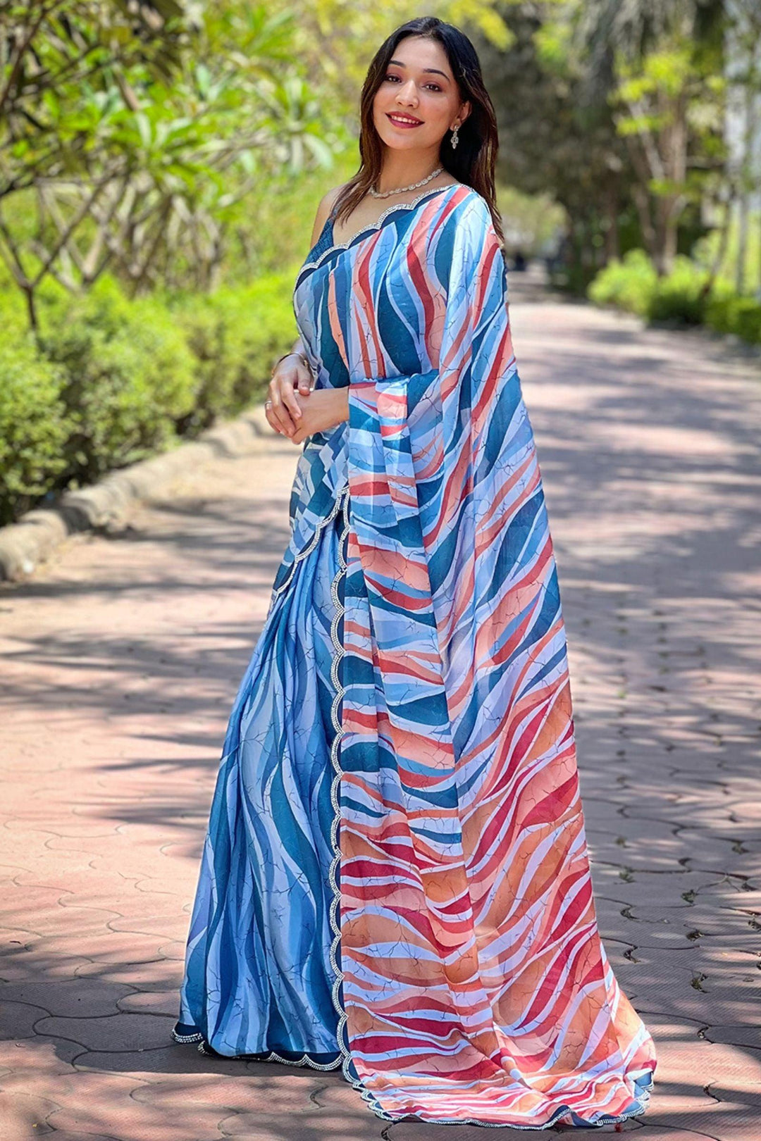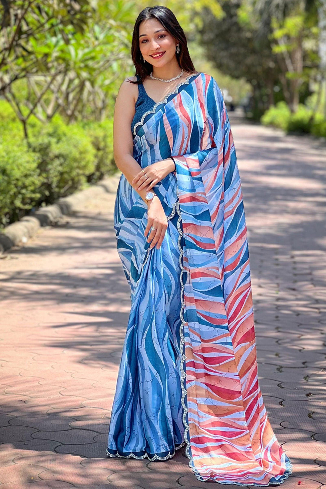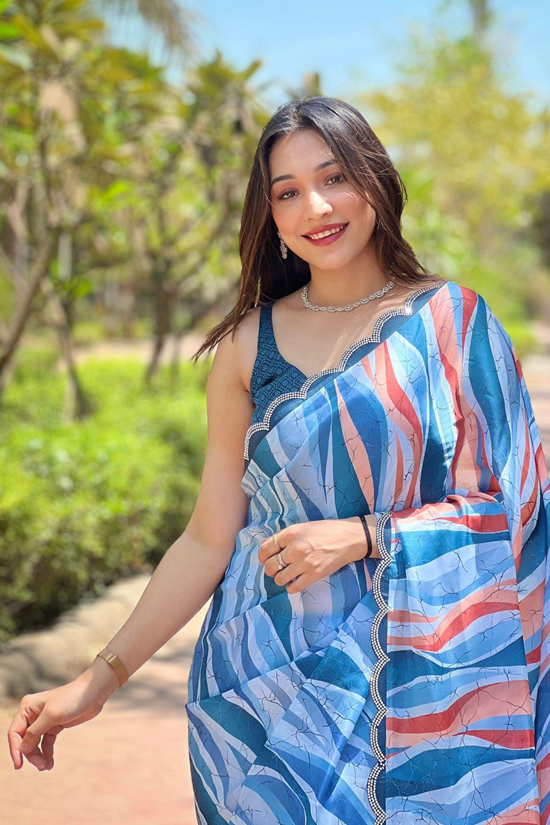 Elevate your style effortlessly with Glamwiz's Ready To Wear Blue Printed Satin Georgette Saree. Crafted from pure satin georgette and adorned with a mesmerizing batik polka dots print, it seamlessly blends tradition and convenience. Featuring exquisite cut work and a unique half-half print design, this saree embodies the perfect fusion of heritage and modern elegance, true to the essence of the Glamwiz brand.