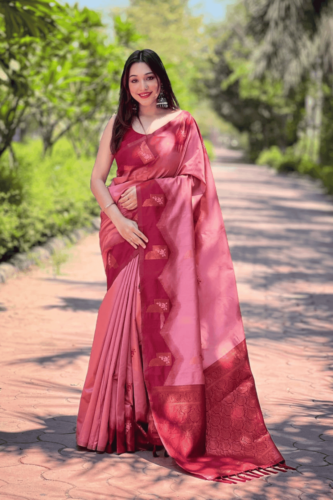 A Ready to Wear Borderless Banarasi Woven Saree with geometrical woven motifs across the saree.  The soft silk saree comes along with tone-to-tone matching blouse.