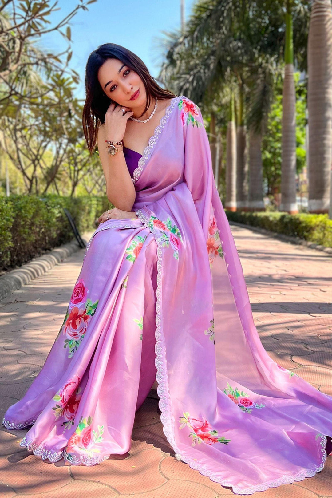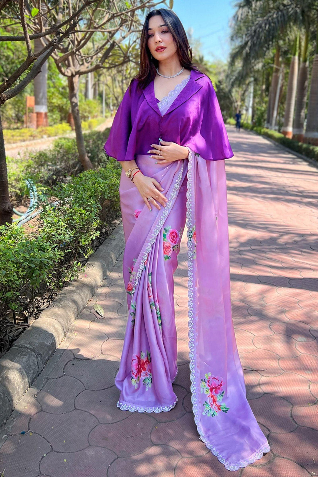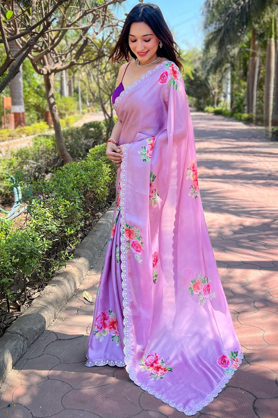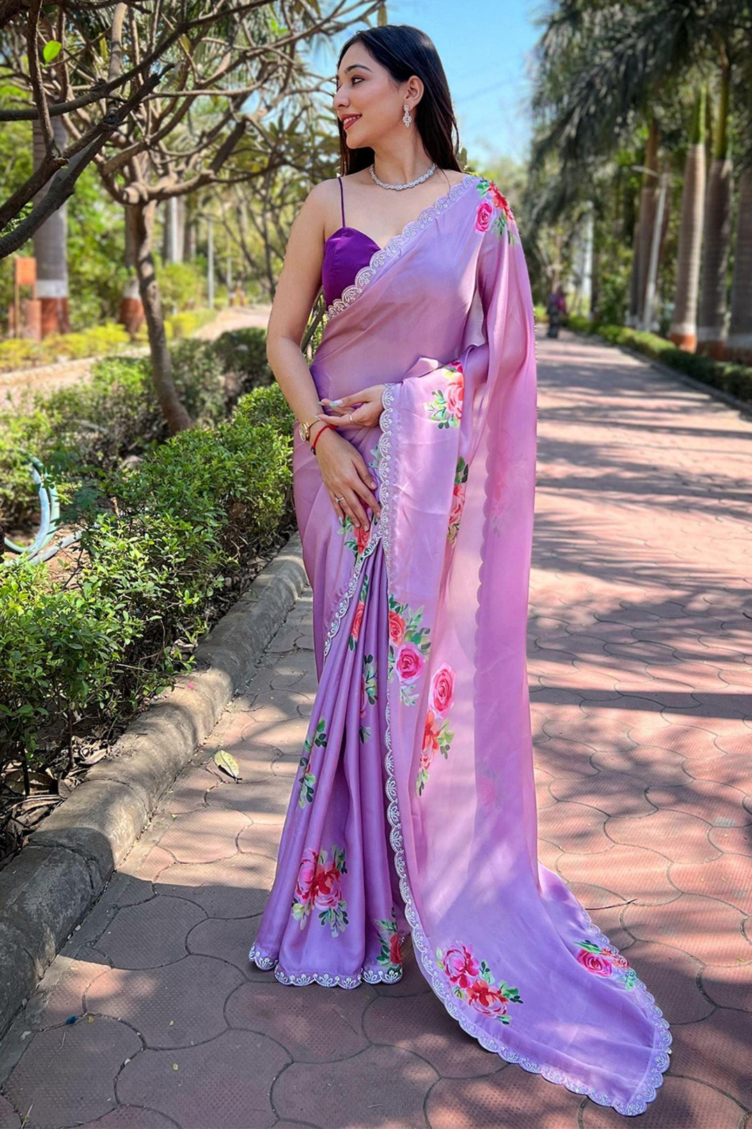 Embrace sophistication in our Ready To Wear Lavender Floral Georgette Saree, delicately crafted from pure satin georgette adorned with exquisite floral prints. Enhanced by a shimmering zircon Swarovski border, this Glamwiz ensemble seamlessly merges tradition with convenience, ensuring timeless elegance for every affair.