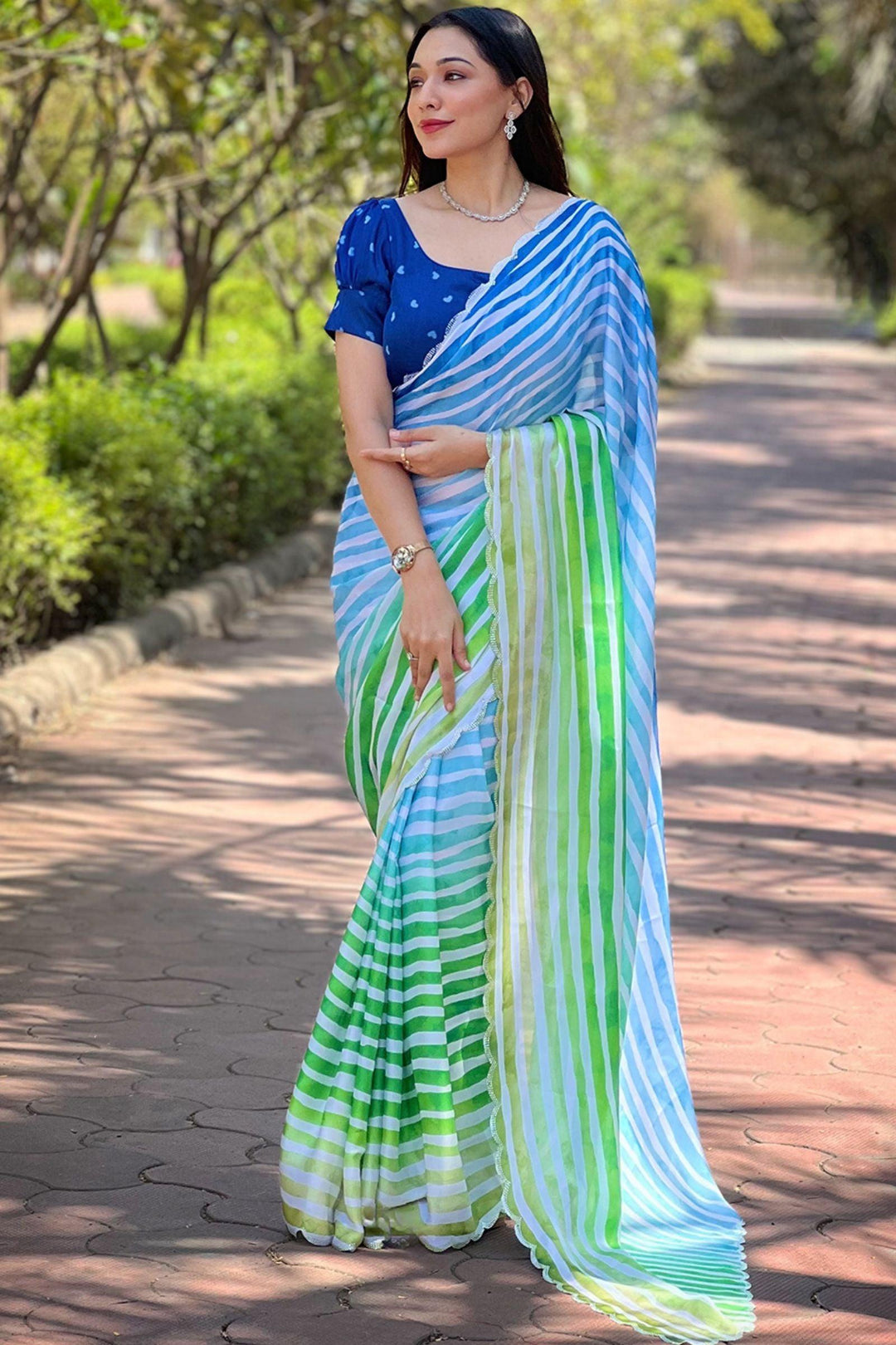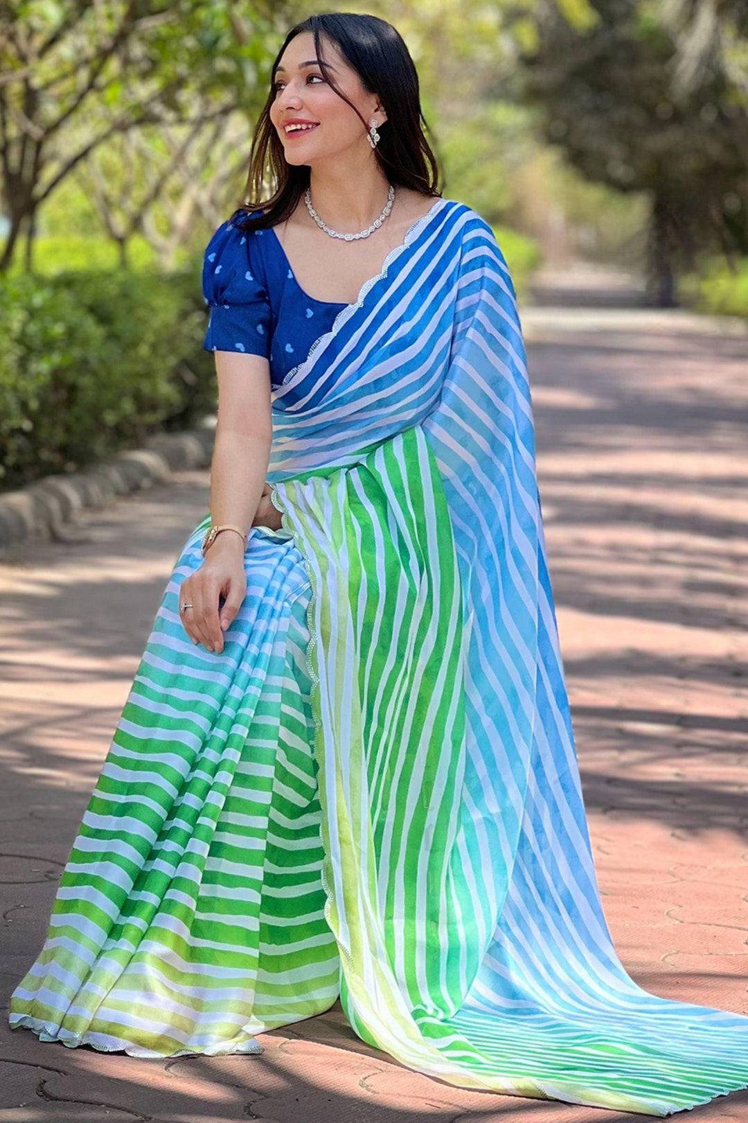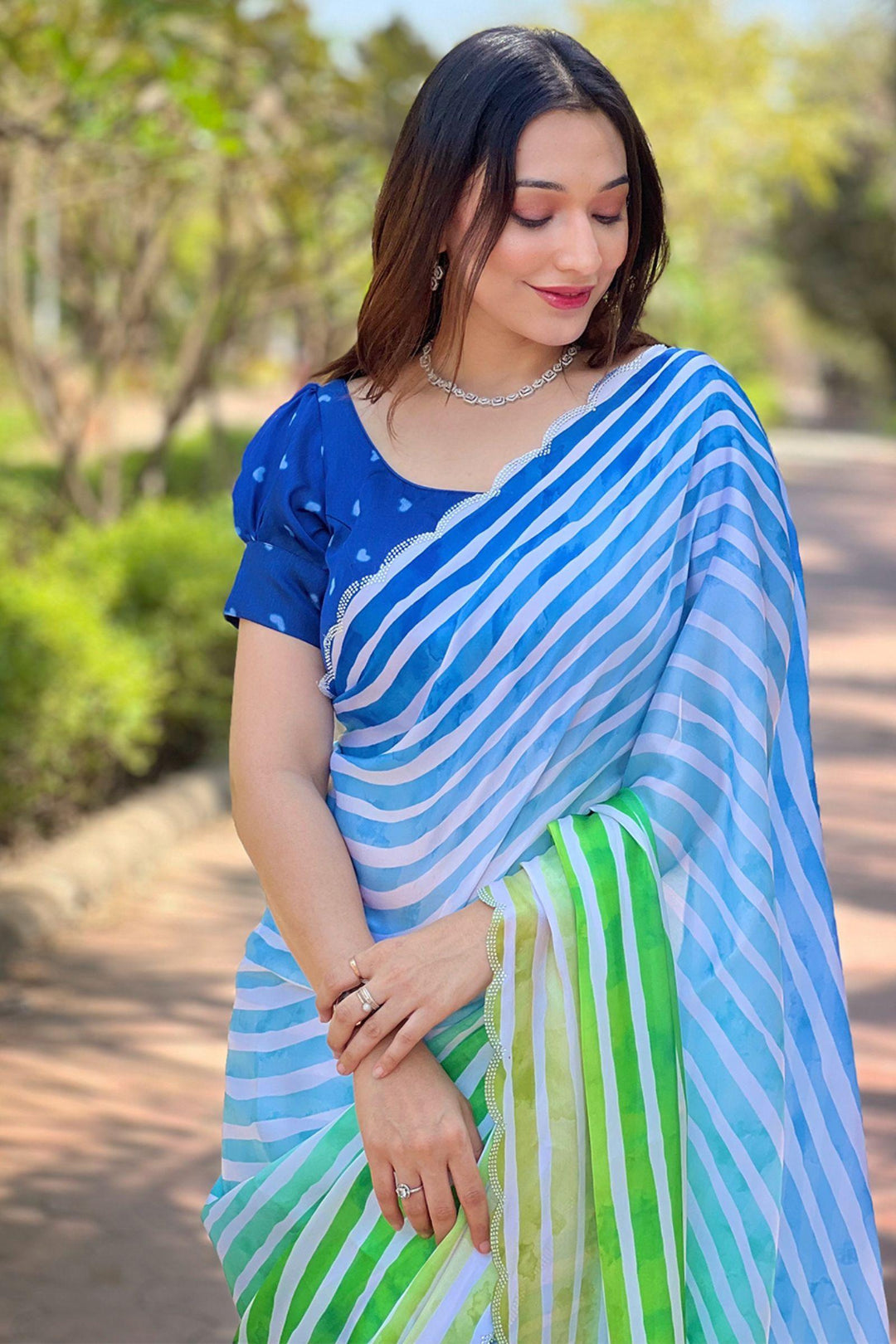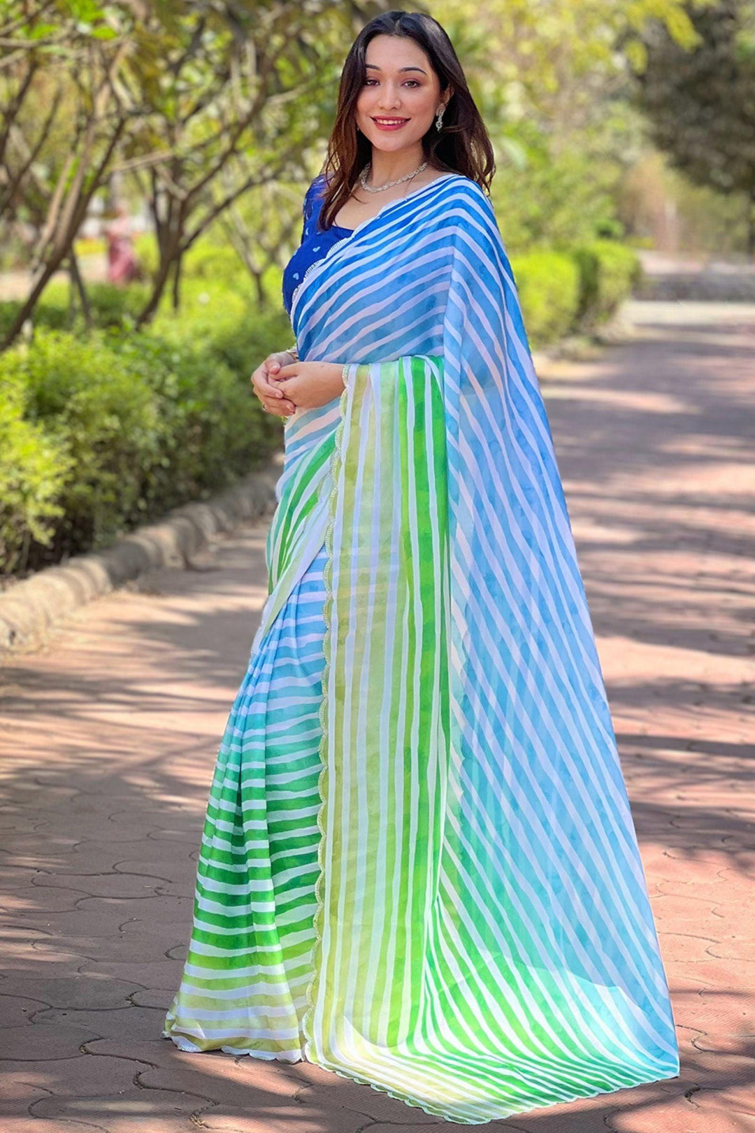 Ready To Wear Lime N Blue Satin Georgette Saree