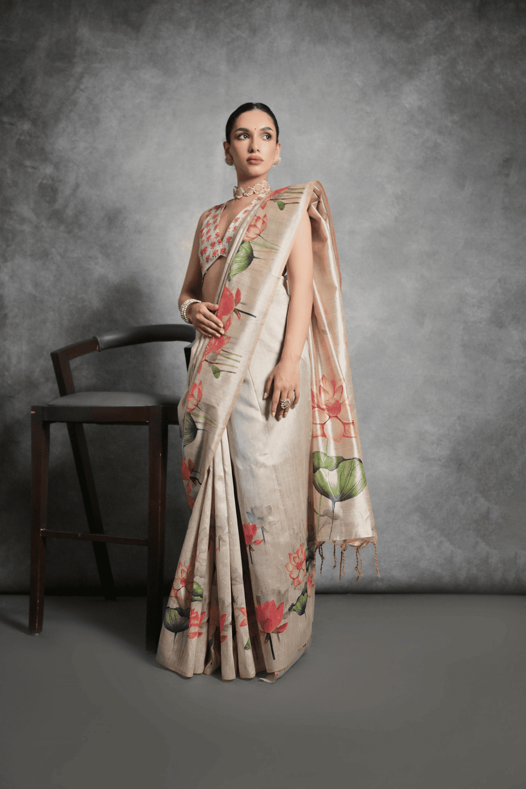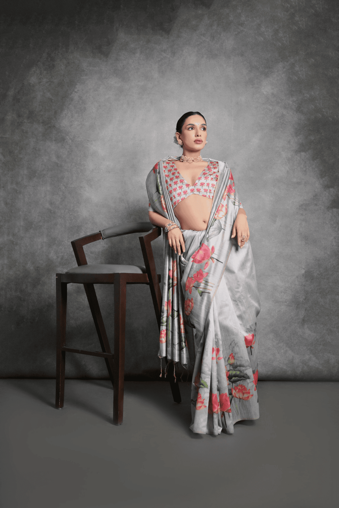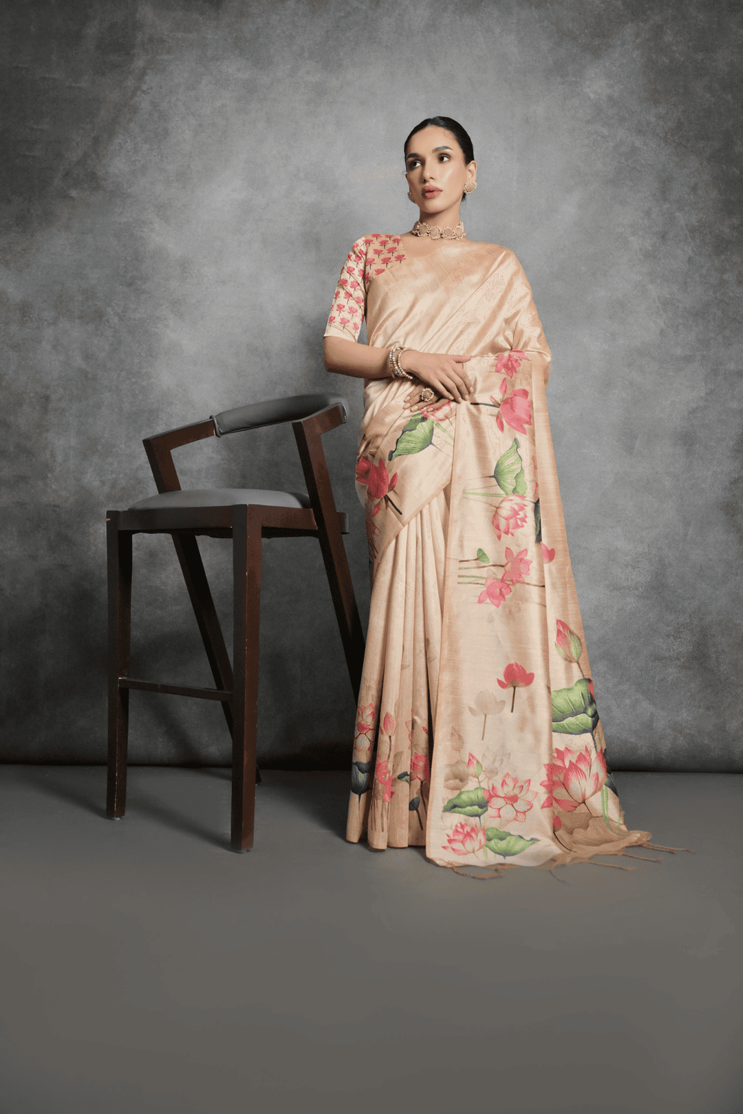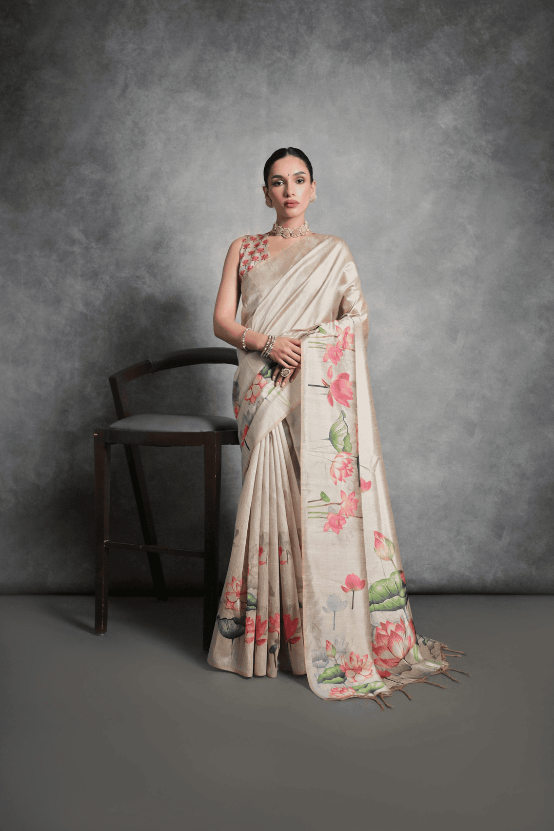Introducing Glamwiz Ready to Wear Lotus Printed Tussar Saree. Experience the perfect blend of tradition and convenience with the Glamwiz Ready-to-Wear Saree.