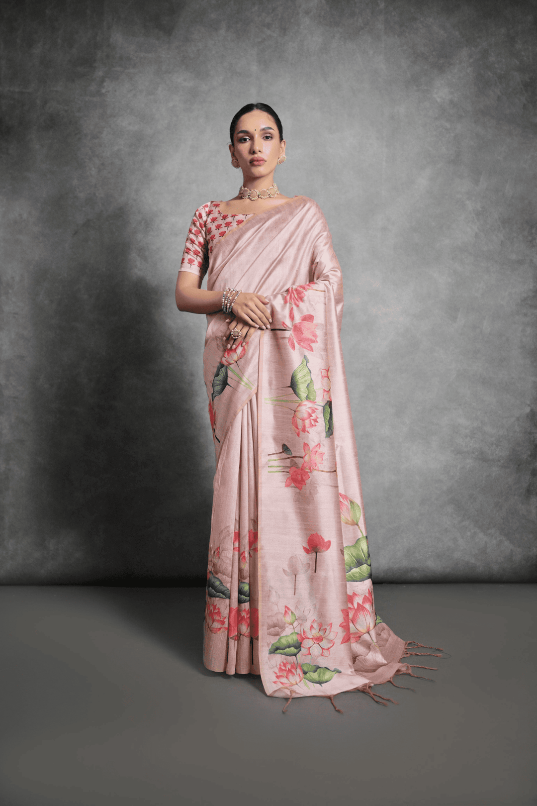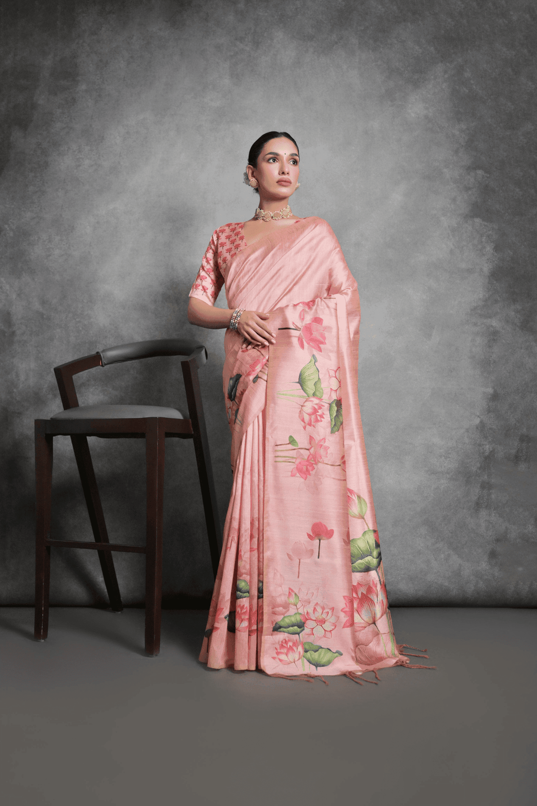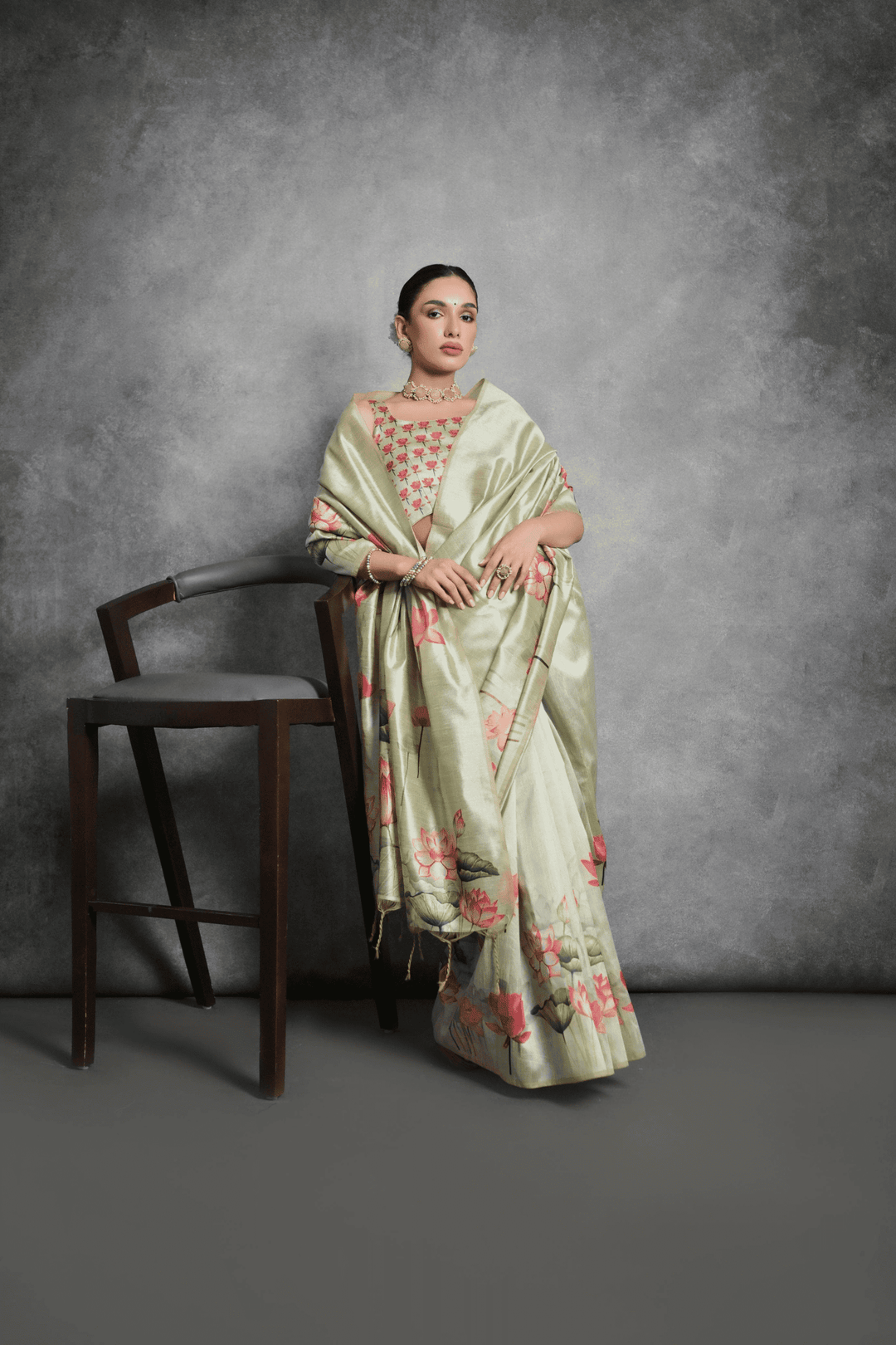 Introducing Glamwiz Ready to Wear Lotus Printed Tussar Saree. Experience the perfect blend of tradition and convenience with the Glamwiz Ready-to-Wear Saree.