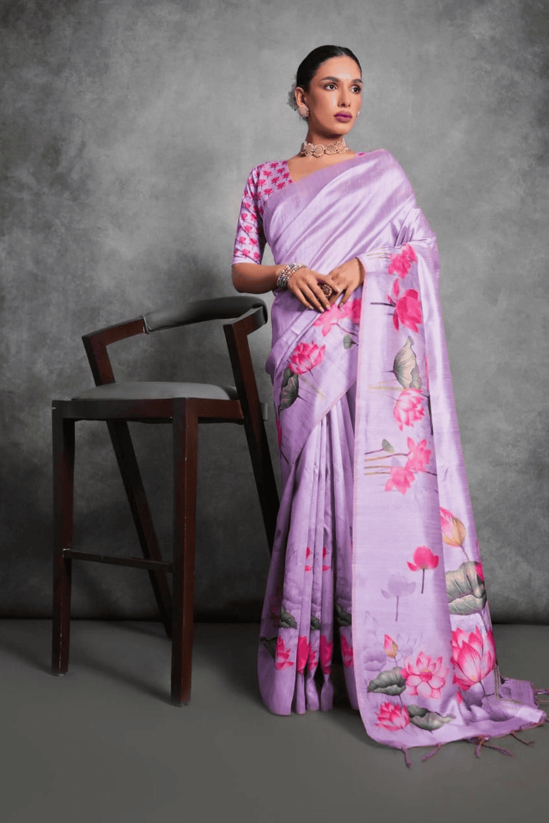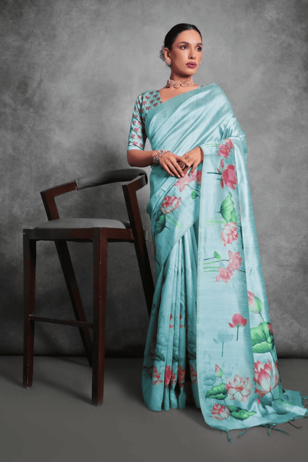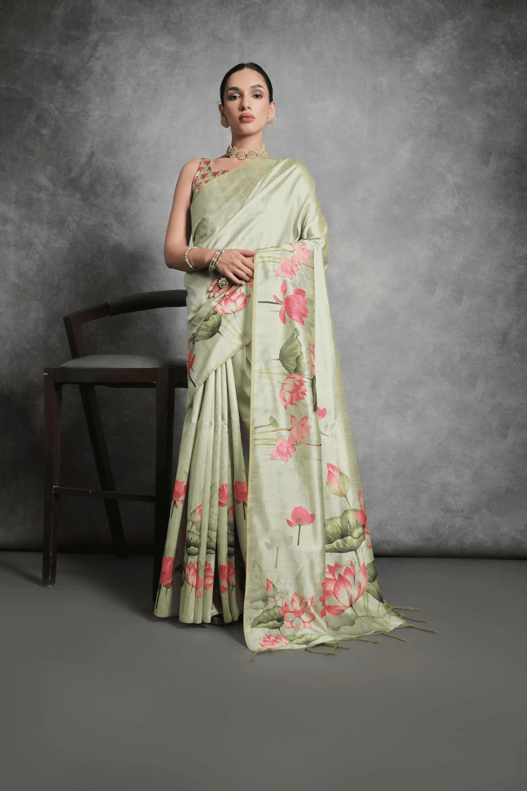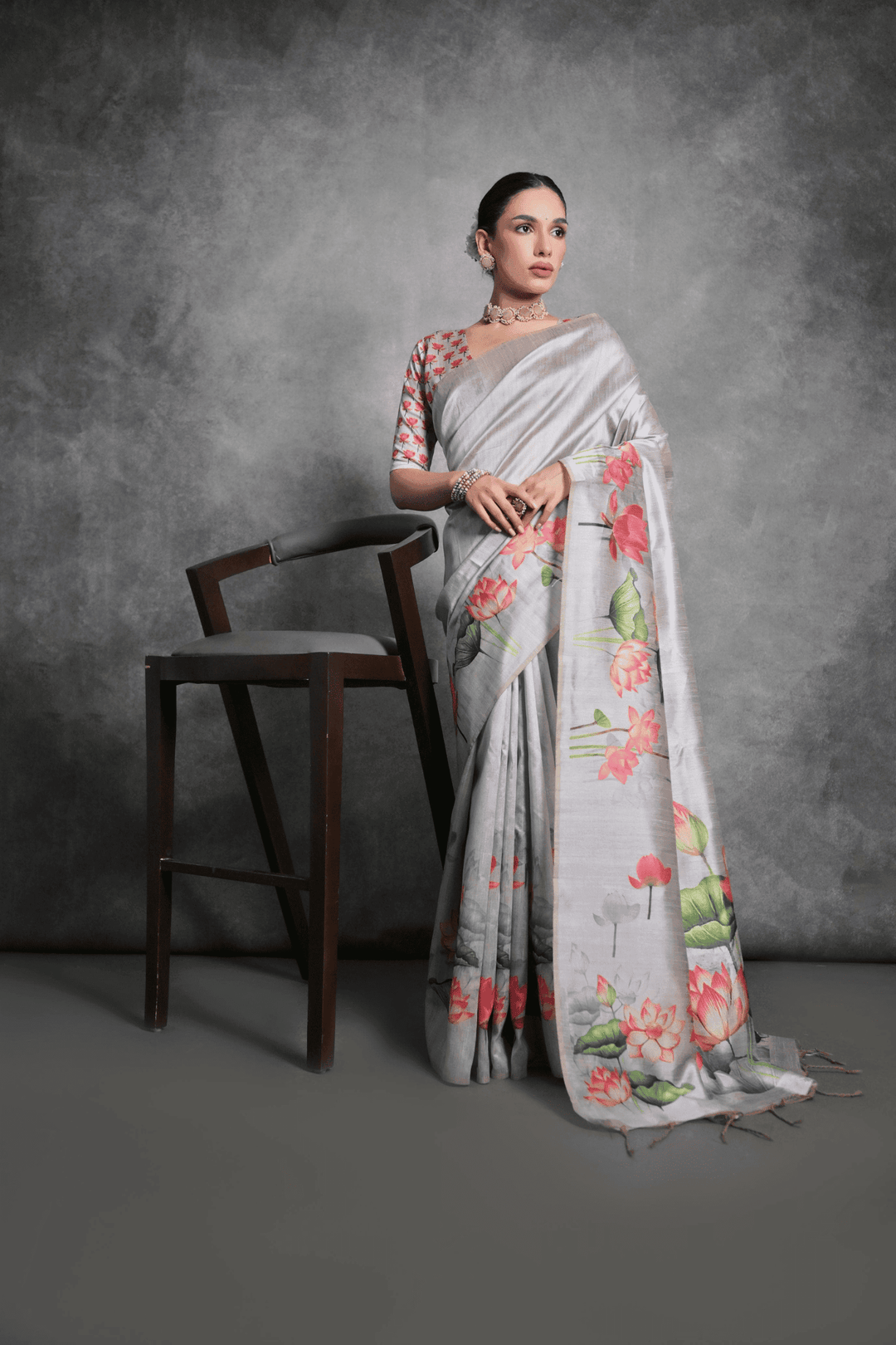 Introducing Glamwiz Ready to Wear Lotus Printed Tussar Saree. Experience the perfect blend of tradition and convenience with the Glamwiz Ready-to-Wear Saree.