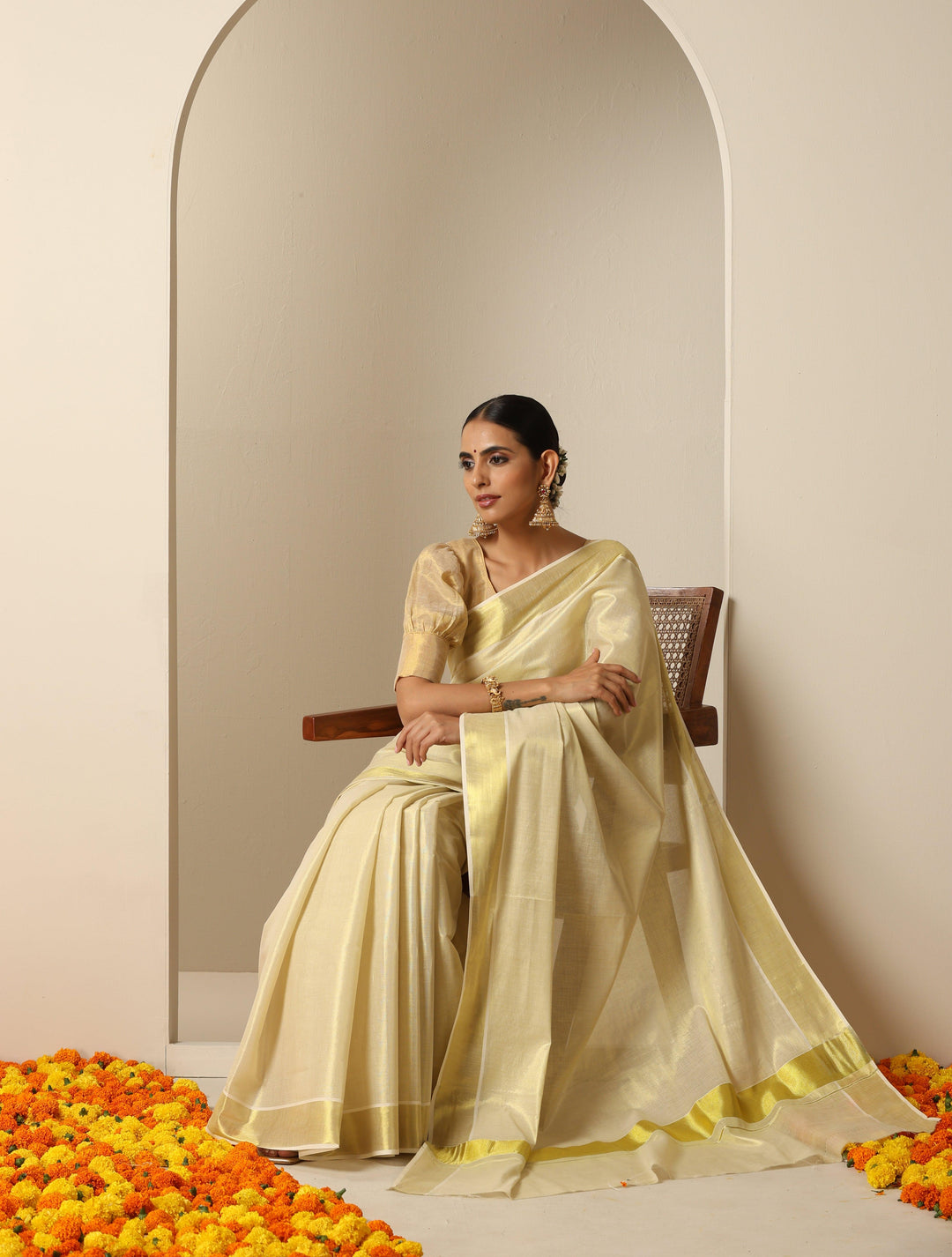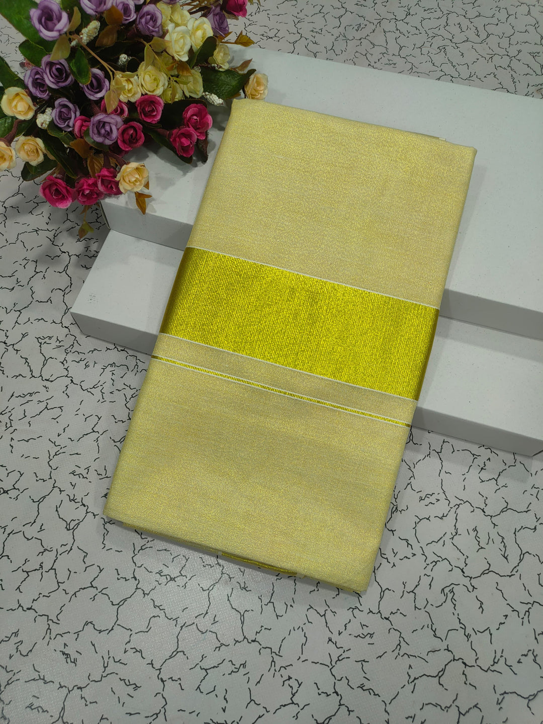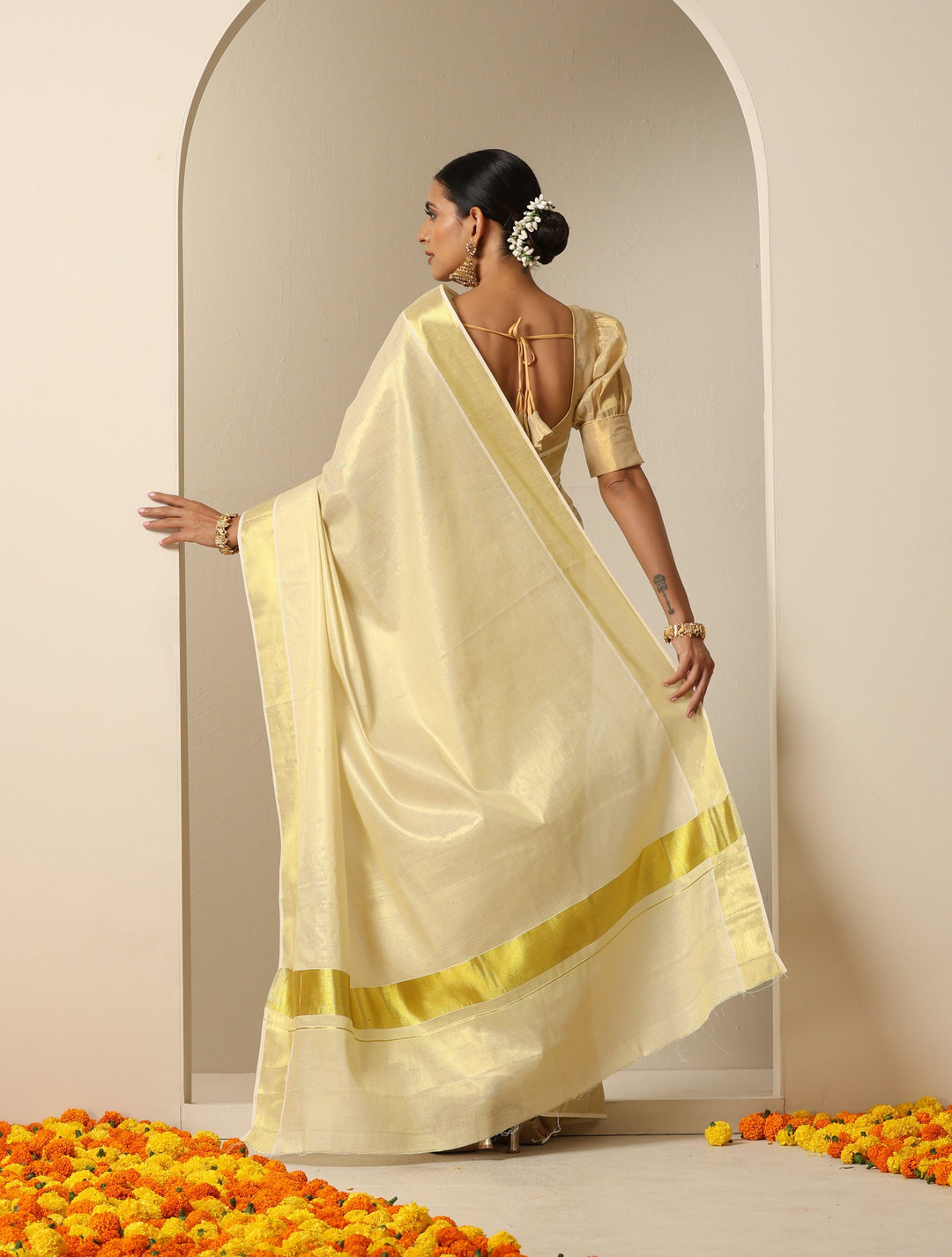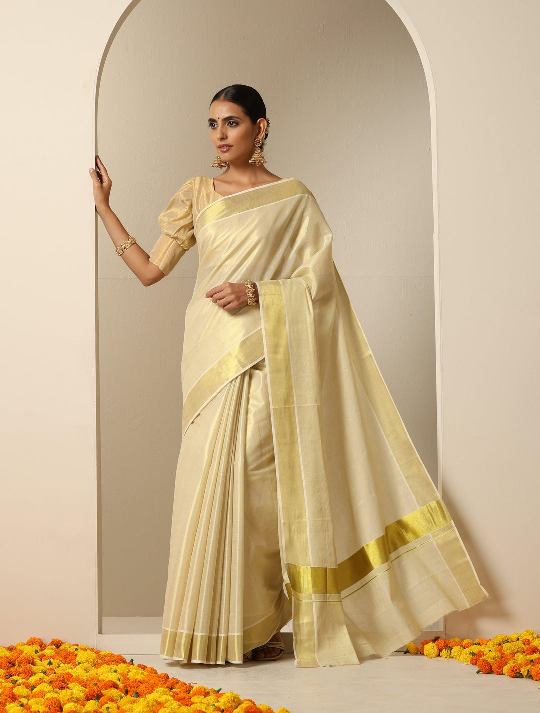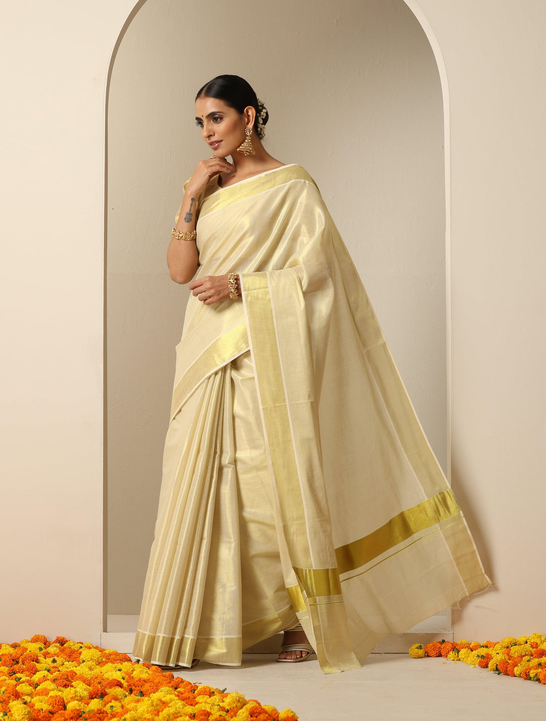 - Cotton Tissue saree with 3 inch Golden border.
