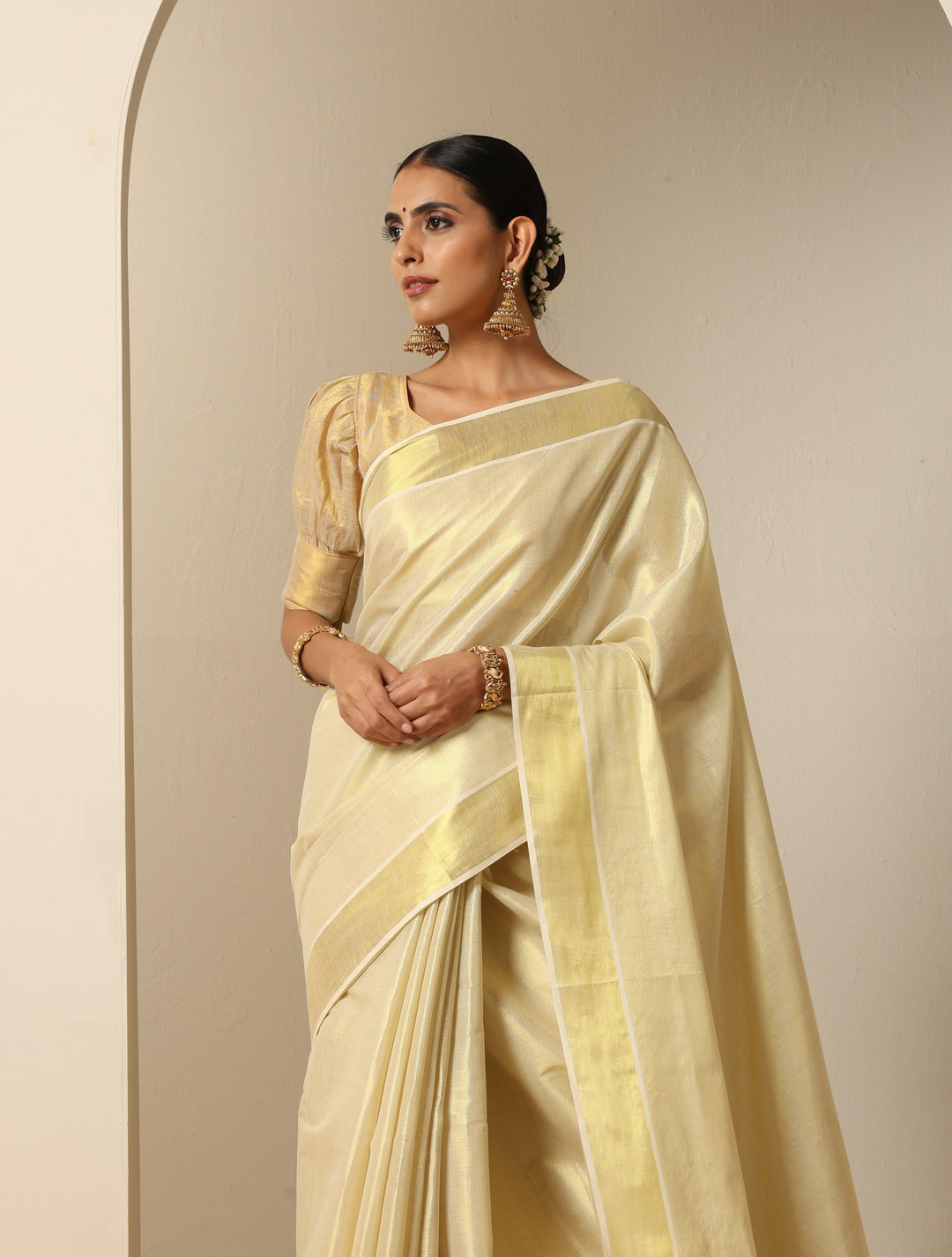 Ready to Wear Off White Kasavu Tissue Saree