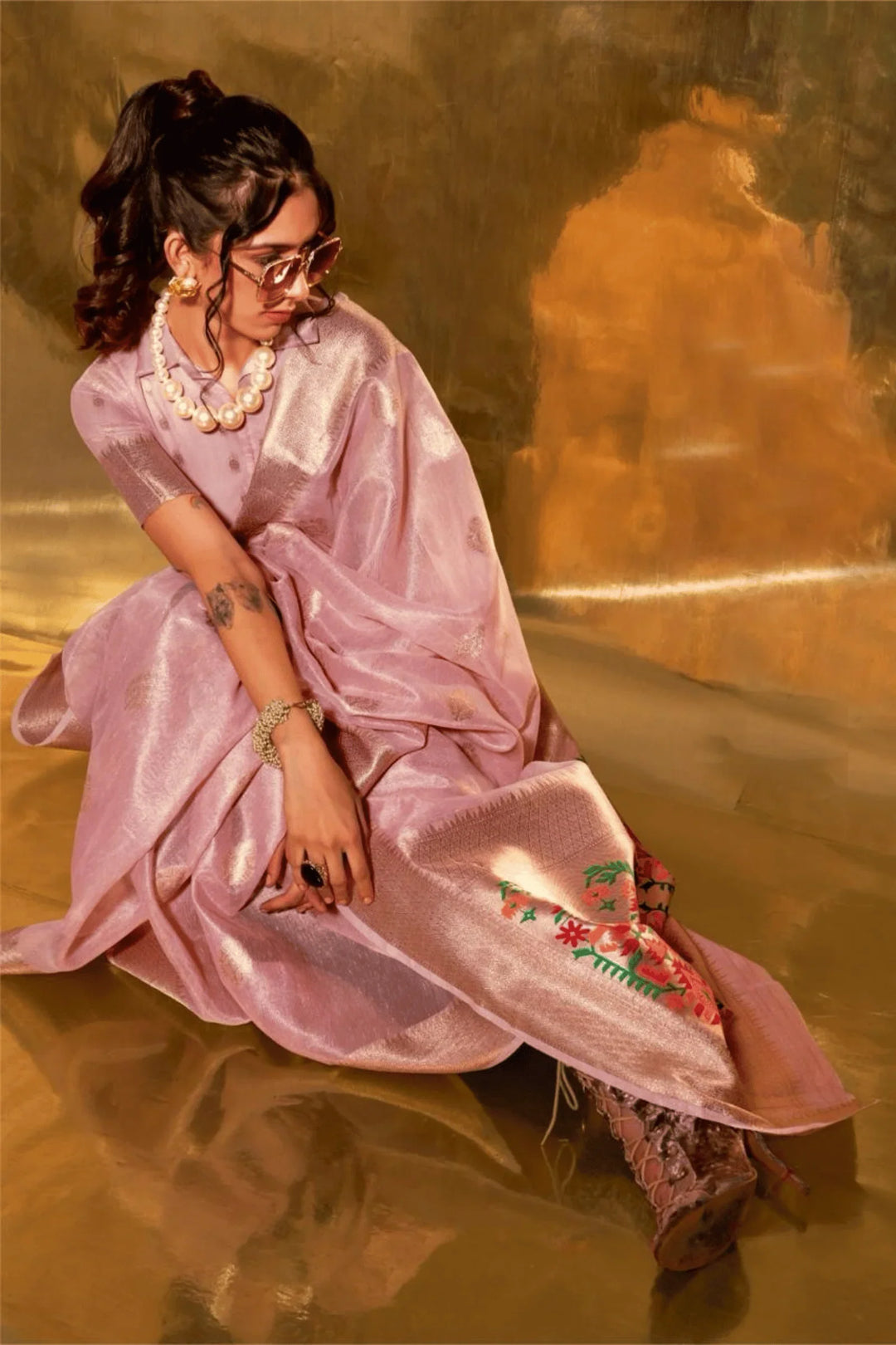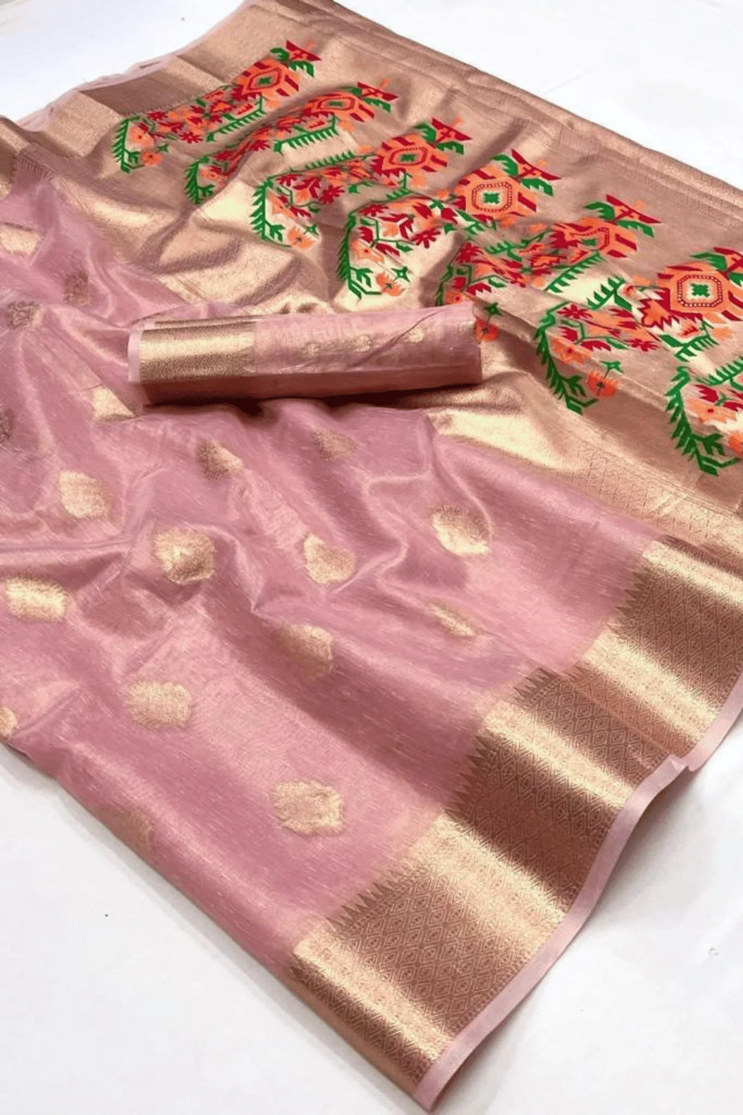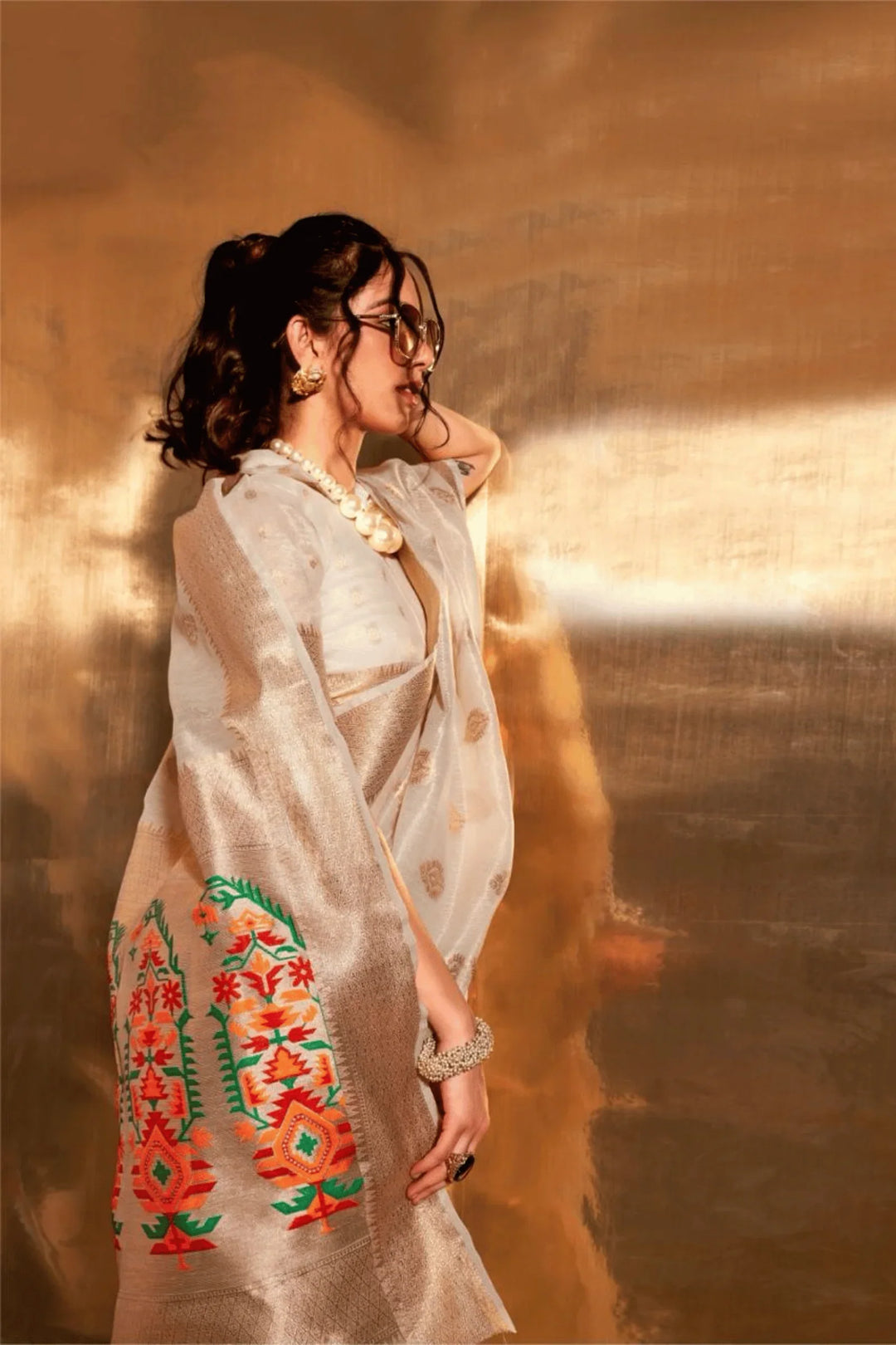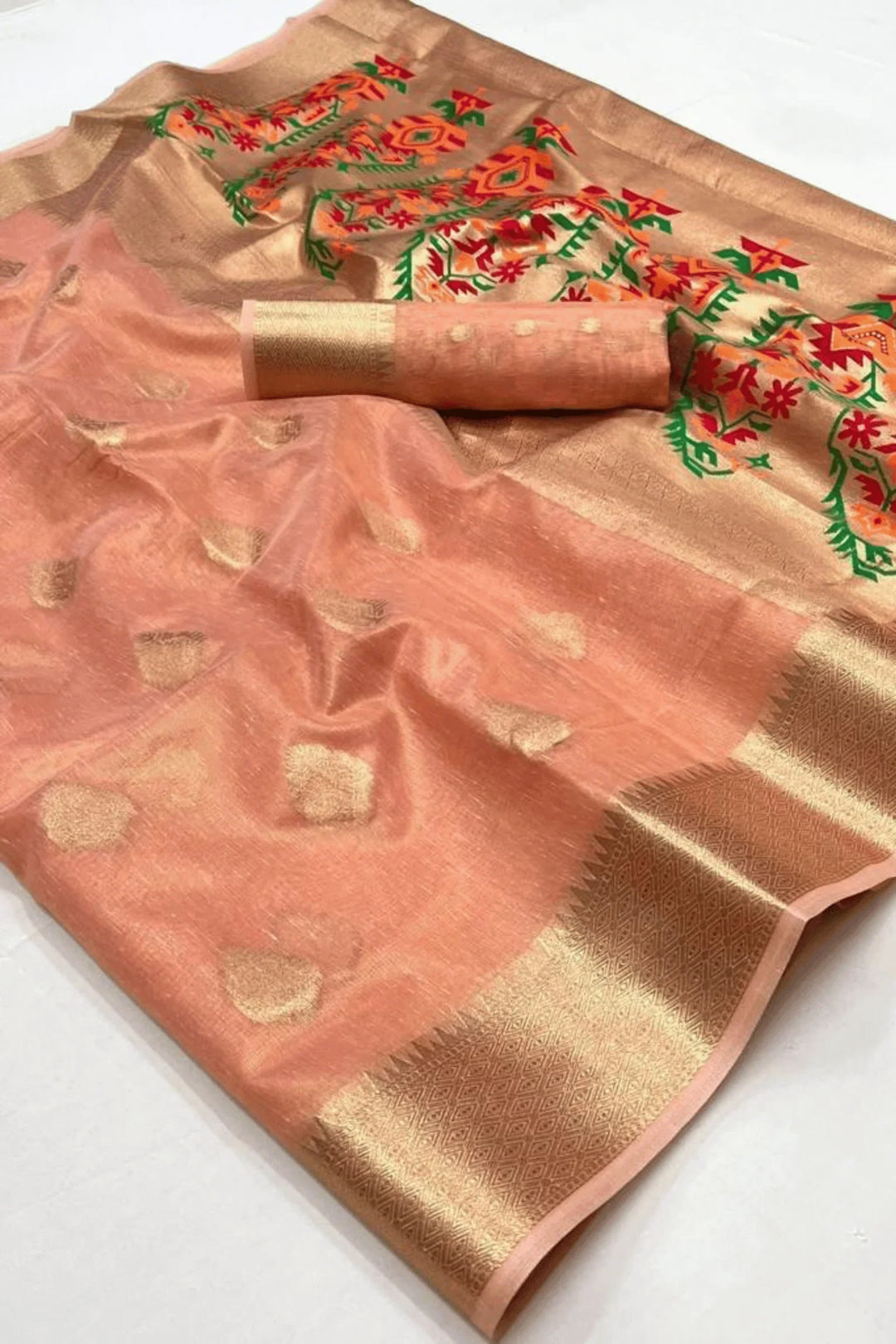 Introducing the Glamwiz Ready to Wear Paithani Saree, a perfect blend of tradition and convenience.The soft silk saree comes along with tone-to-tone matching blouse. A ready to wear saree with stitched waist pleats.The hooks do NOT show up as they are practically invisible. Just wear a petticoat /pant/skirt and you are ready to drape it! Fits from 28" waist upto 42" waist.