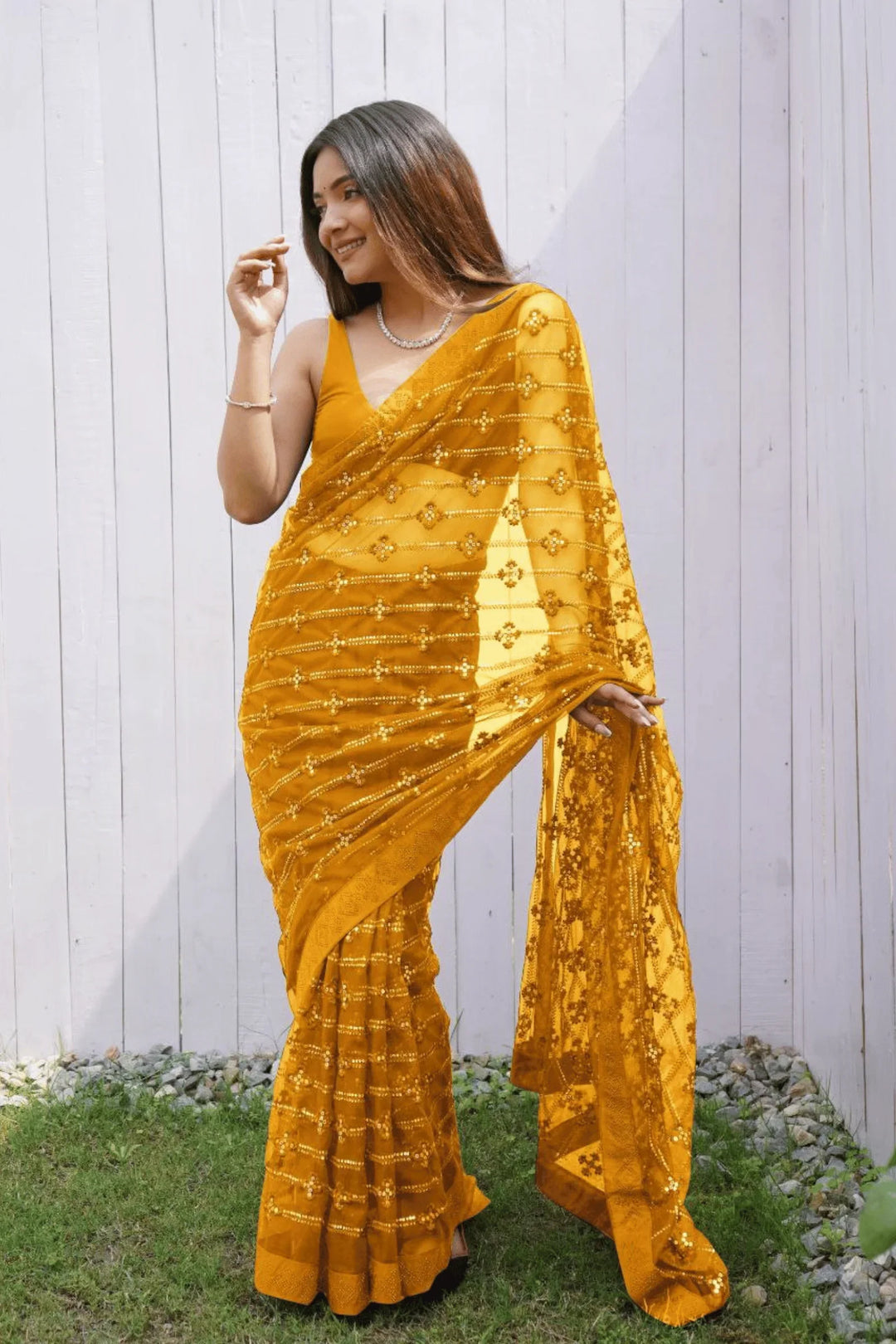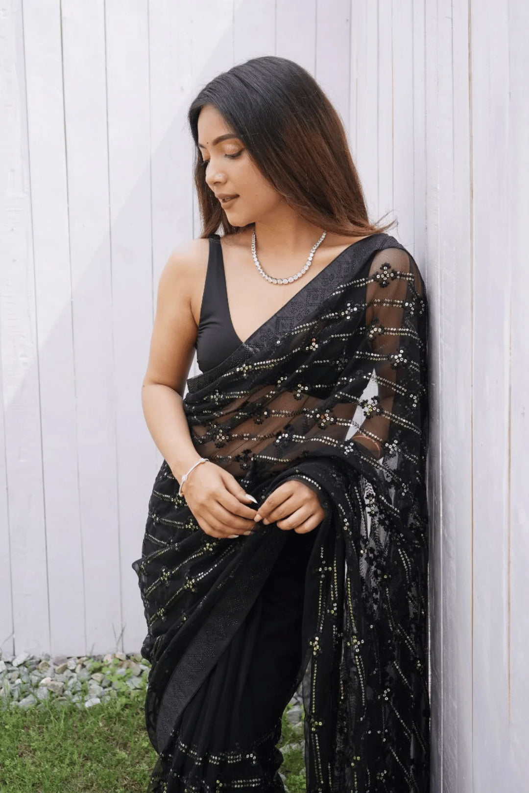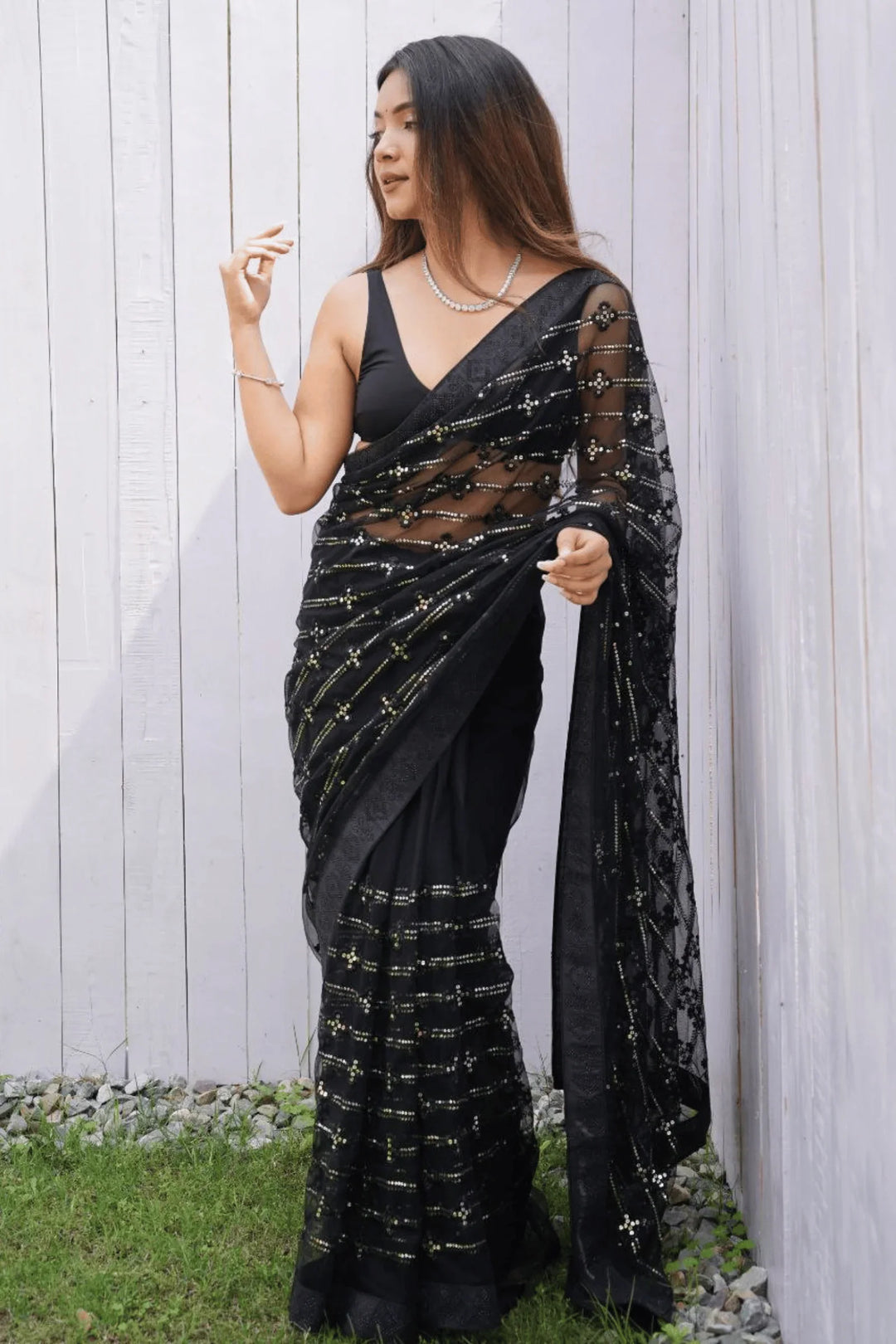 Introducing Glamwiz Ready To Wear Sequin Work Net Saree. Step into the world of elegance with our beautiful Butterfly net sarees, meticulously crafted with exquisite embroidery work and stunning cutwork borders.