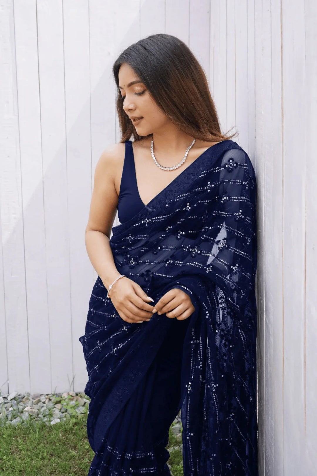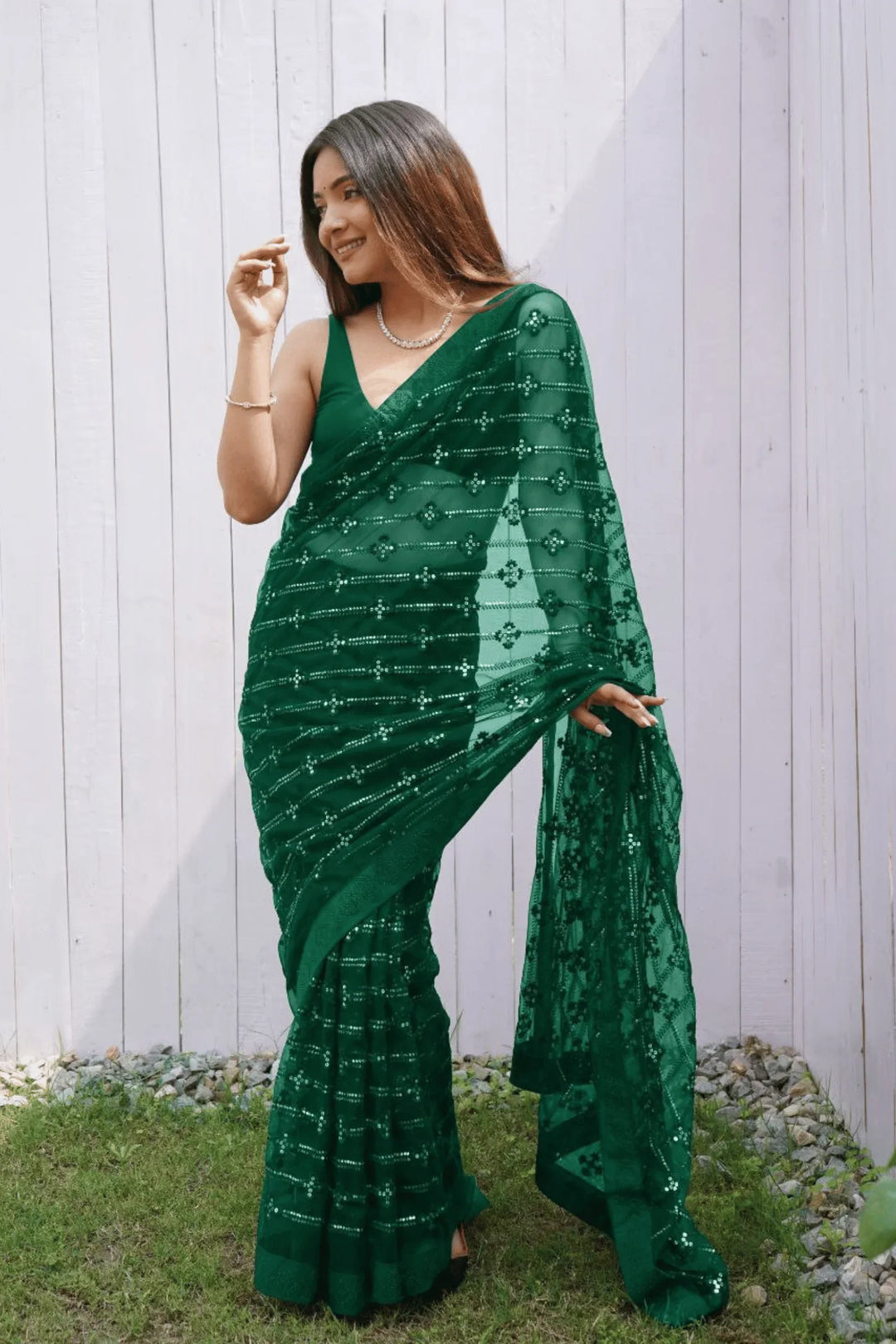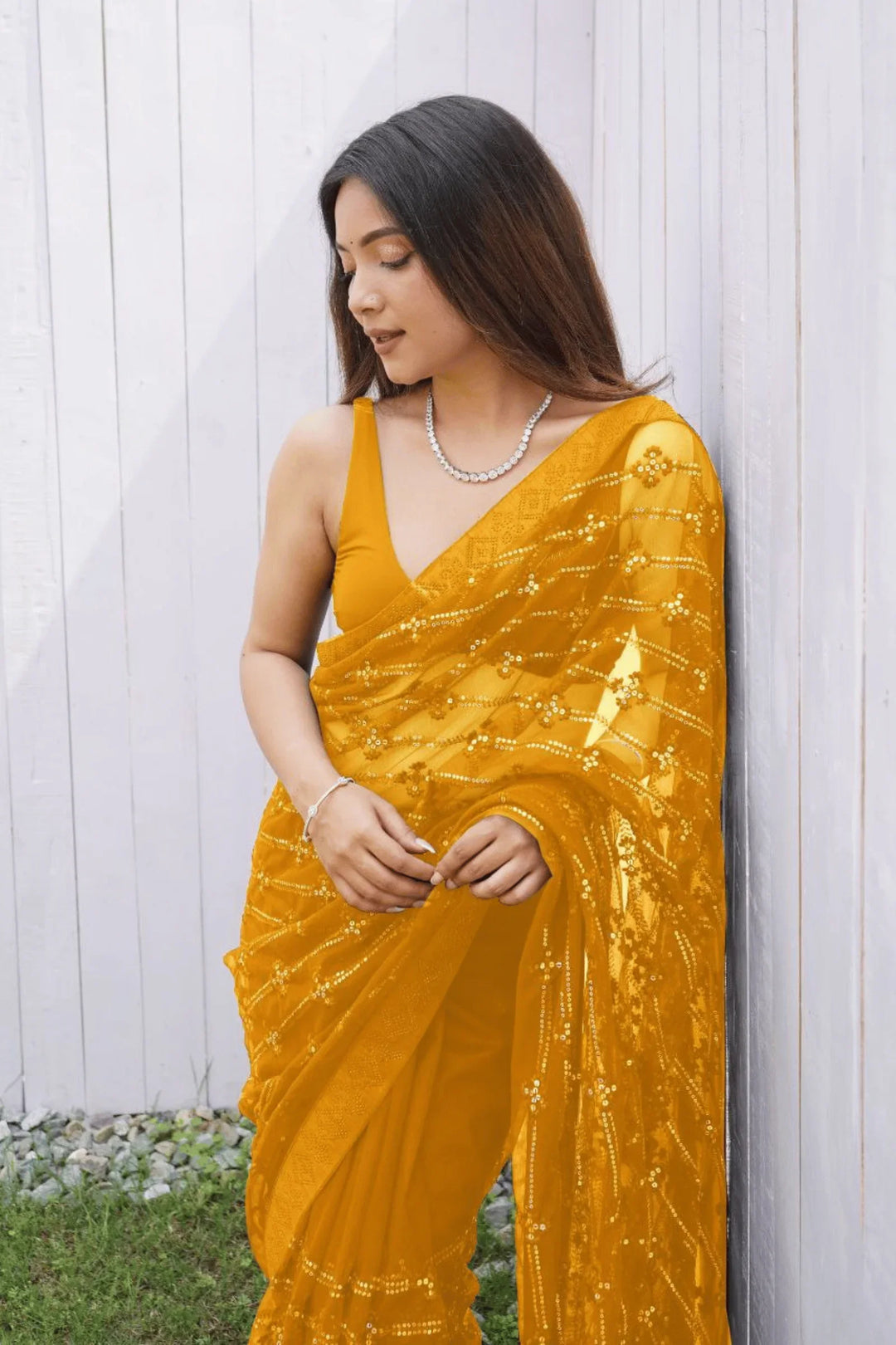 Introducing Glamwiz Ready To Wear Sequin Work Net Saree. Step into the world of elegance with our beautiful Butterfly net sarees, meticulously crafted with exquisite embroidery work and stunning cutwork borders.