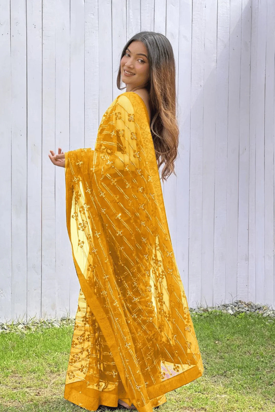 I'm so impressed with the quality of this saree! The sequin work and net fabric are exceptional.