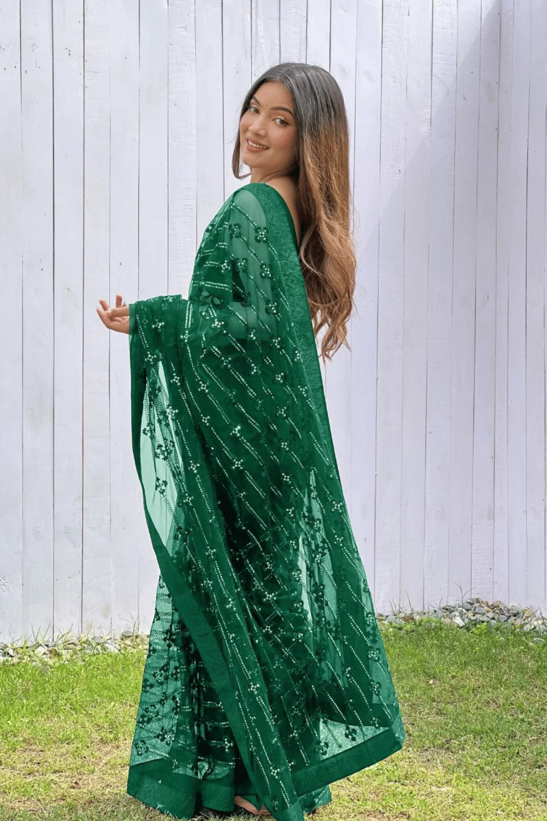This saree is perfect for party wear! The sequin work and net fabric make it a showstopper.