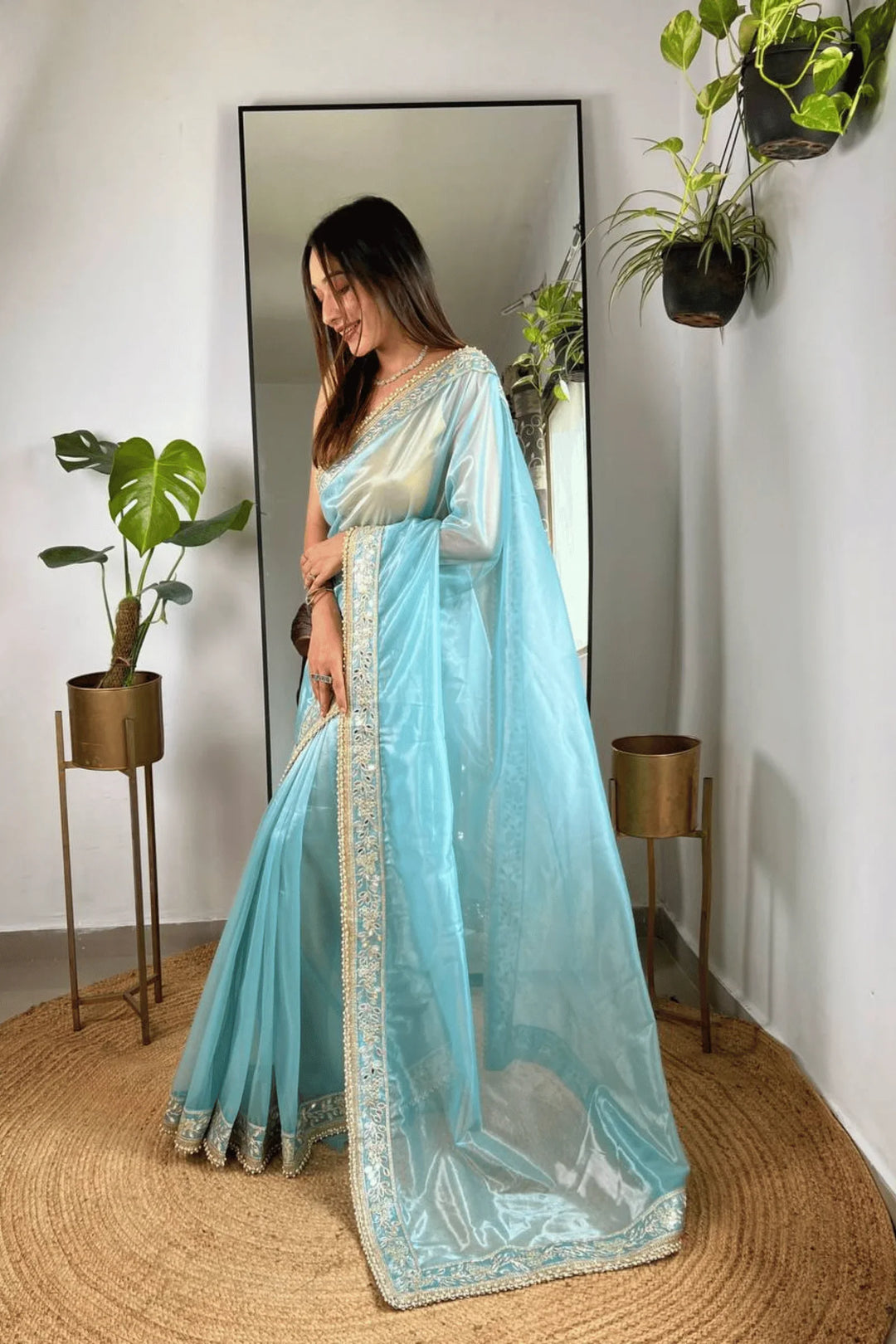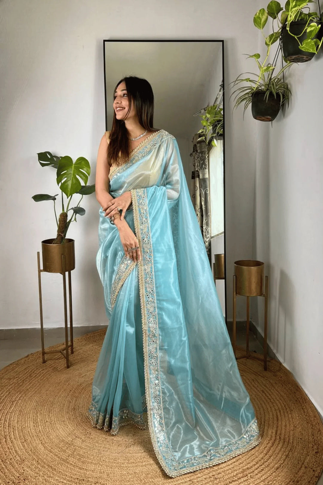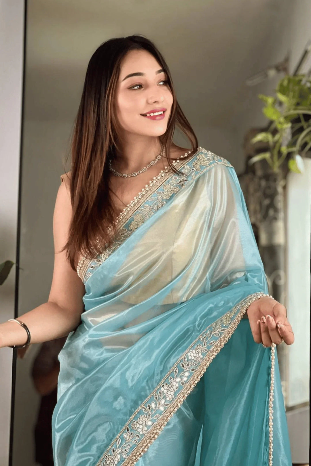Absolutely loved this saree! The silver tissue fabric has the perfect amount of shimmer without being too flashy. It drapes beautifully and is super easy to wear. Perfect for evening events!