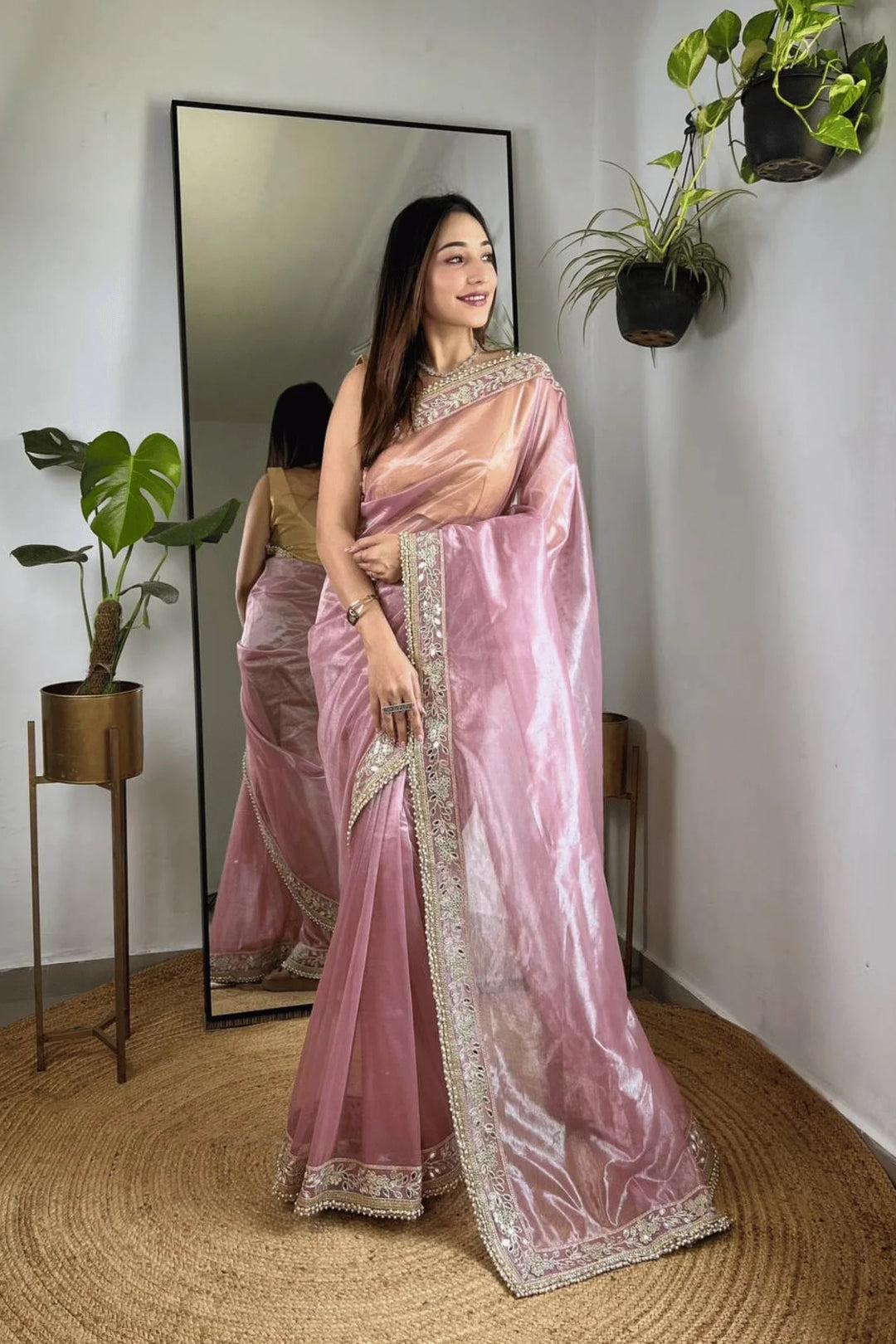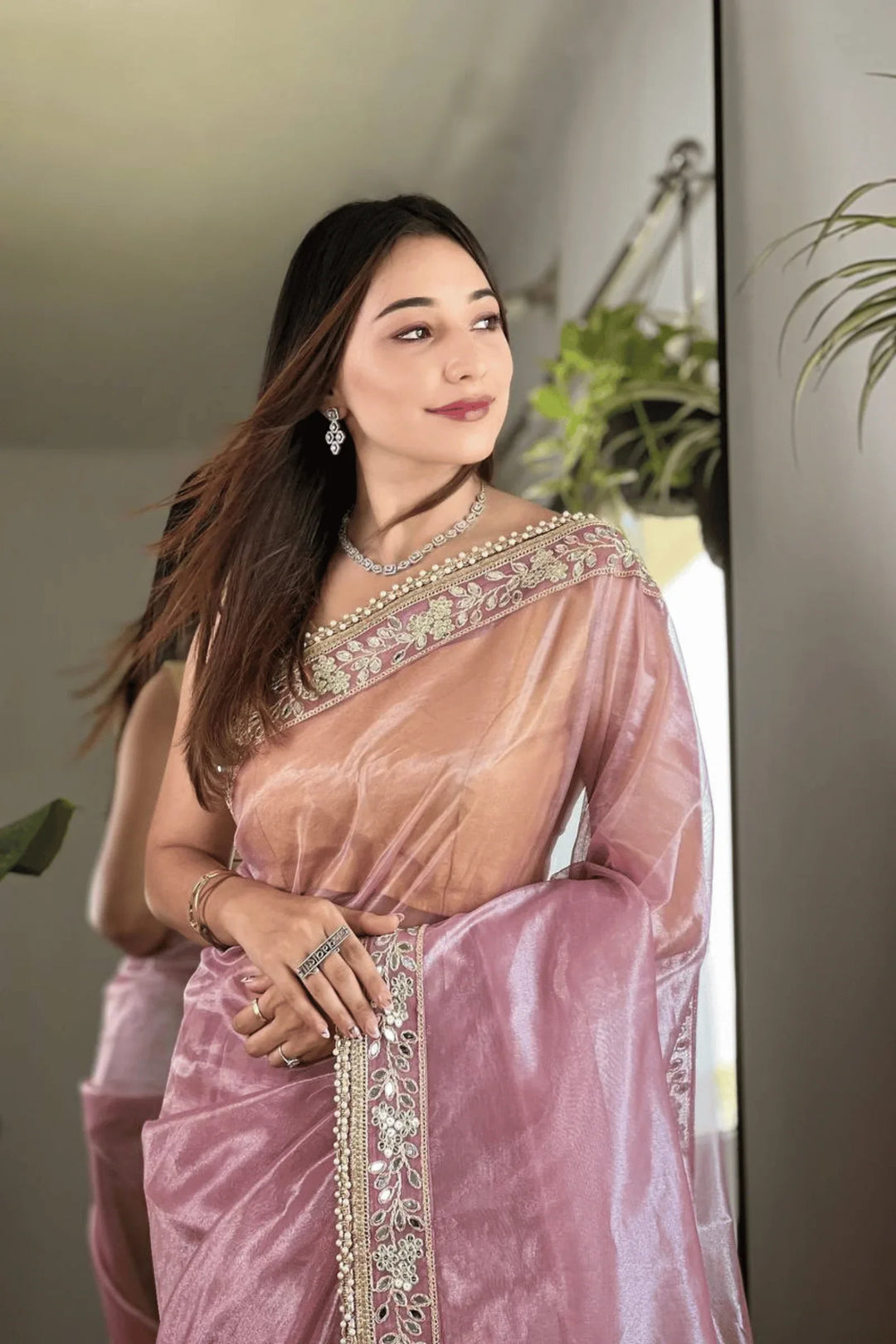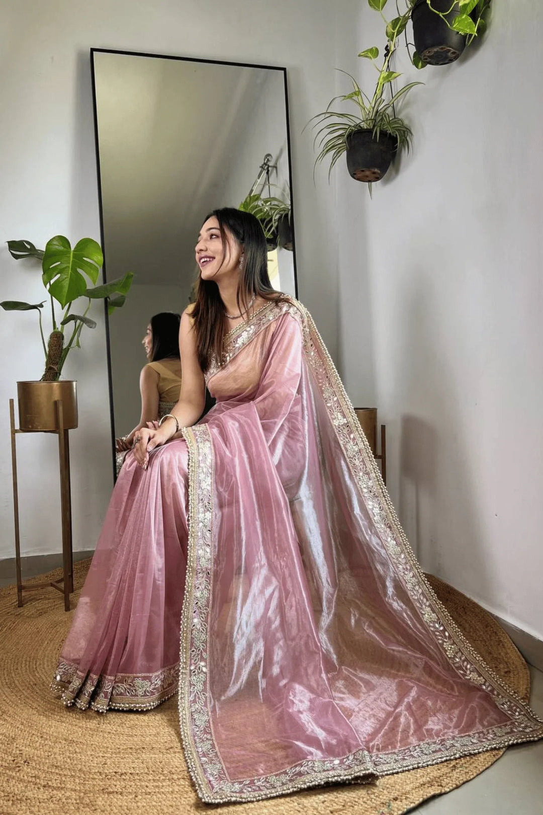Absolutely loved this saree! The silver tissue fabric has the perfect amount of shimmer without being too flashy. It drapes beautifully and is super easy to wear. Perfect for evening events!