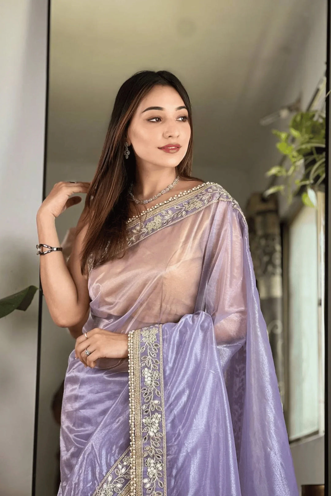The Lavender color is so unique and dreamy! It has a soft glow, and the saree drapes like a dream. Perfect for daytime functions or pastel-themed events. Loved it!