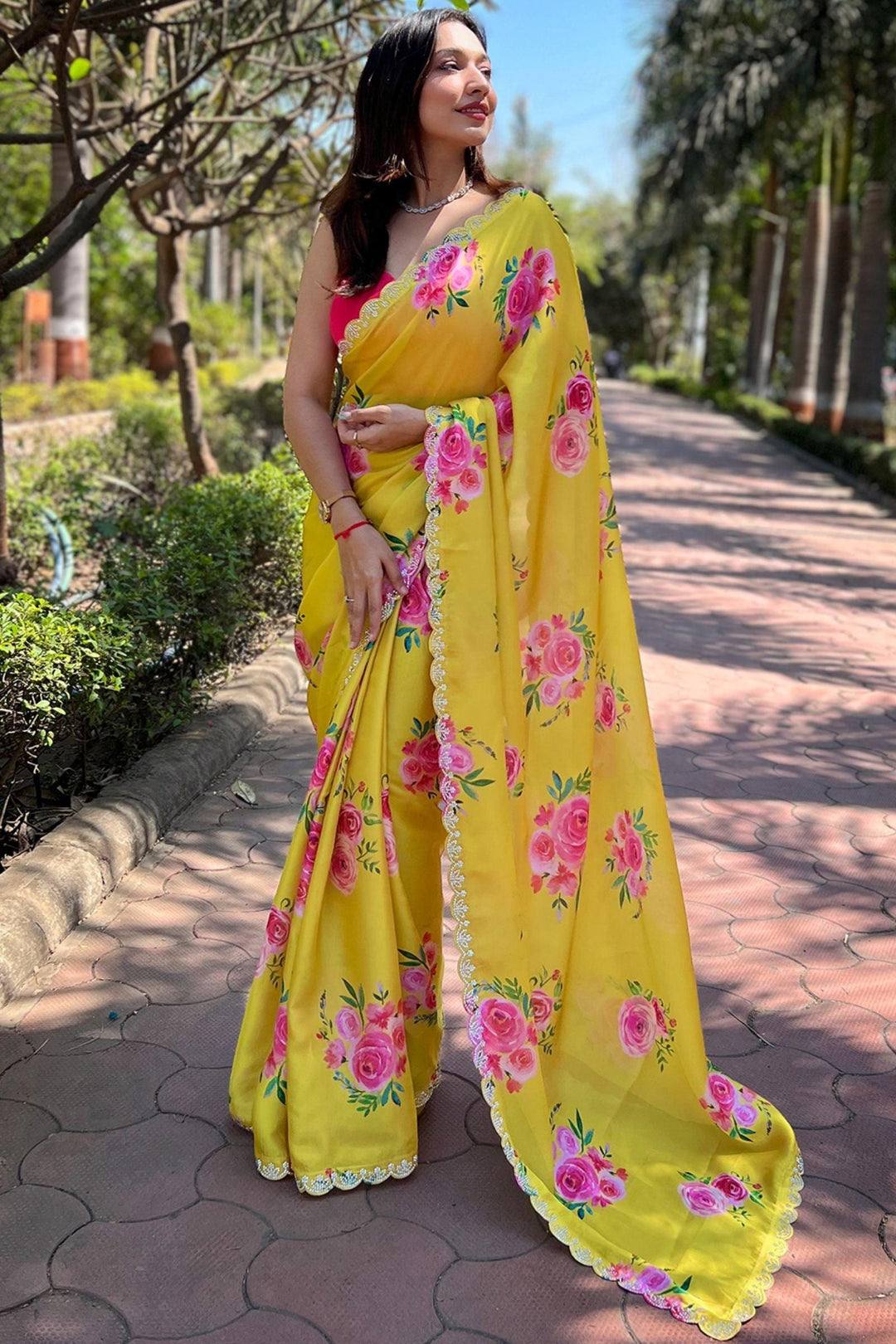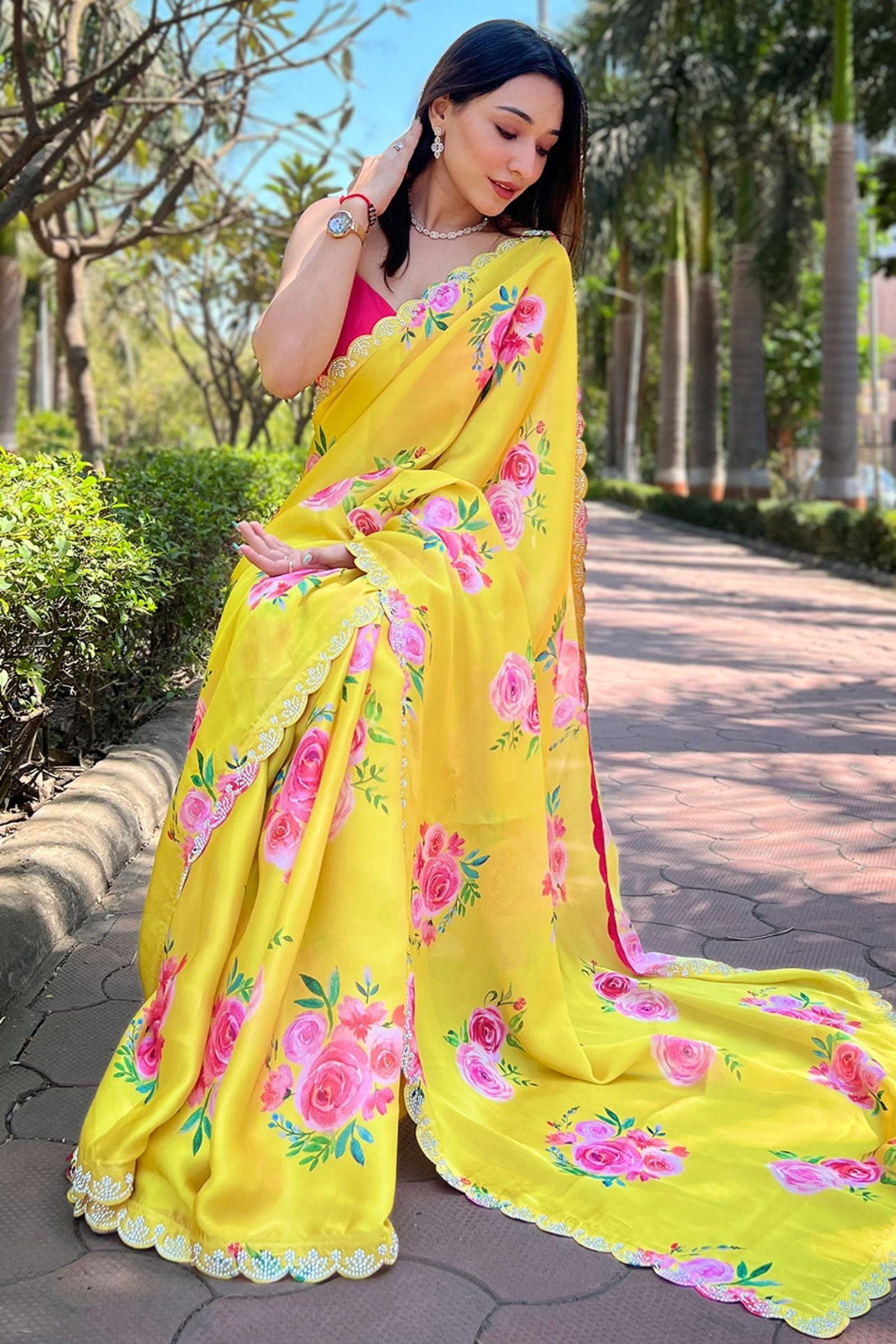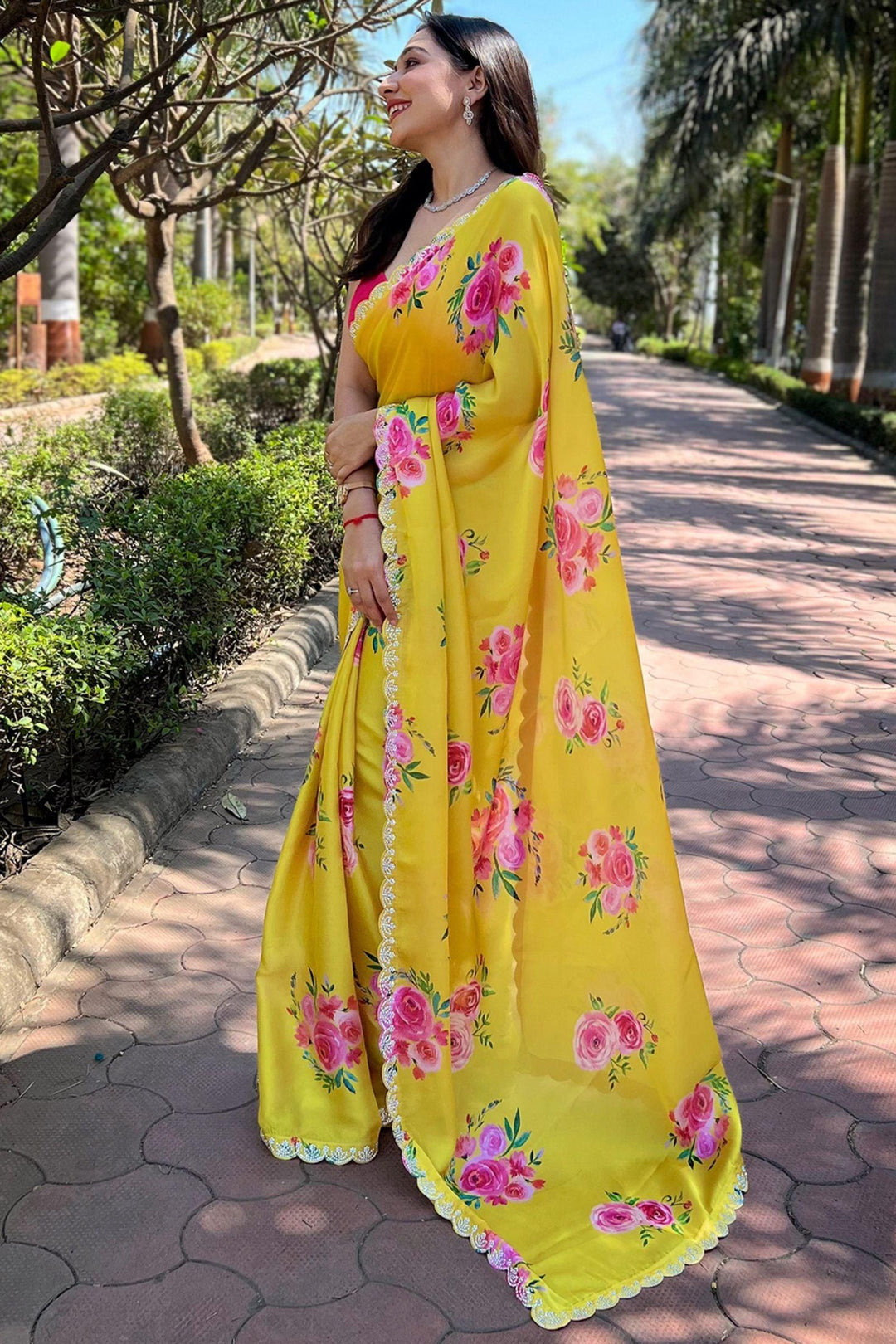 Radiate warmth and grace in our Ready To Wear Sunshine Yellow Georgette Saree, crafted from pure satin georgette with enchanting floral prints. Adorned with a gleaming zircon Swarovski border, this Glamwiz creation harmonizes tradition and convenience, promising effortless elegance for every occasion.