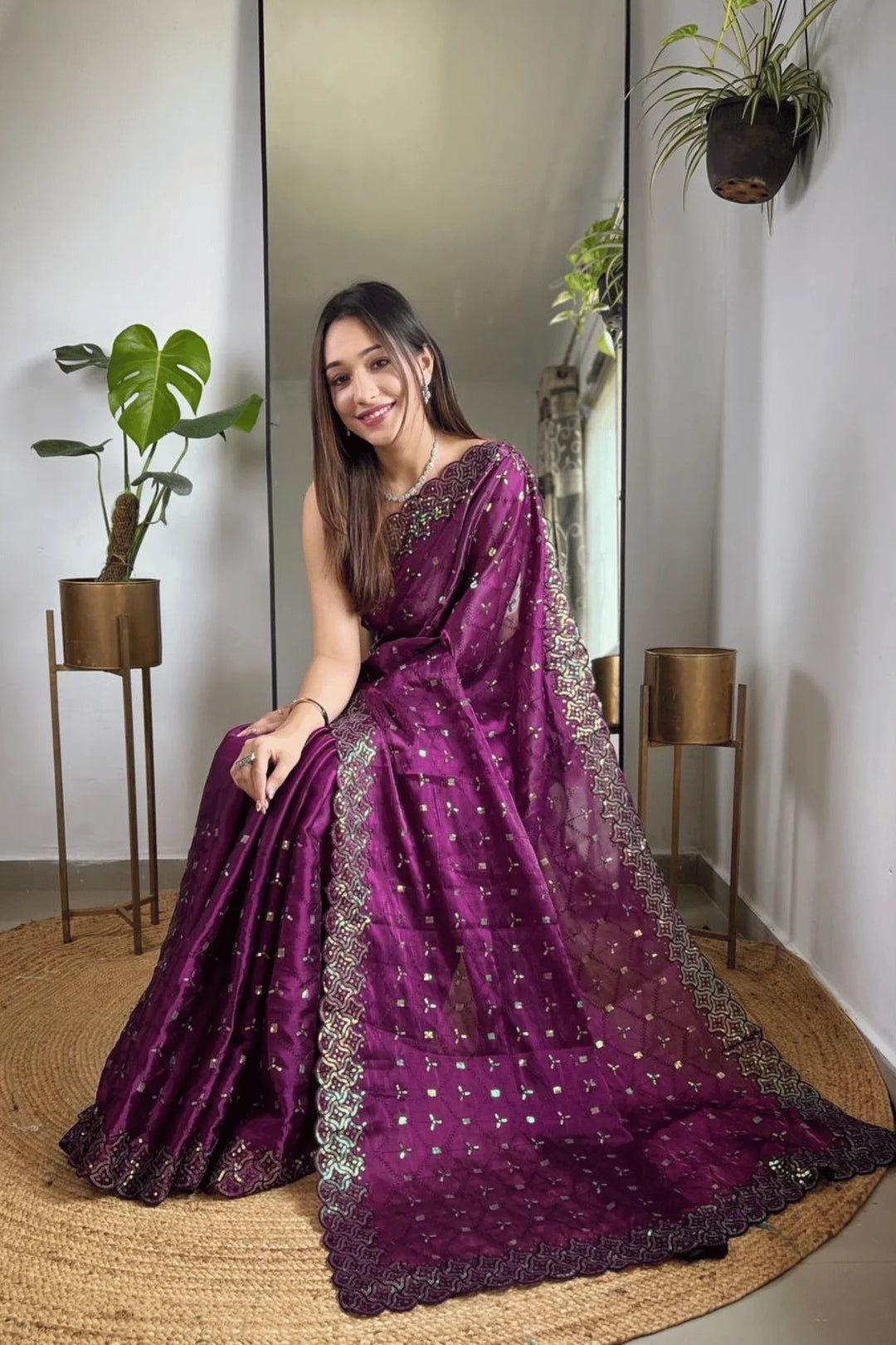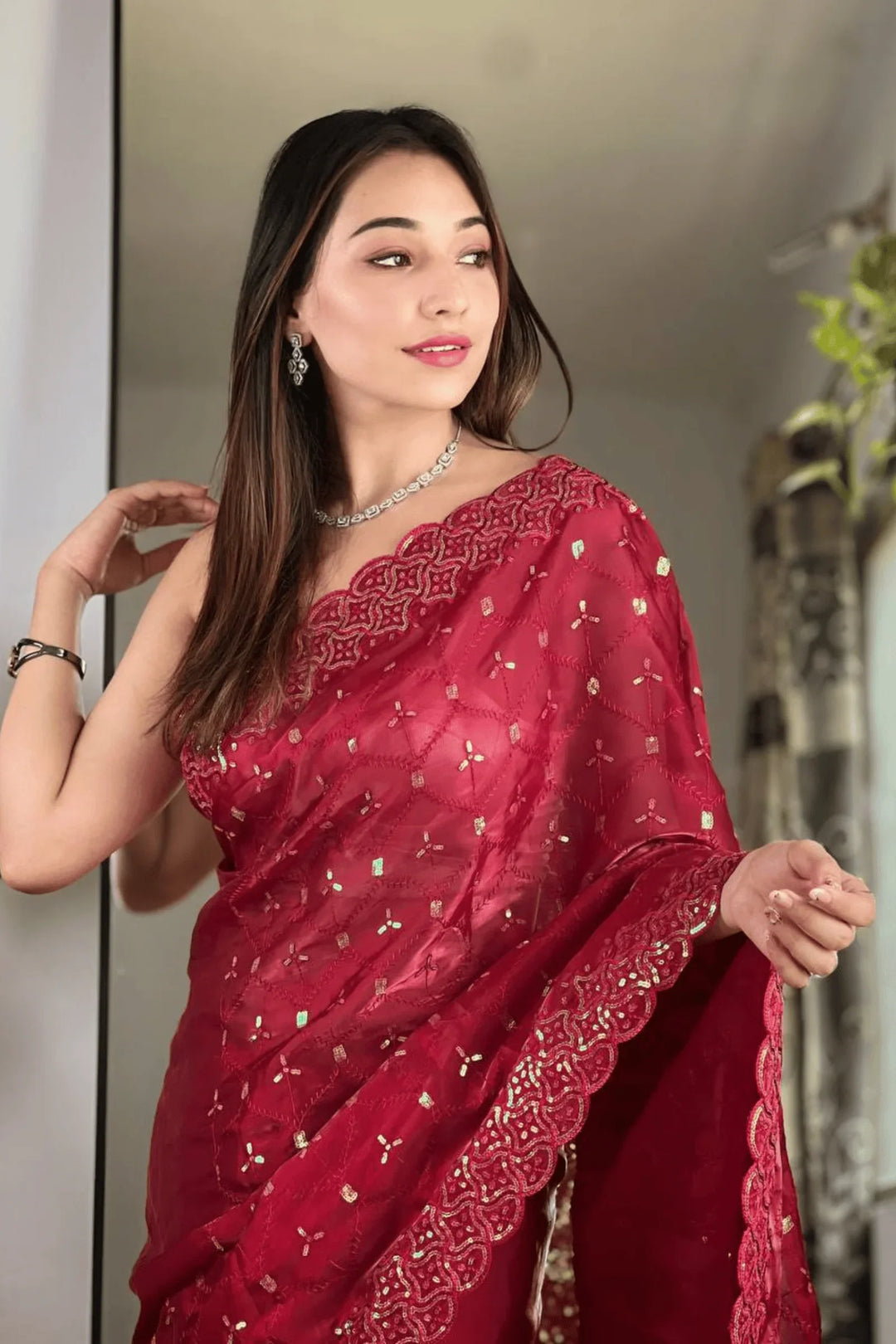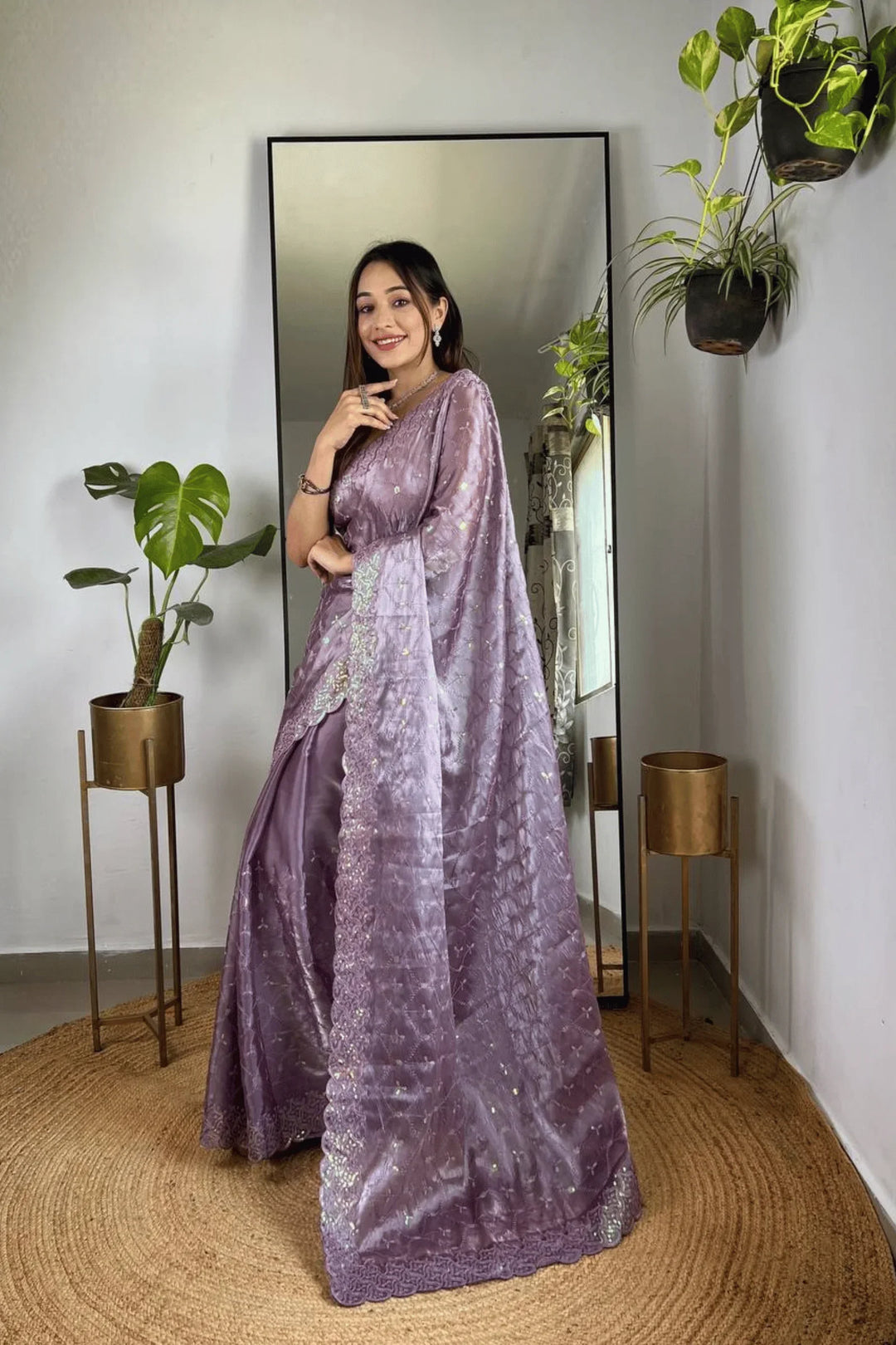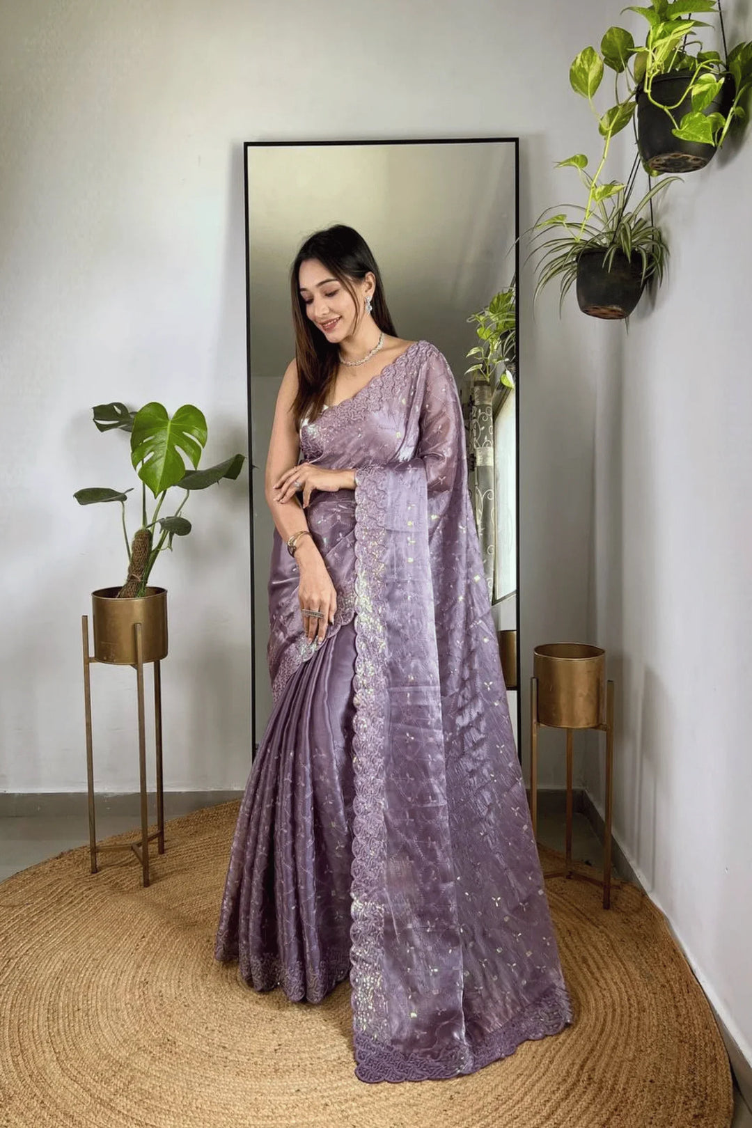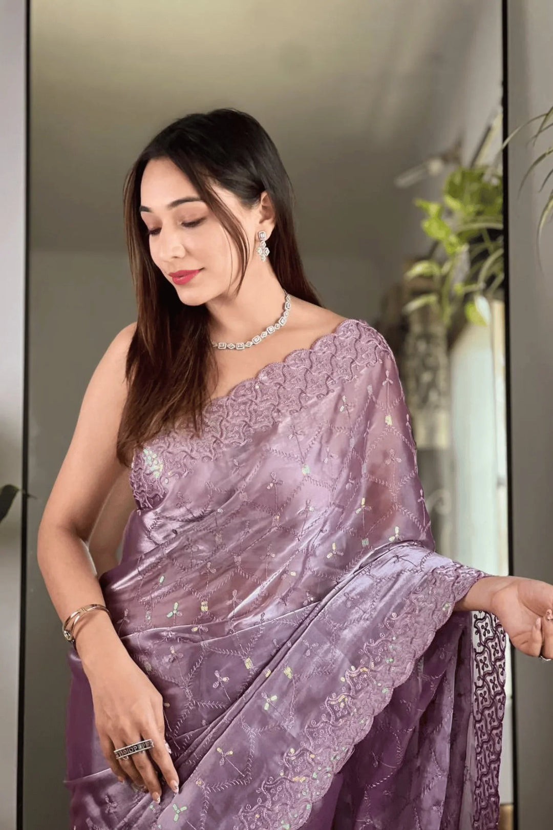 Indulge in the ethereal beauty of the Ready to Wear Thread Embroidered Jimmy Choo Saree, a perfect saree for Diwali or wedding season. The saree's rich hue evokes a sense of mystery and romance, making it perfect for evening wear. This ready-to-wear saree come along with unstitched blouse 1 mtr.