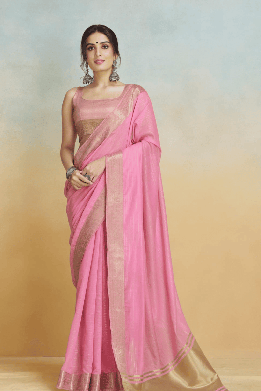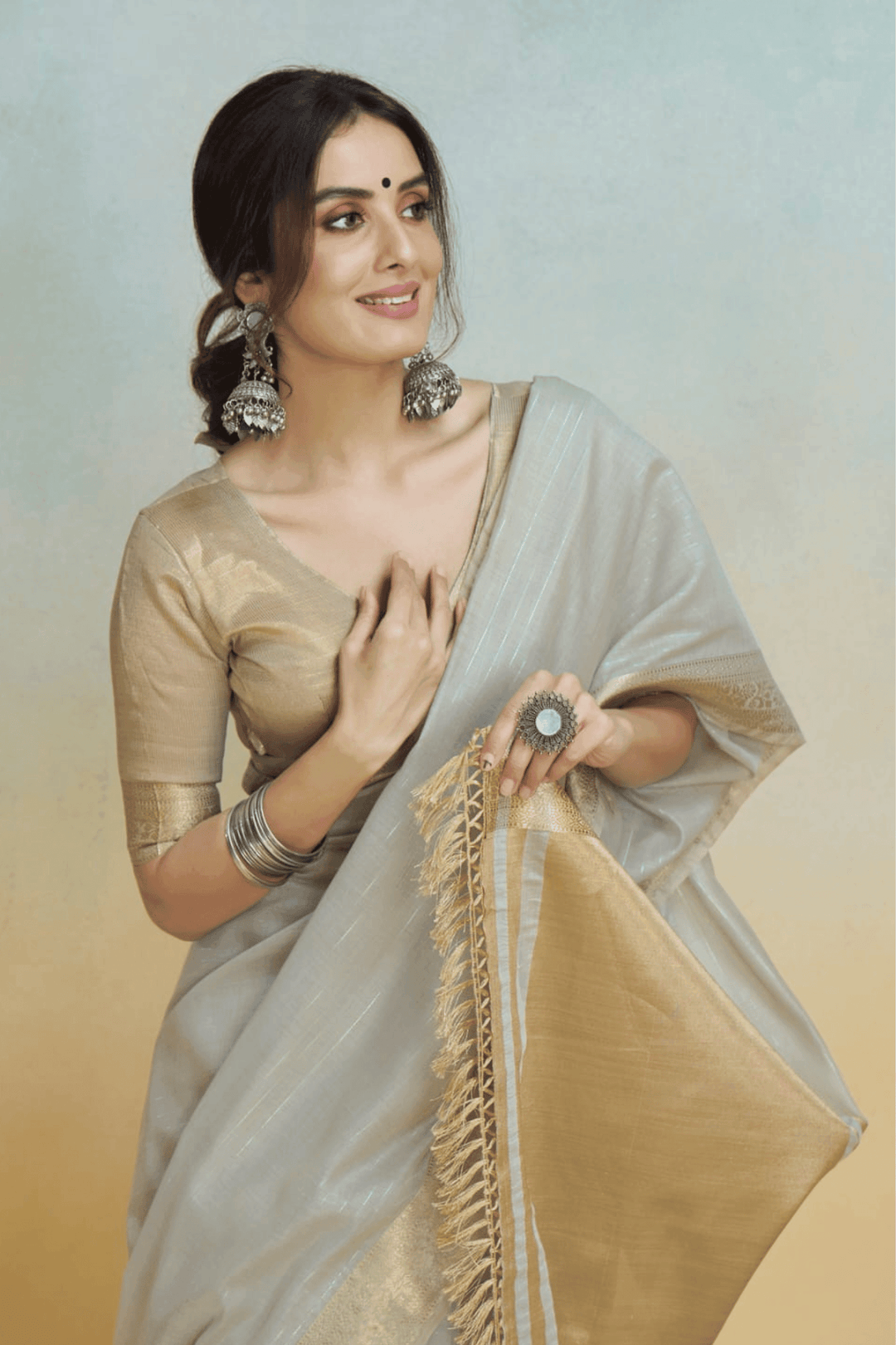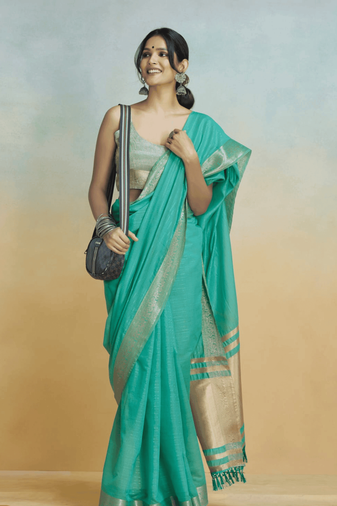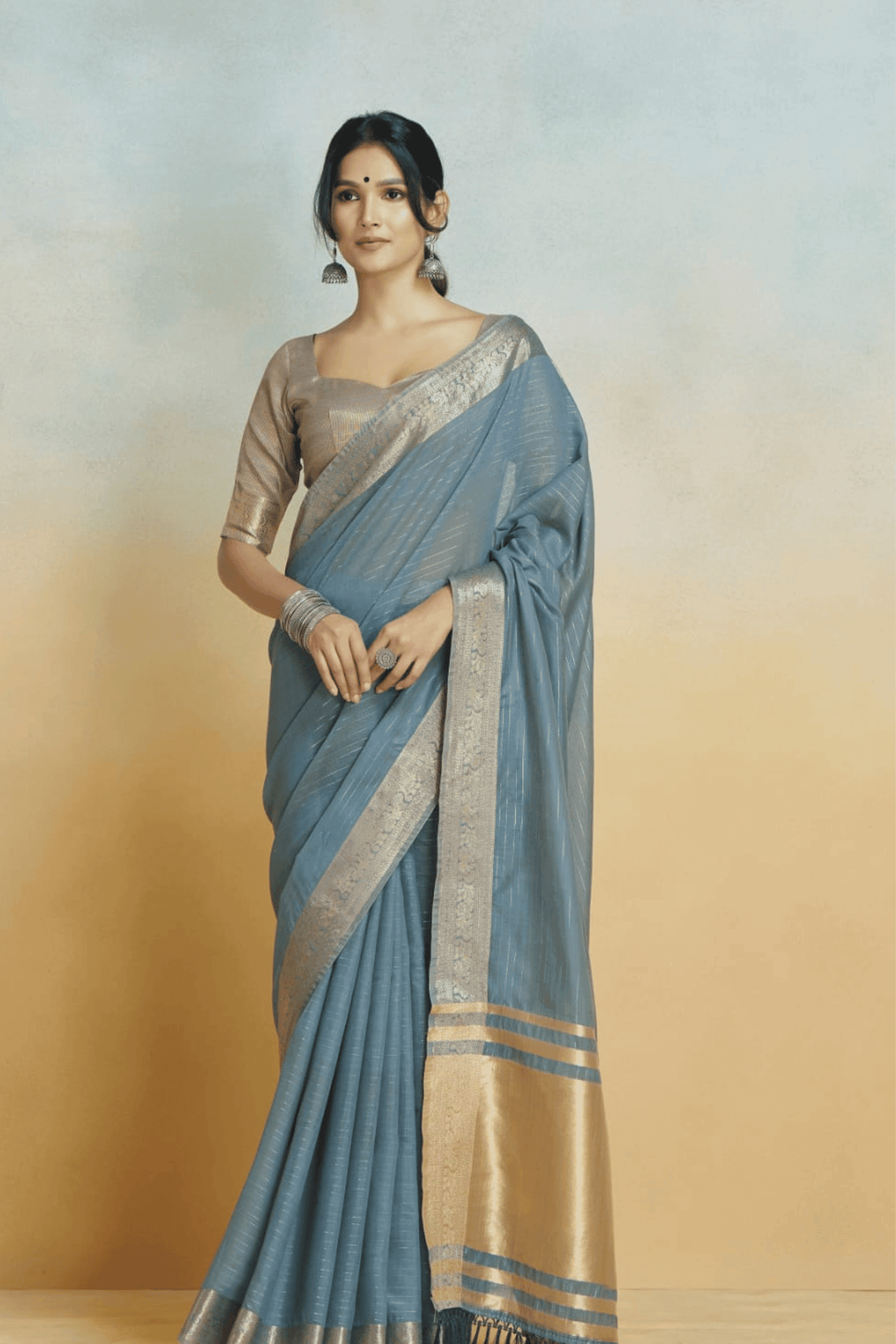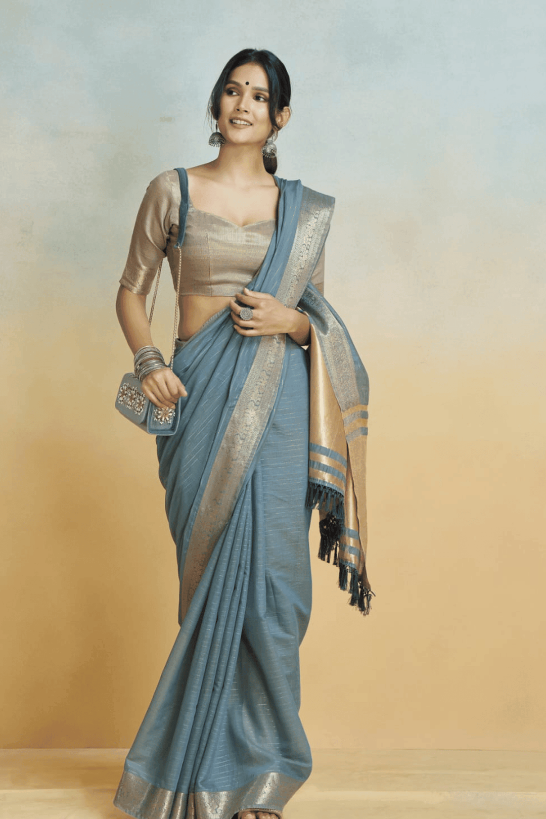 Introducing our Ready to Wear Zari Stripes Raw Silk Saree, woven with zari stripes across the saree. You can easily drape this saree without any hassle as it comes ready-to-wear with a pre-stitched pleats. Ready to wear saree with 1 mtr blouse.