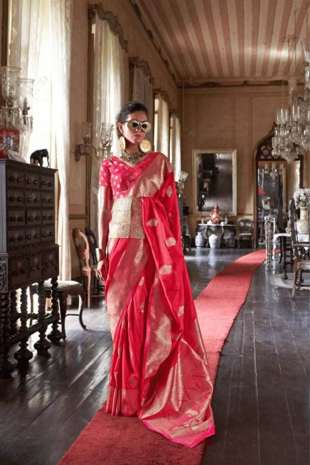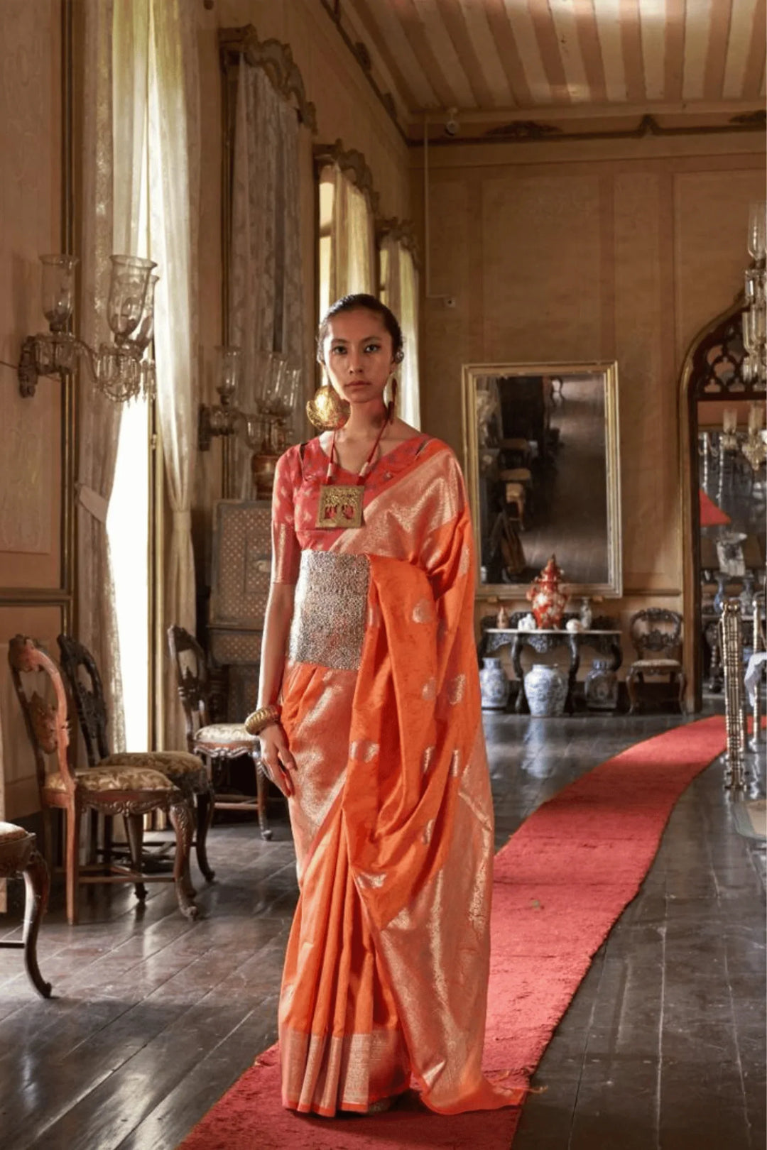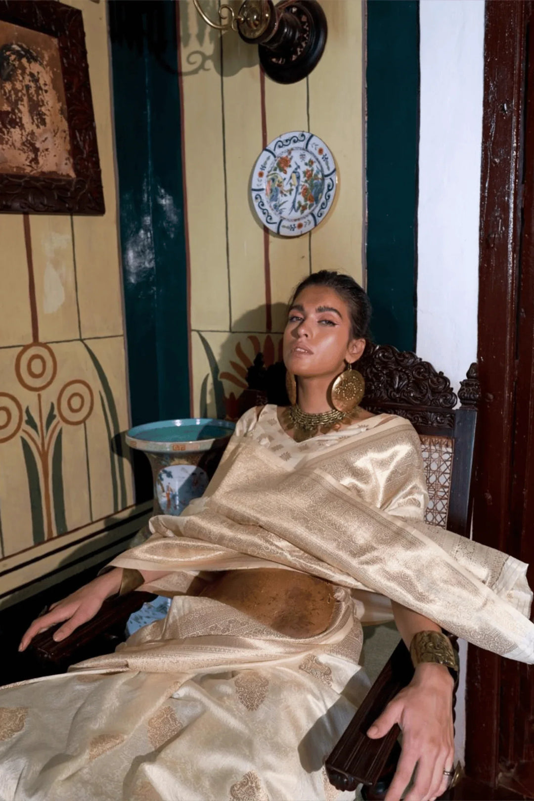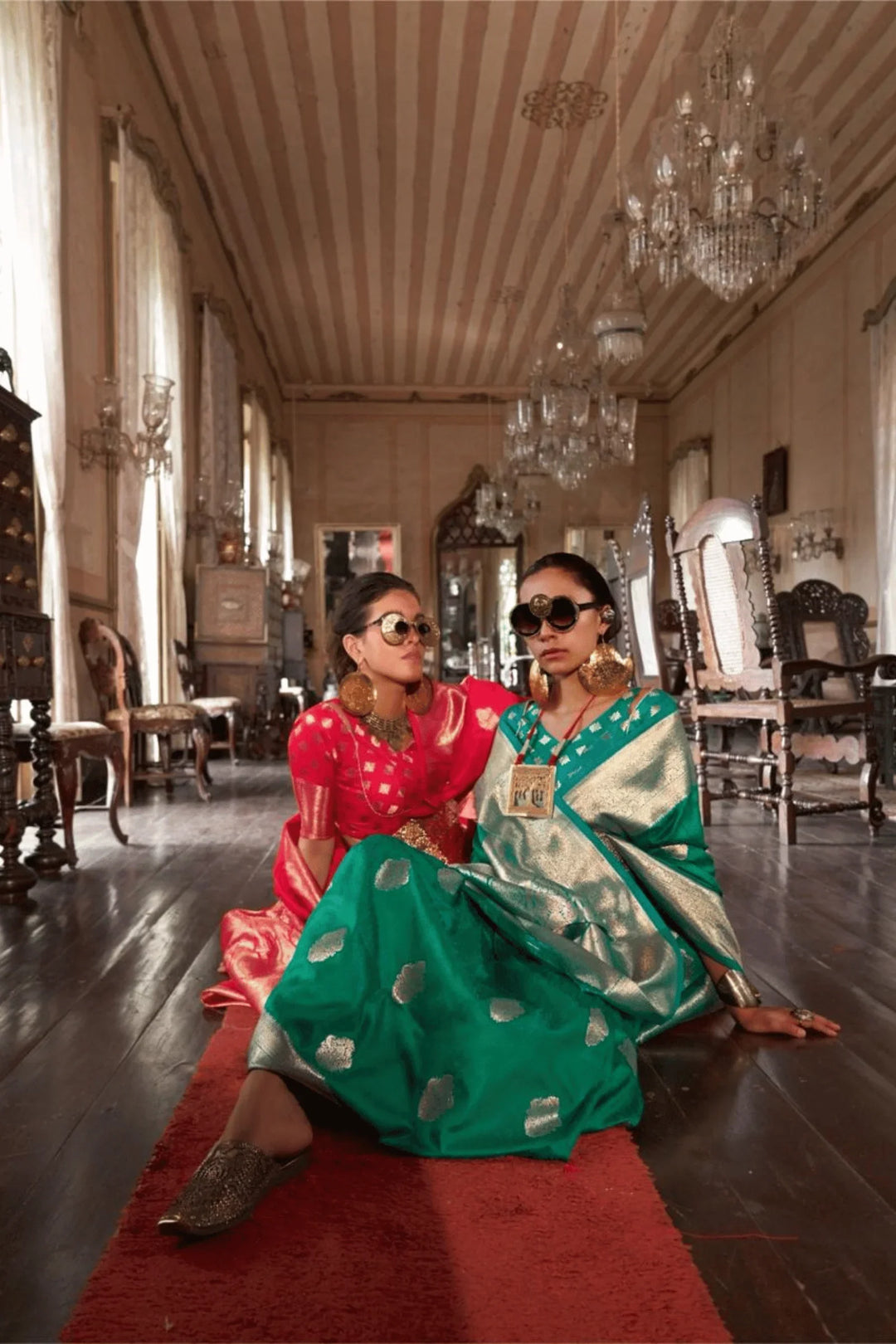 Drape yourself in the elegance of a Regal Resham— a pre-stitched Banarasi saree with brocade blouse kissed with golden zari. This saree is a perfect blend of traditional craftsmanship and modern ease, designed for the woman who owns every room she walks into.