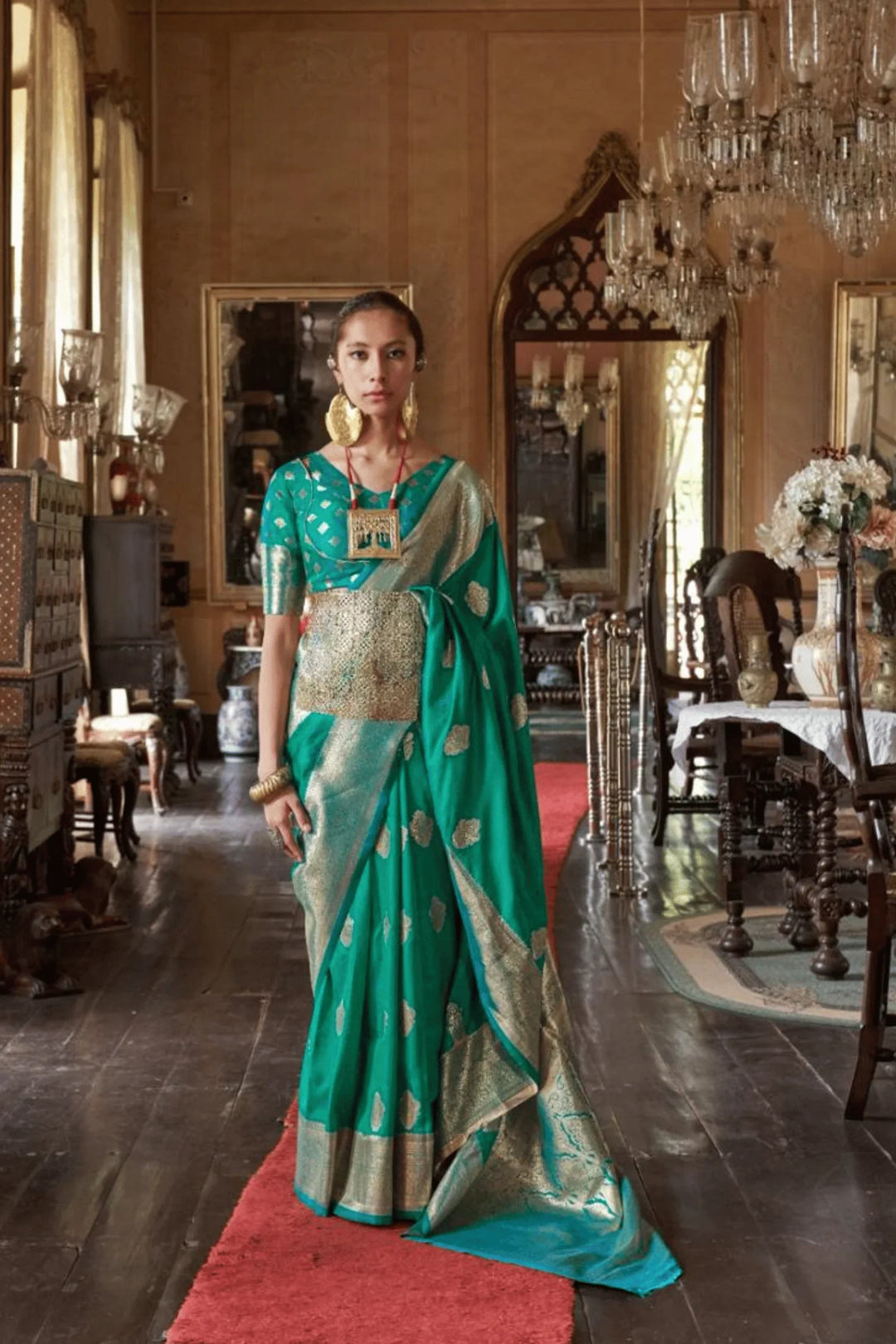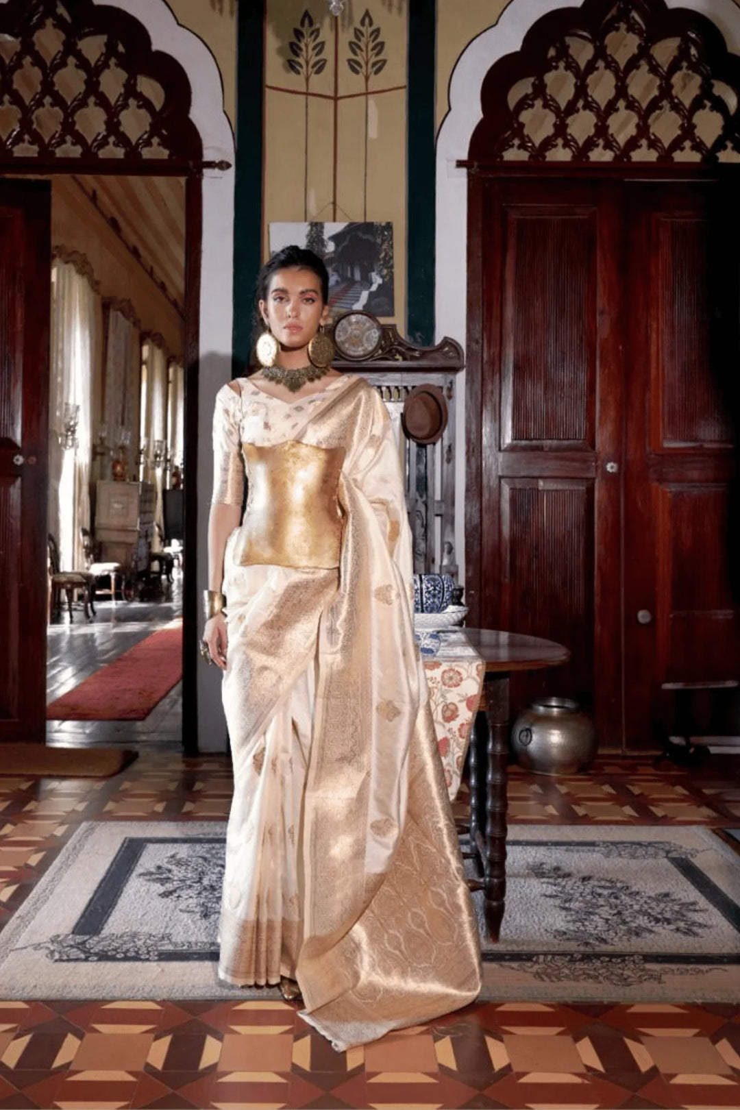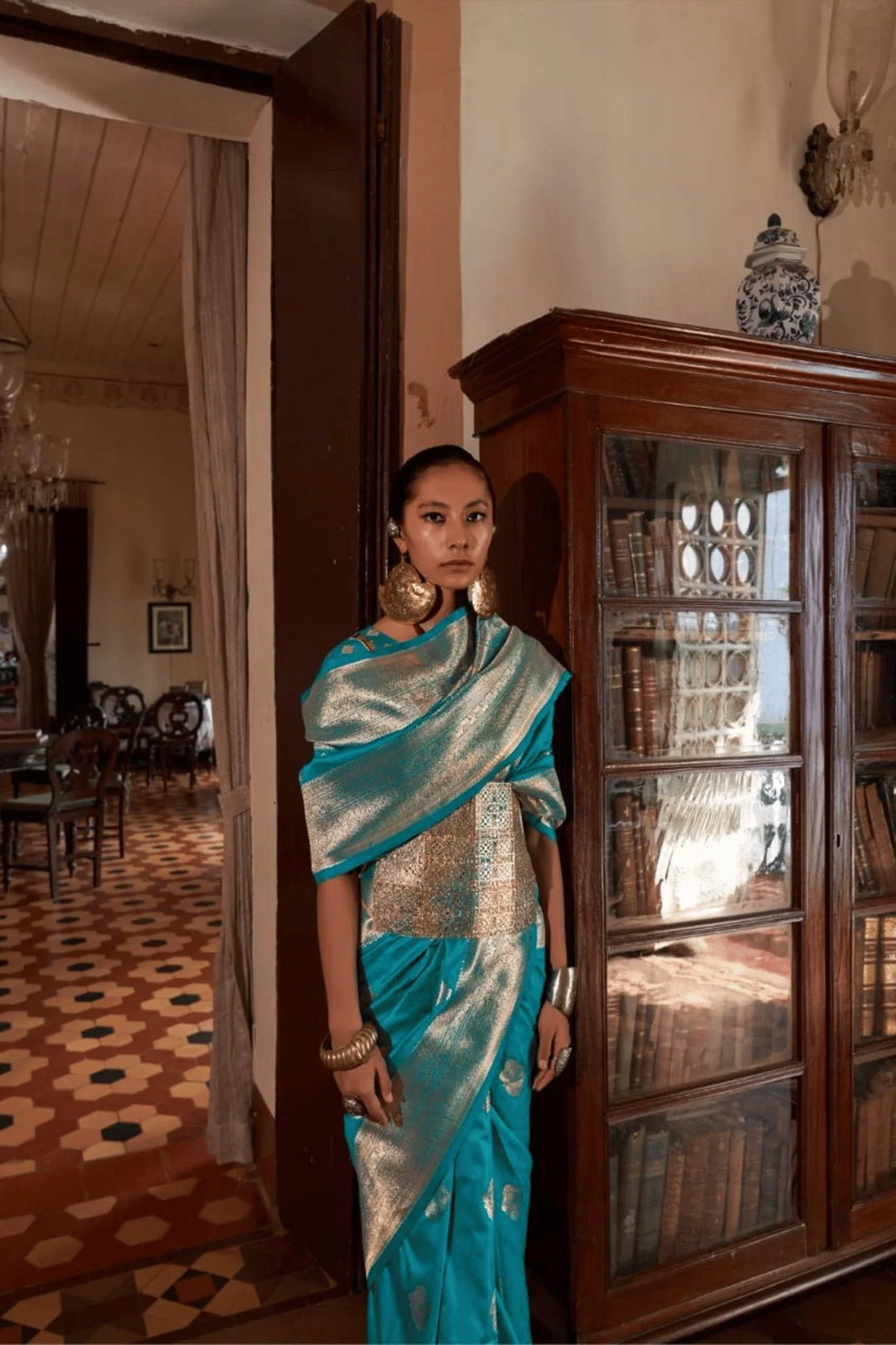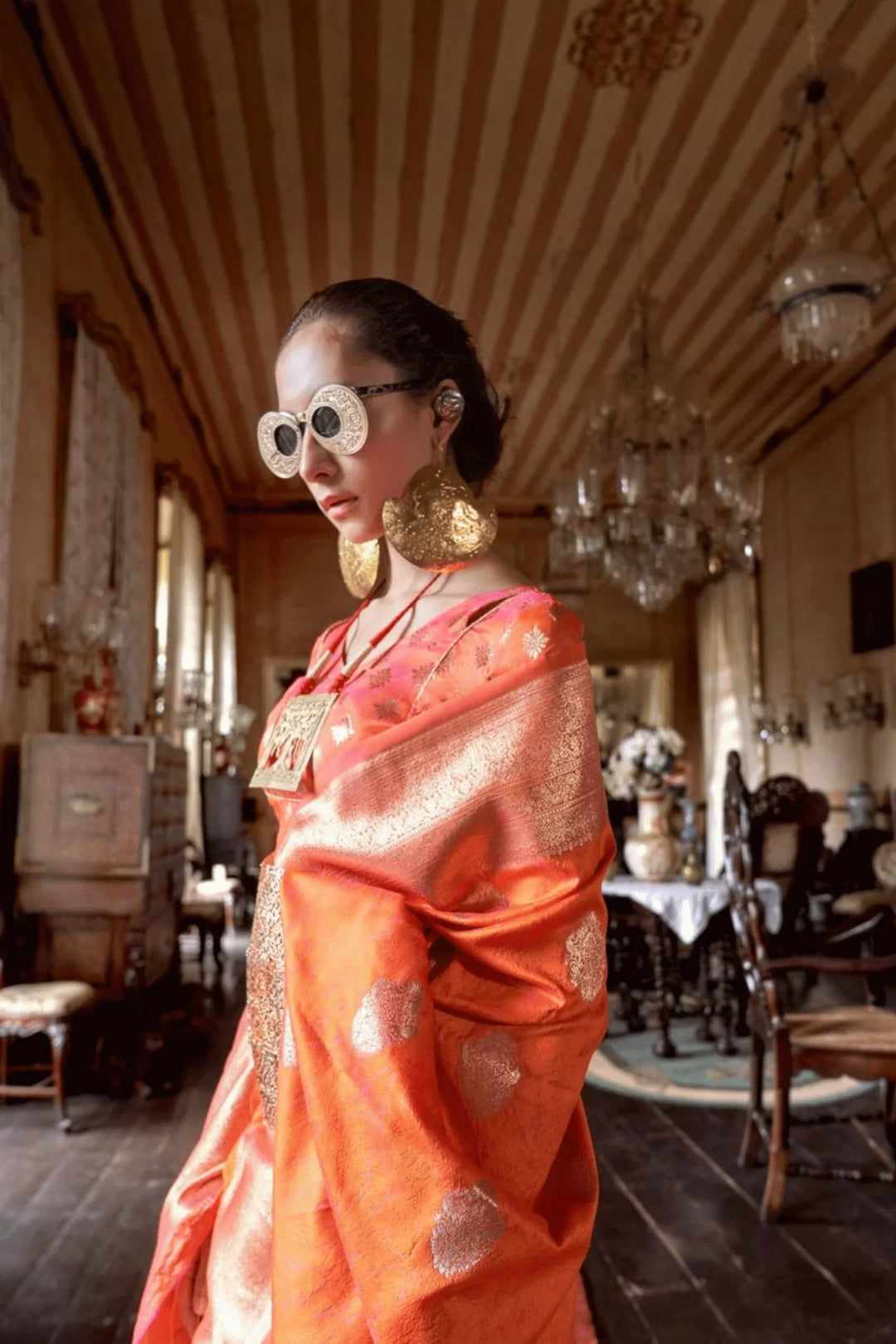 Drape yourself in the elegance of a Regal Resham— a pre-stitched Banarasi saree with brocade blouse kissed with golden zari. This saree is a perfect blend of traditional craftsmanship and modern ease, designed for the woman who owns every room she walks into.