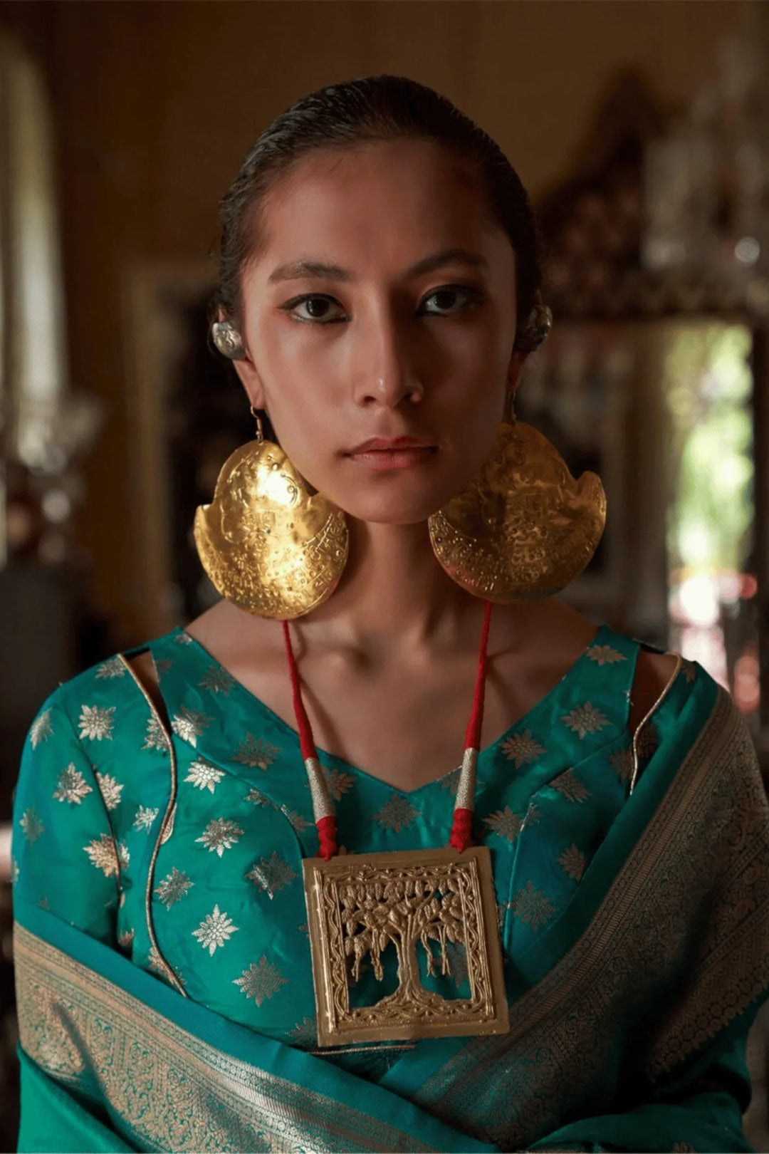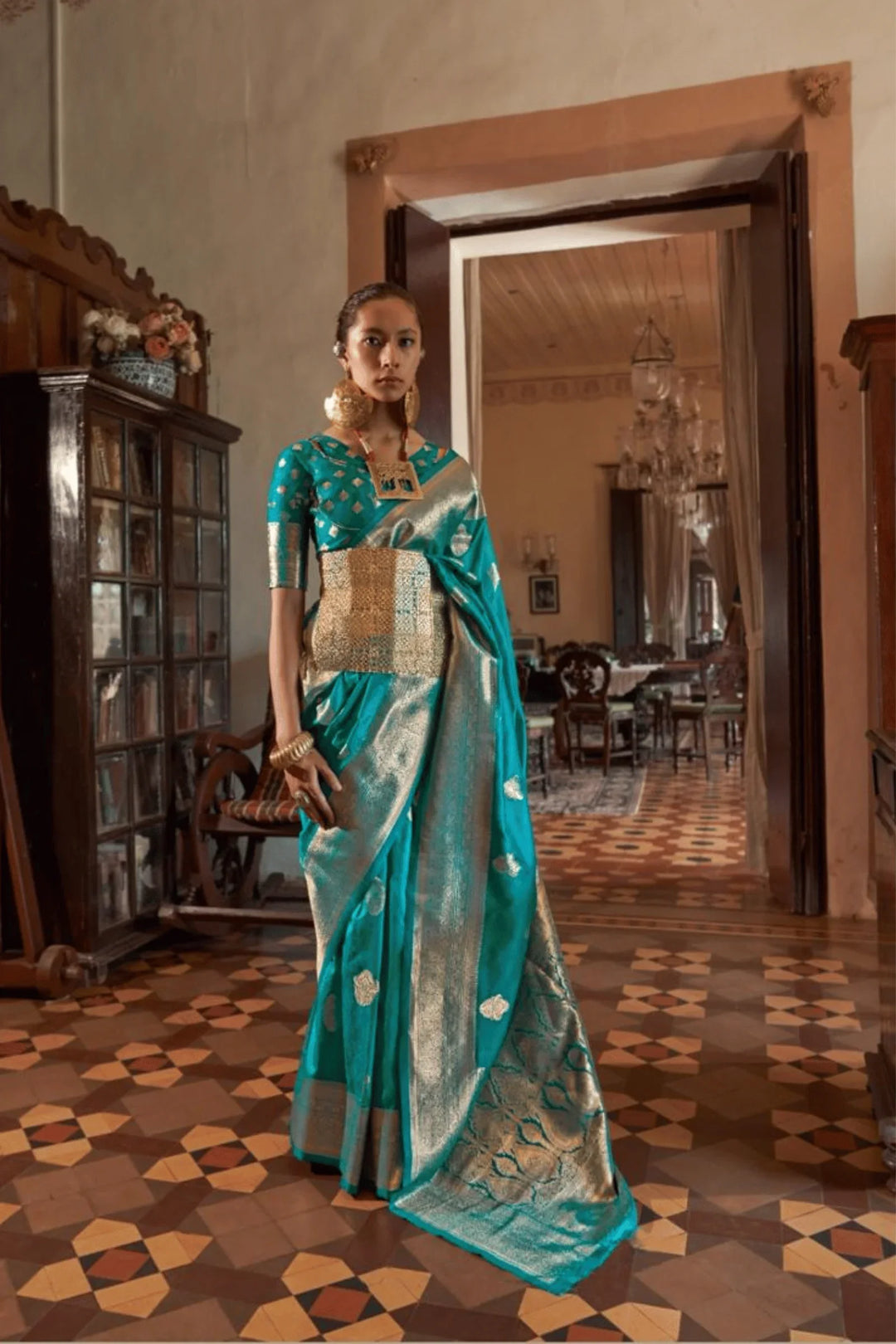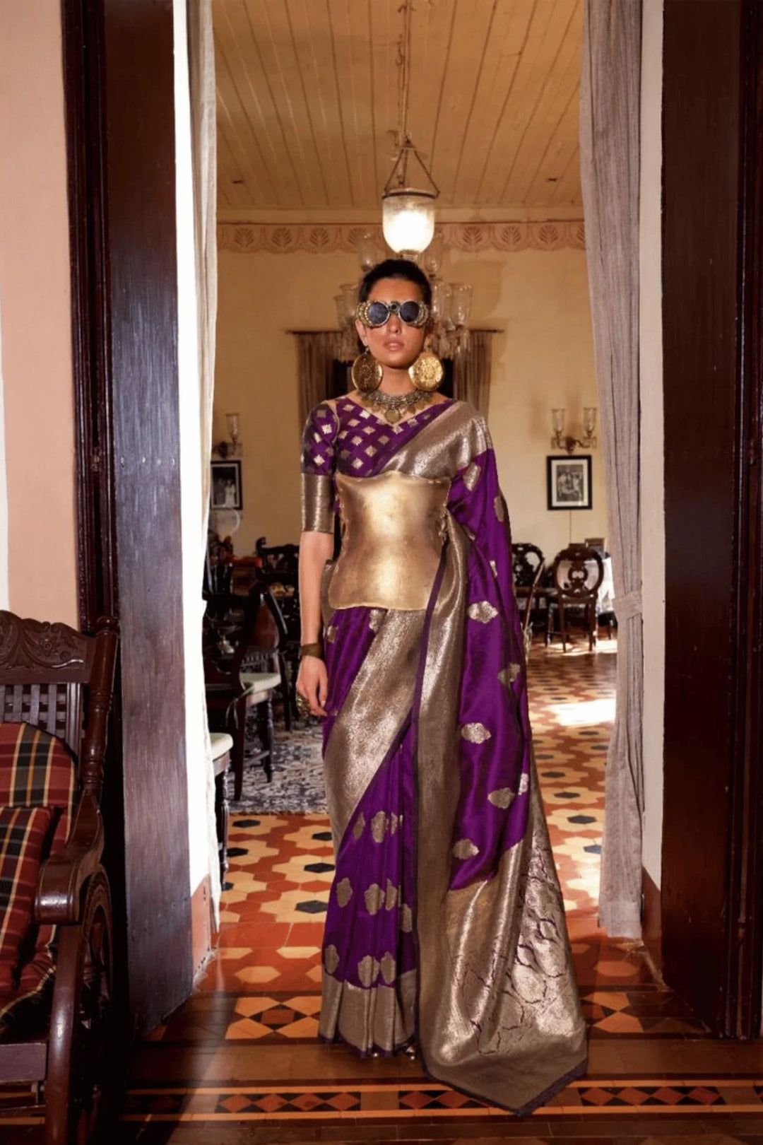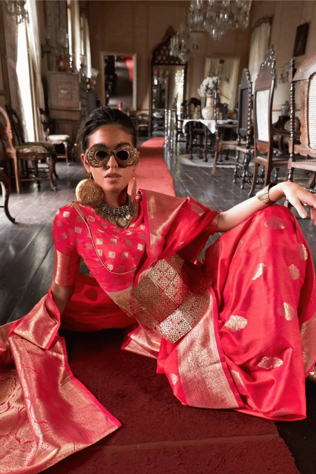 Drape yourself in the elegance of a Regal Resham— a pre-stitched Banarasi saree with brocade blouse kissed with golden zari. This saree is a perfect blend of traditional craftsmanship and modern ease, designed for the woman who owns every room she walks into.