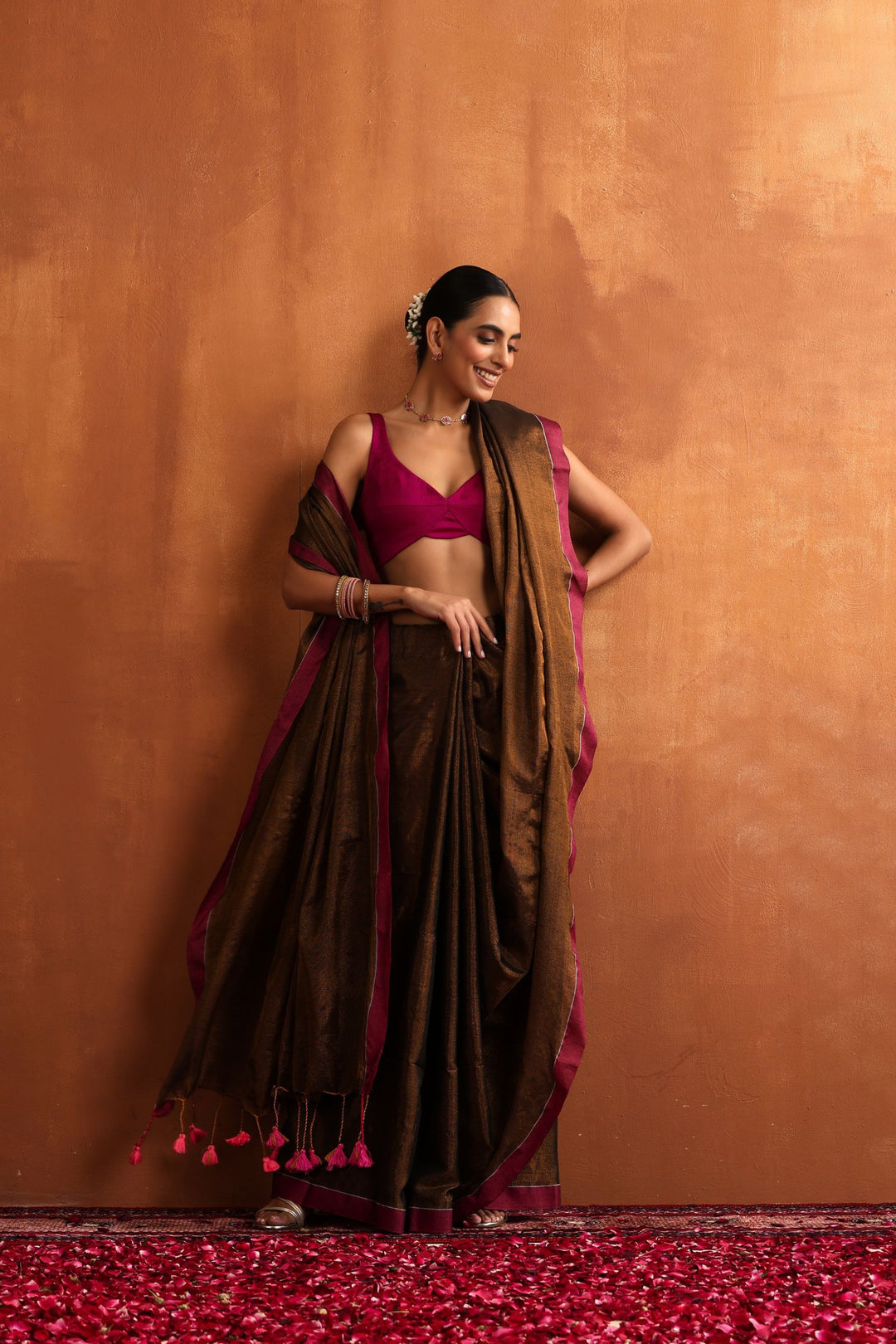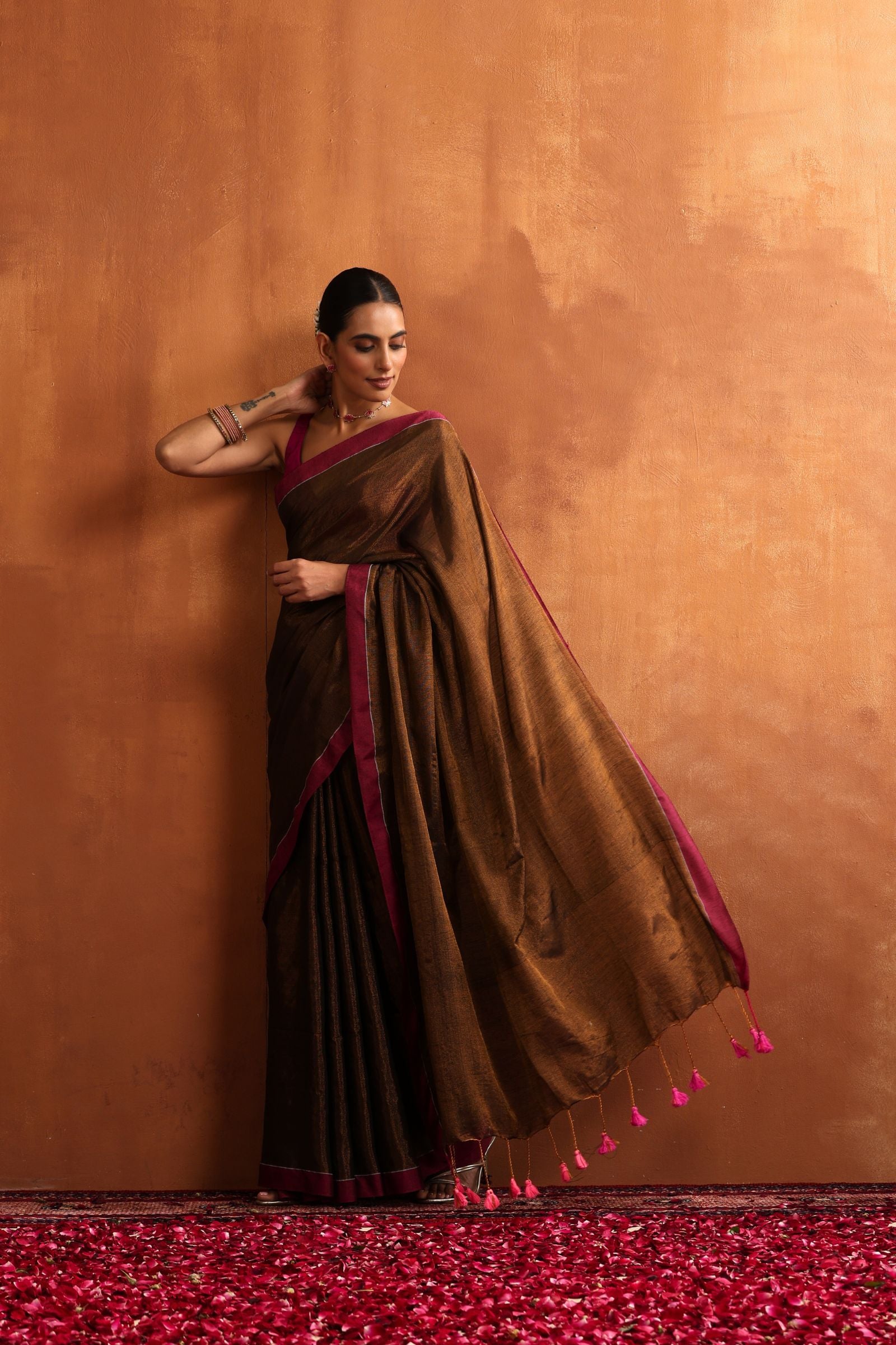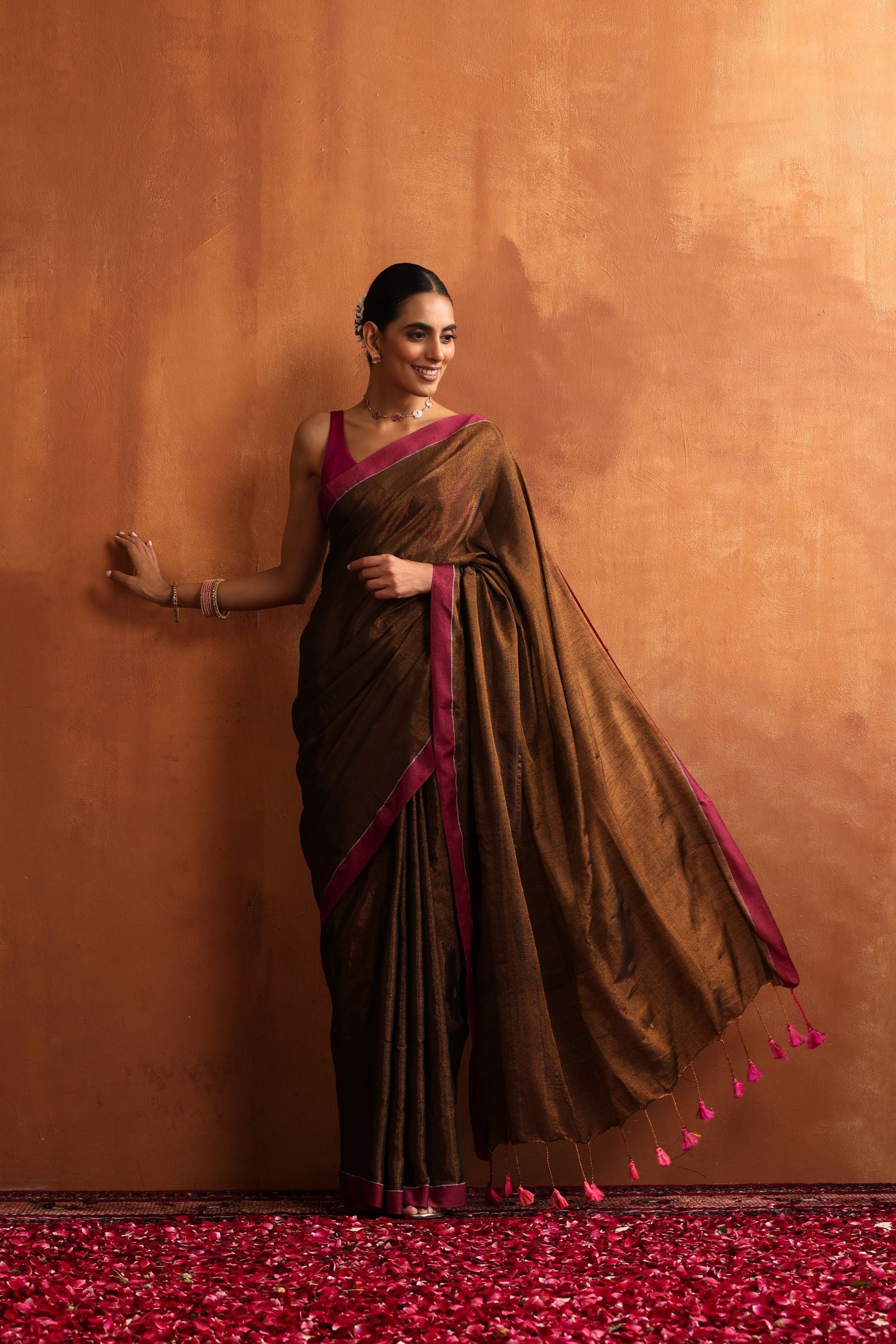 Roasted Sandal | Ready to Wear Brown Cotton Tissue Saree