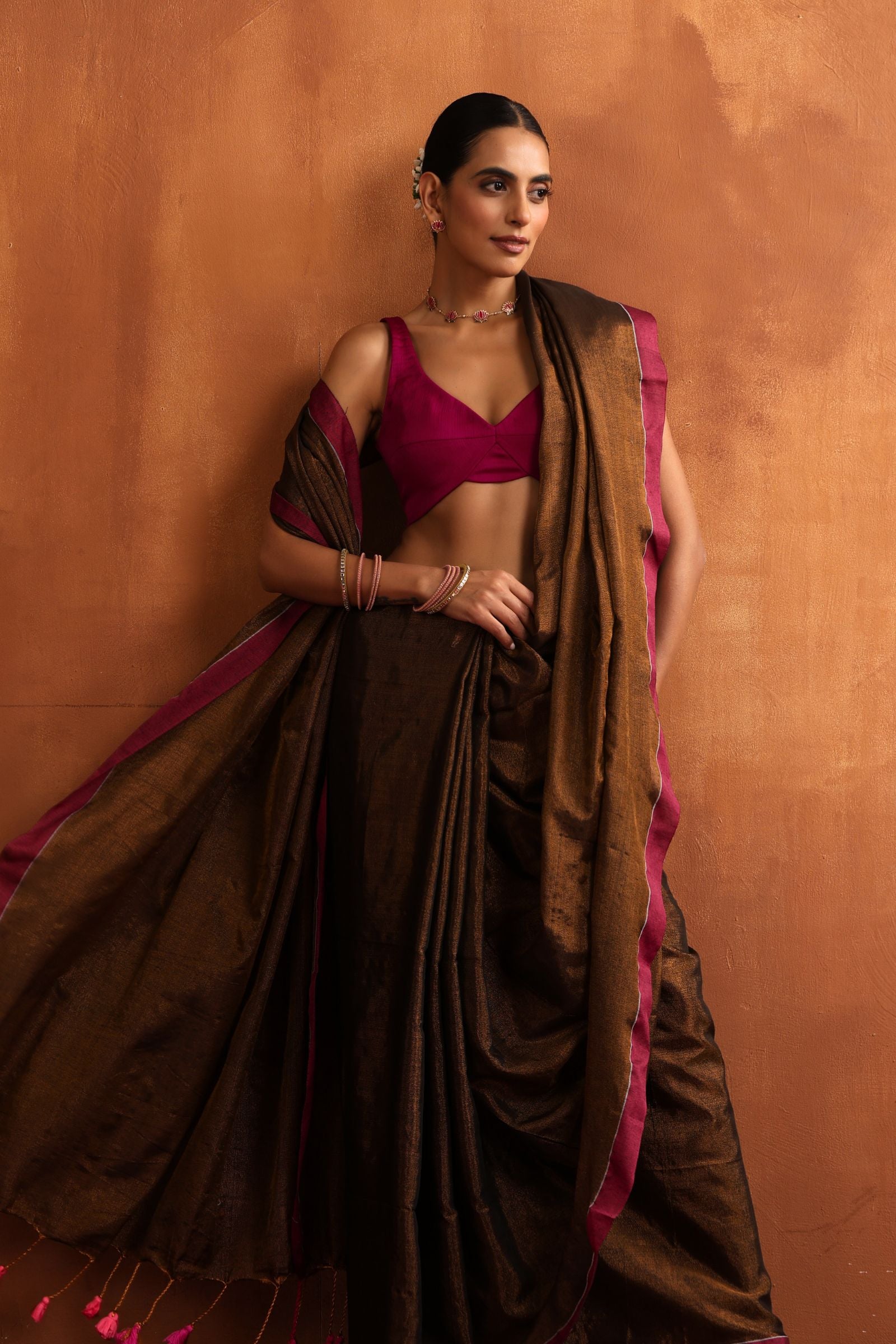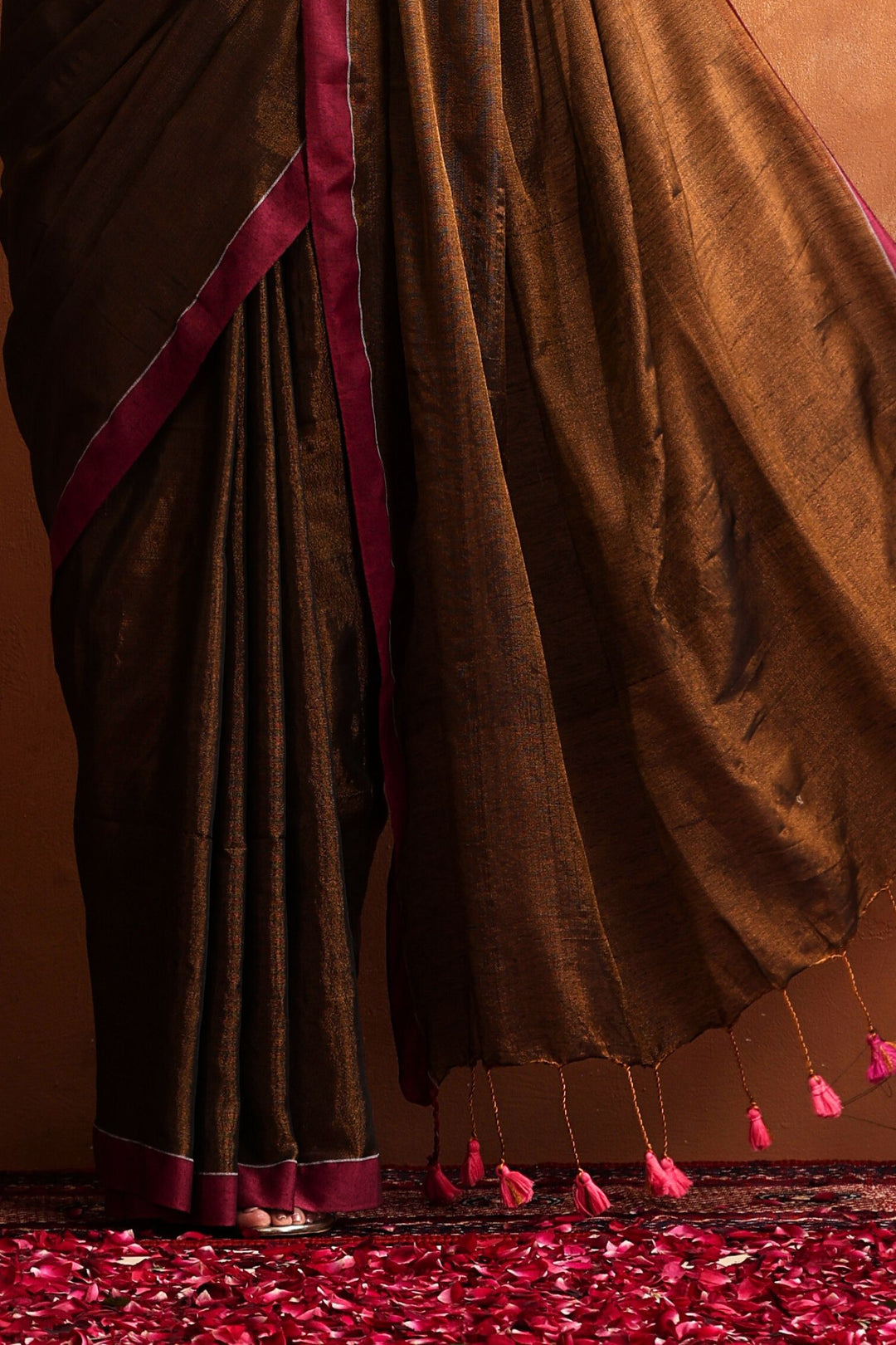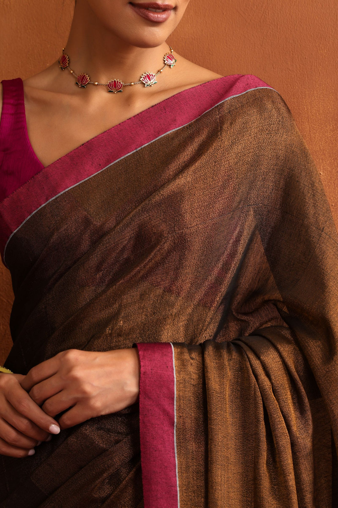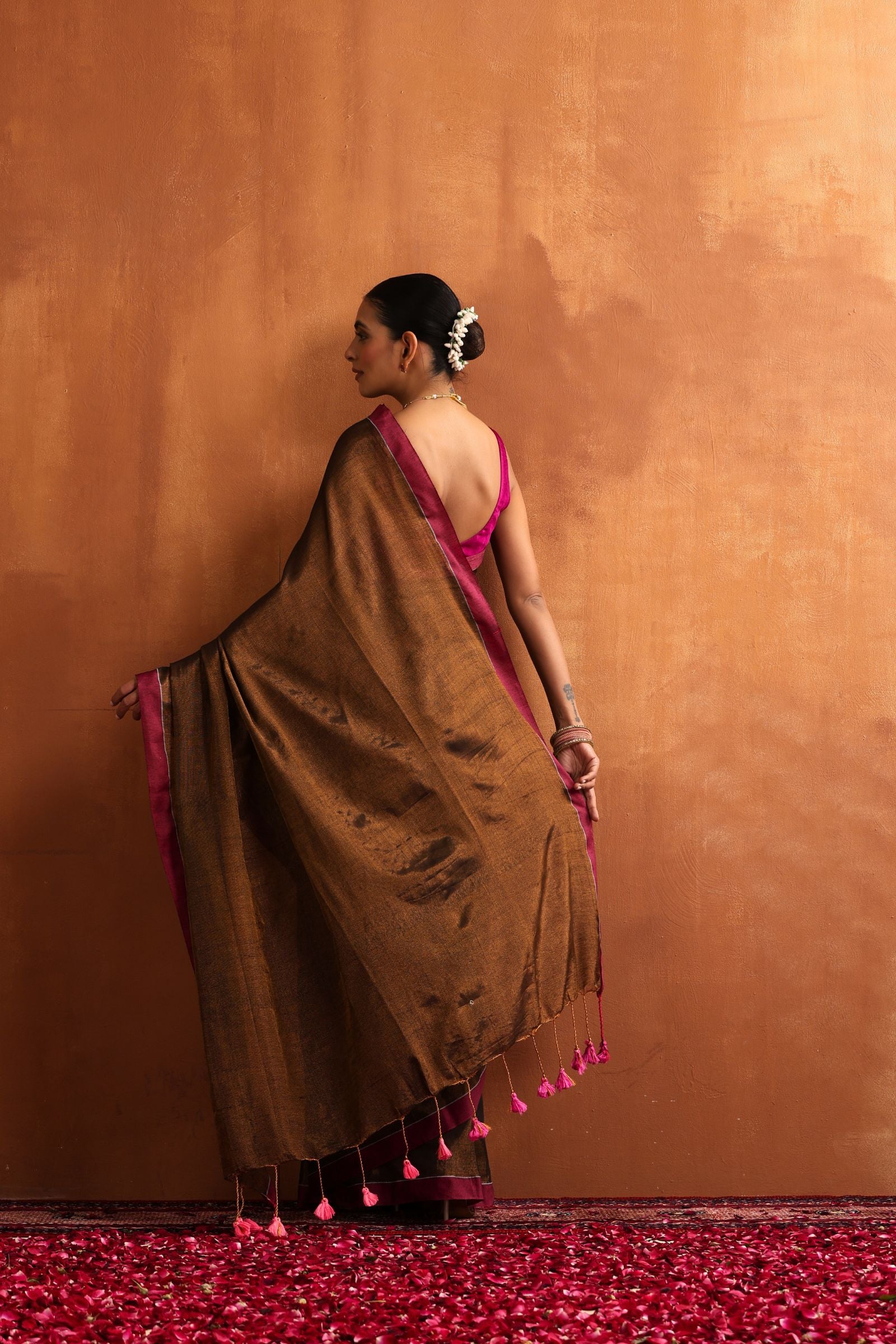 Roasted Sandal | Ready to Wear Brown Cotton Tissue Saree