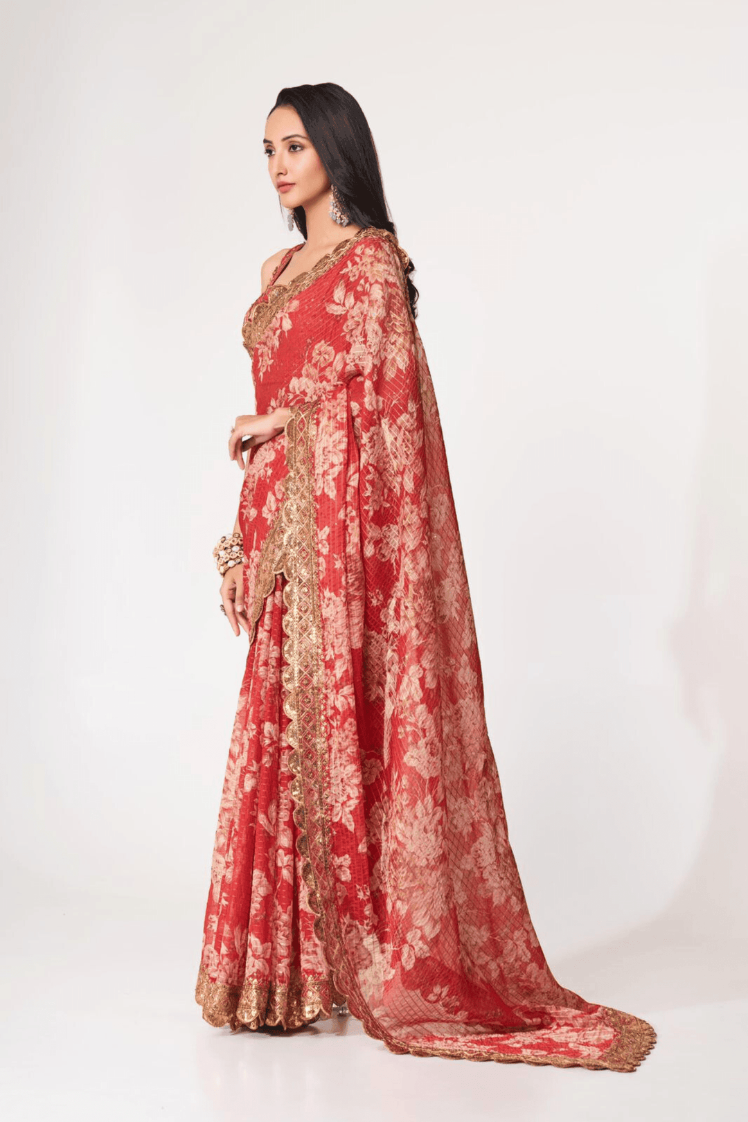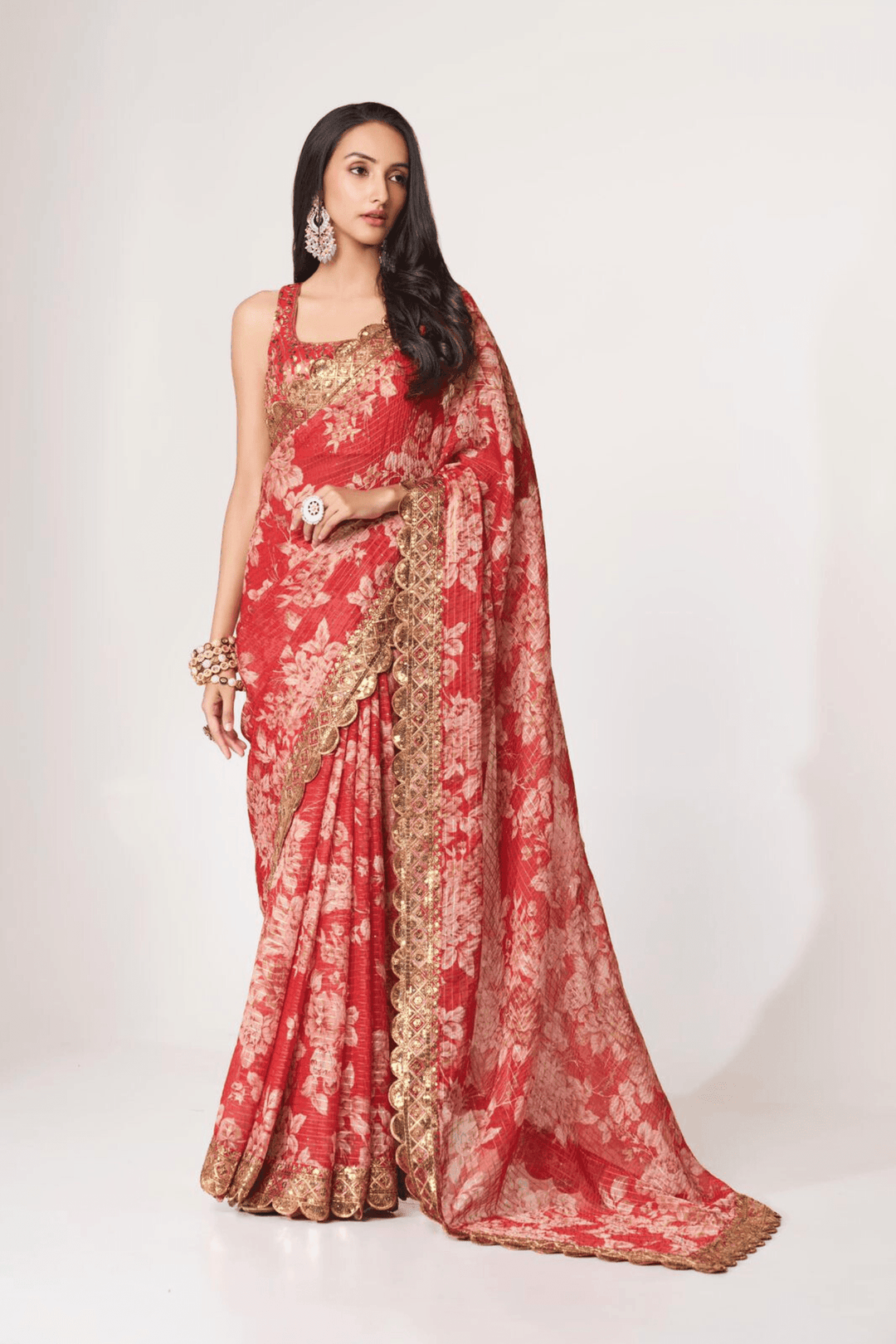 Scarlet Soiree | Ready to Wear Red Floral Organza Saree