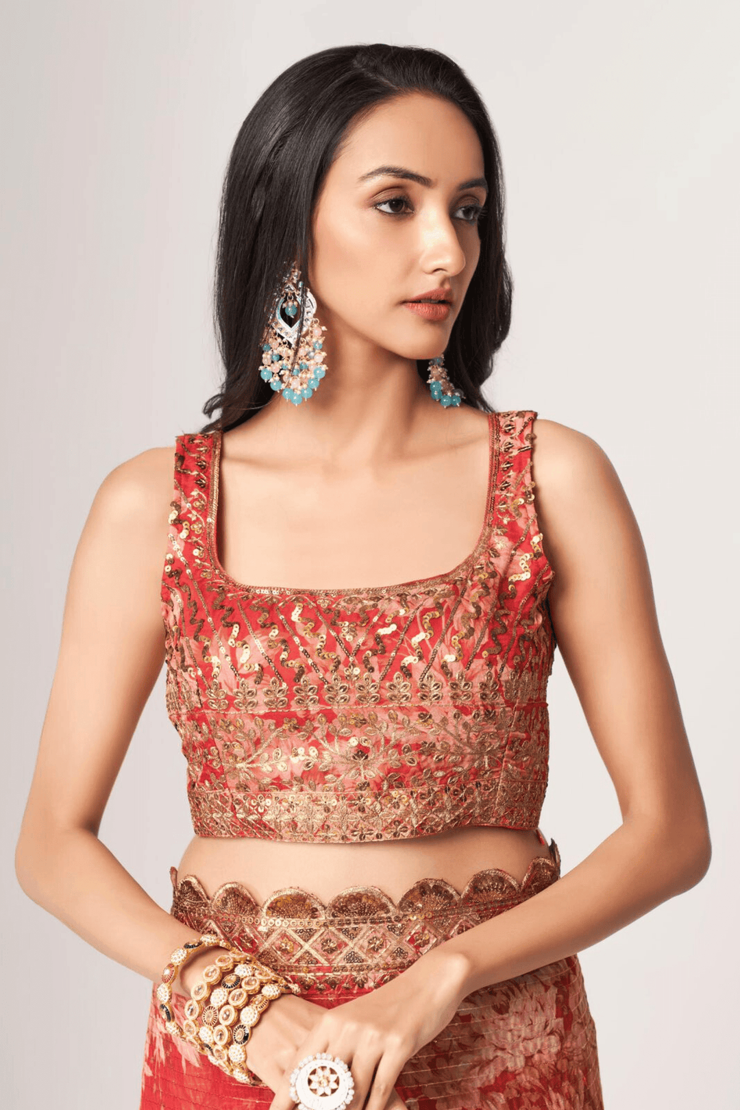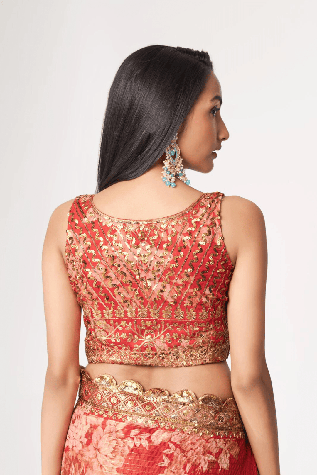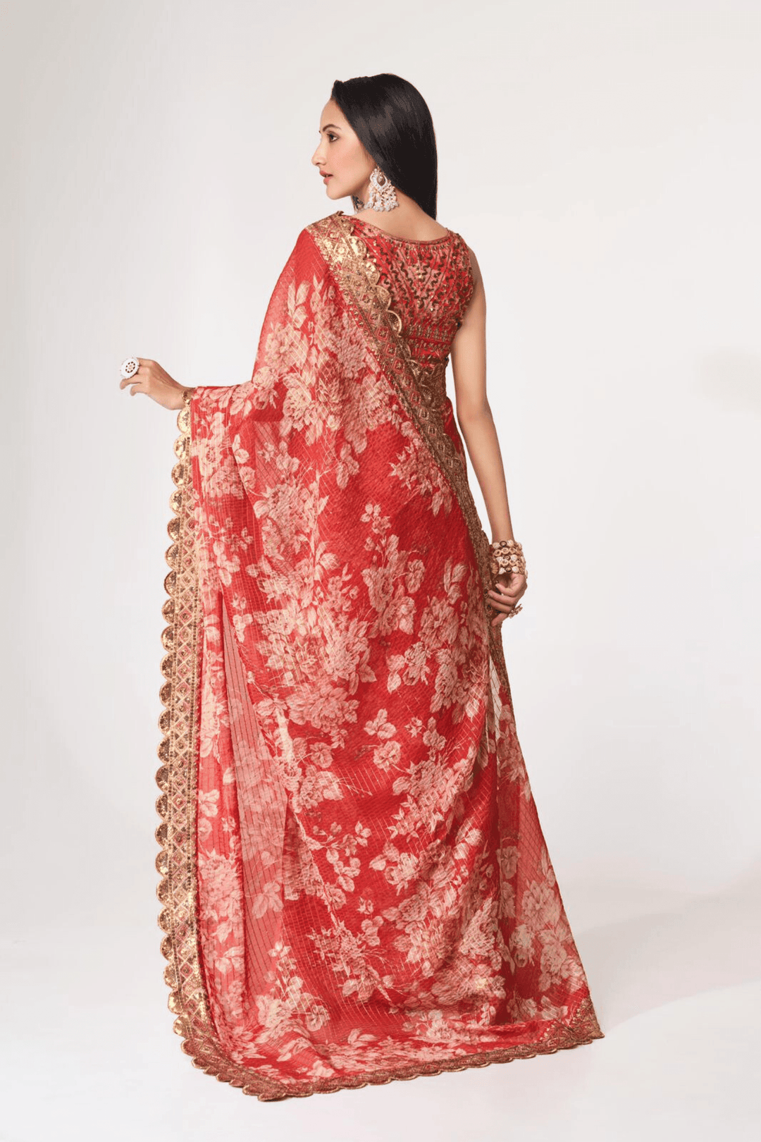 Introducing Glamwiz Ready to Wear Scarlet Red Organza Saree, crafted in vibrant floral print with exotic color combinations. Perfect for any occasion, whether it's a traditional ceremony, or a formal gathering, this saree adds an aura of sophistication to your ensemble This Organza saree comes with stitched pleats, and is adjustable upto 3 XL