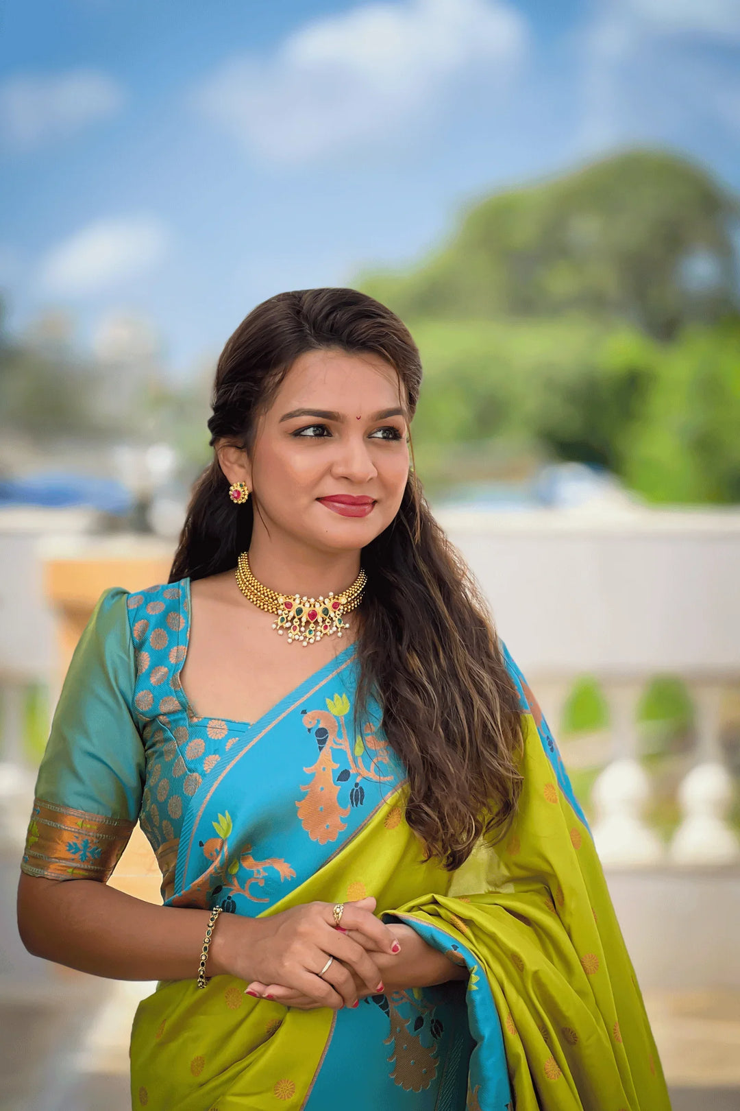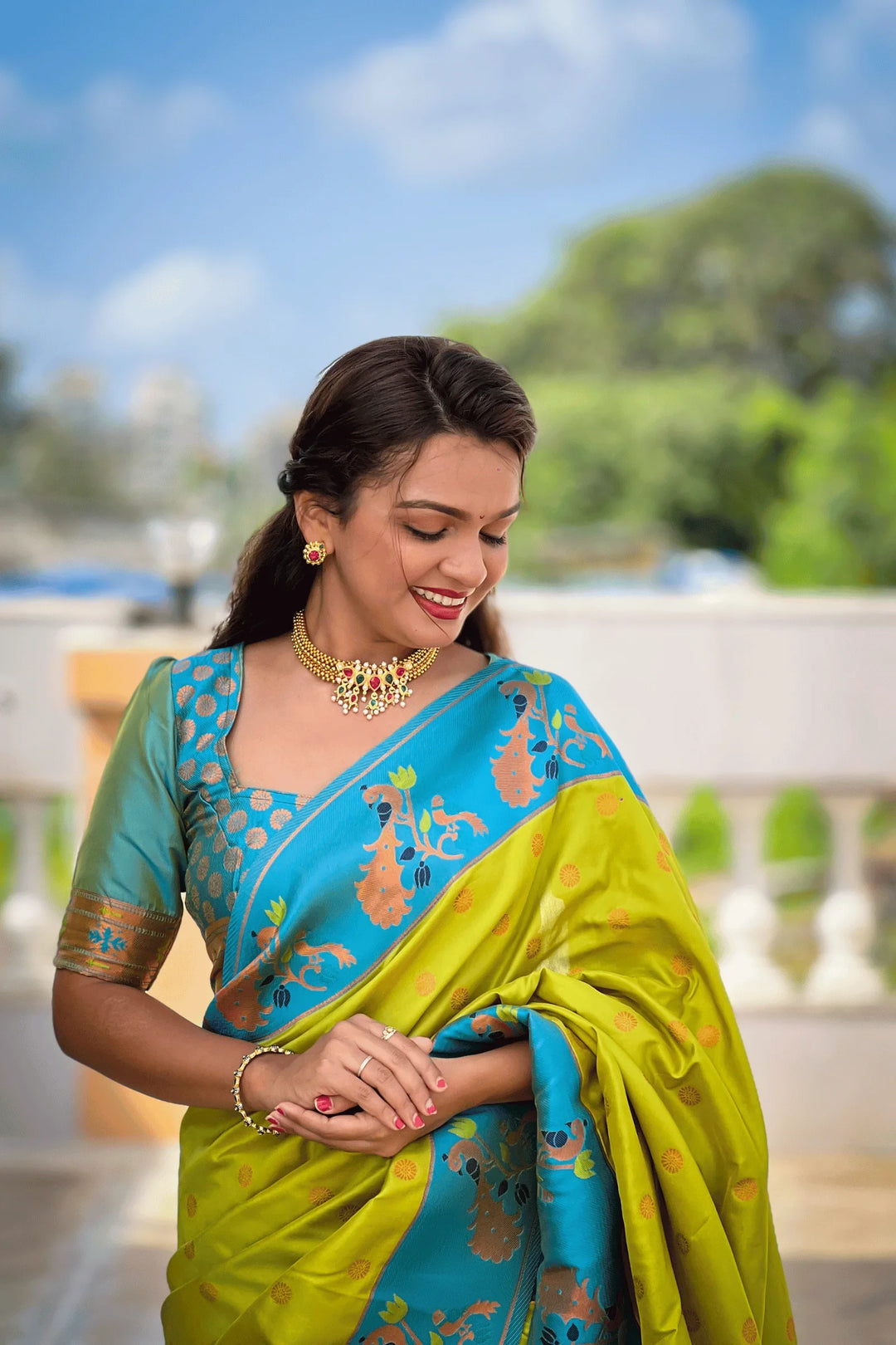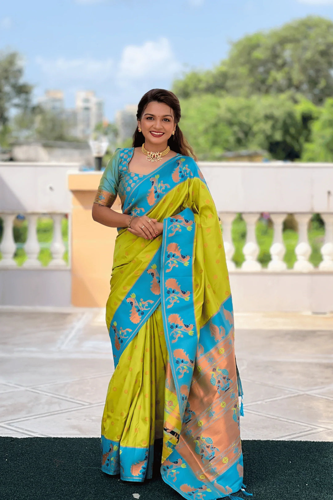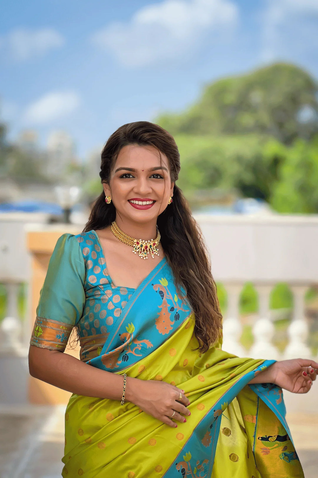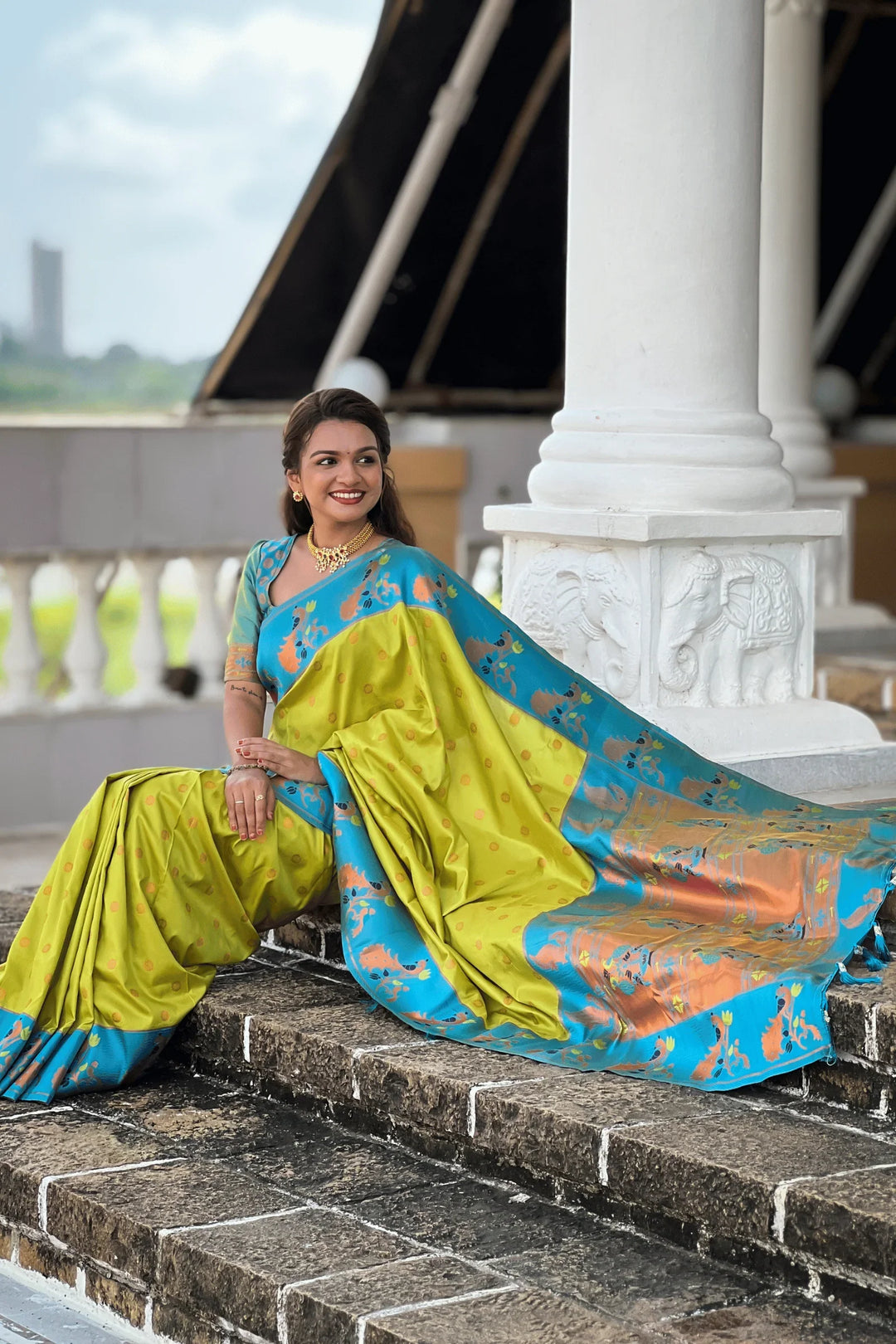A timeless piece of art, this Yellow Peacock Silk Paithani Saree with Peacock border is a must-have for any saree lover. Handwoven in the heart of Maharashtra, this saree features intricate gold zari work and a vibrant palette. Perfect for weddings, festivals, and special occasions, this saree is sure to make you stand out.