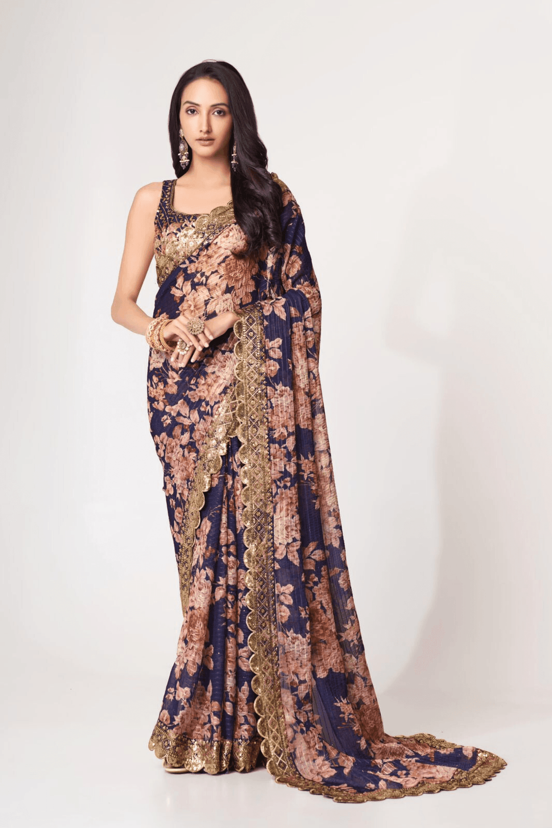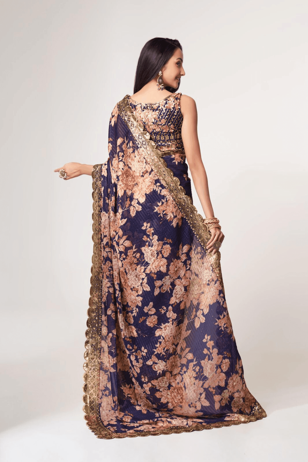 • Organza saree with floral print and embroidered border.