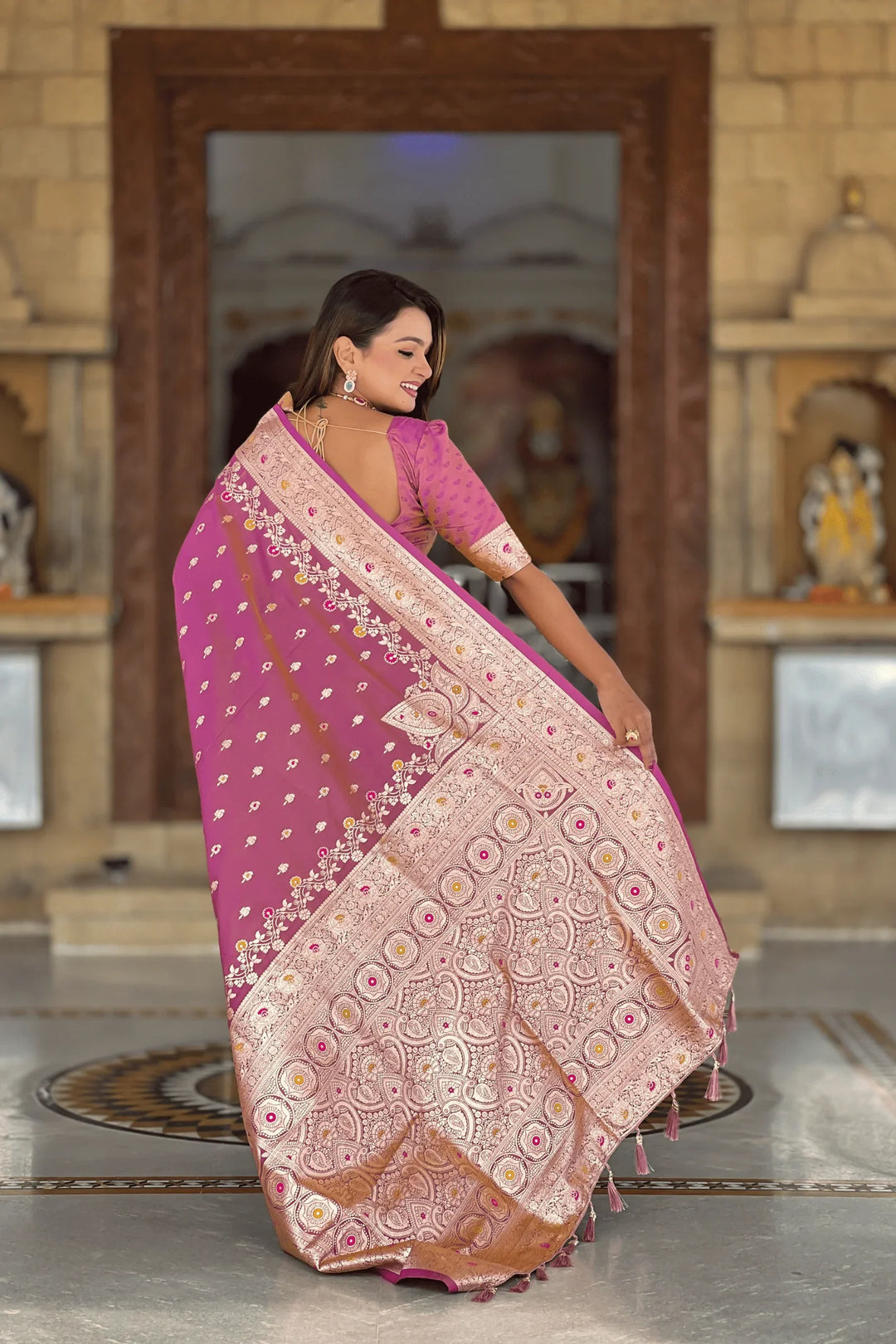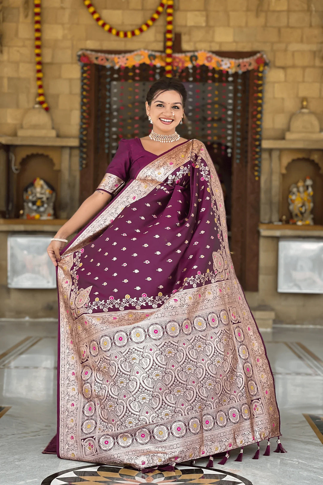 Introducing the Glamwiz Ready to Wear Banarasi Silk Saree. Experience the perfect blend of tradition and convenience with the Glamwiz Ready-to-Wear Saree. The saree has vibrant geometrical border with sophisticated pattern, ideal for office wear and social gatherings.