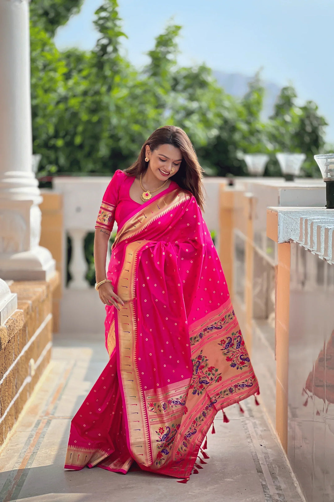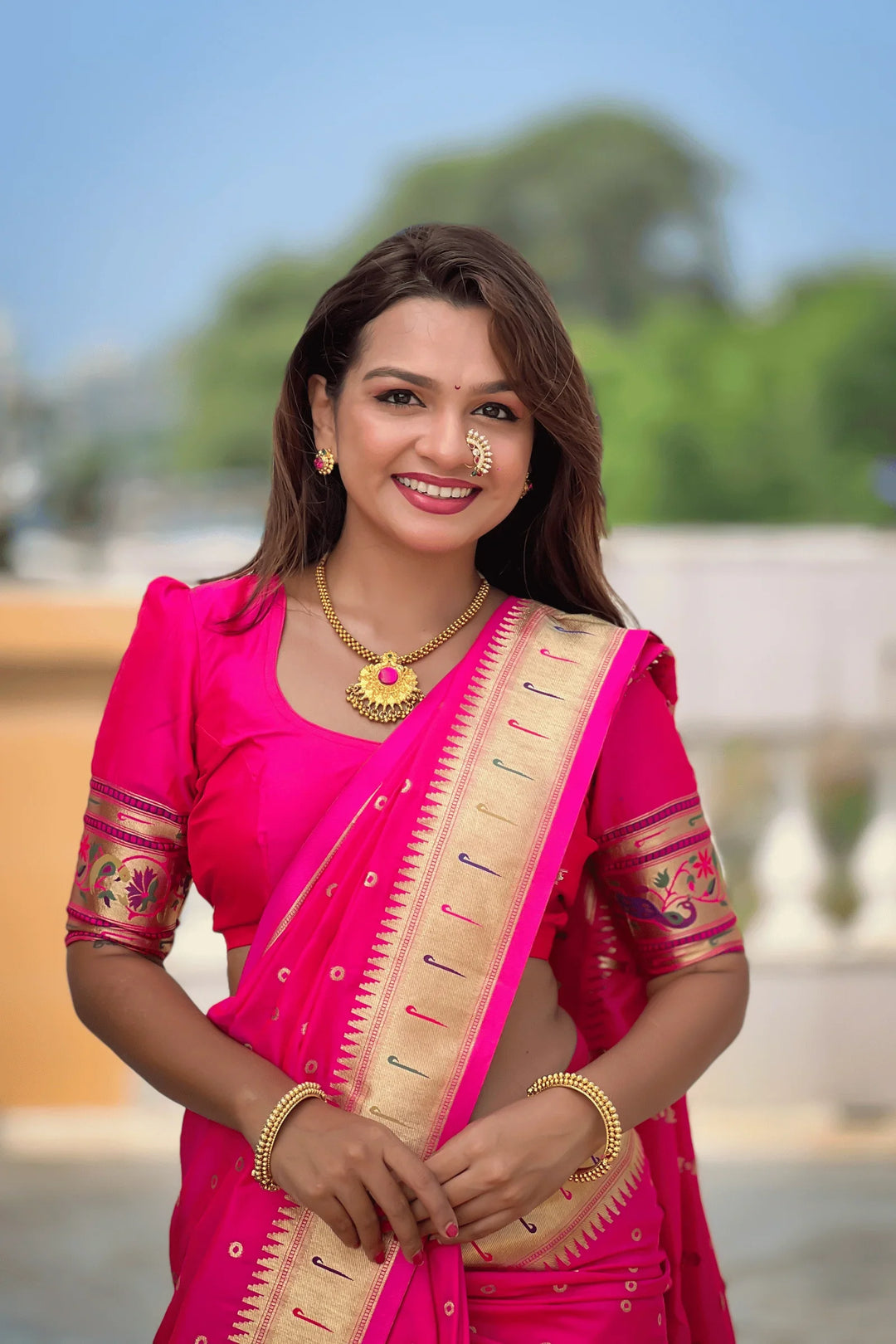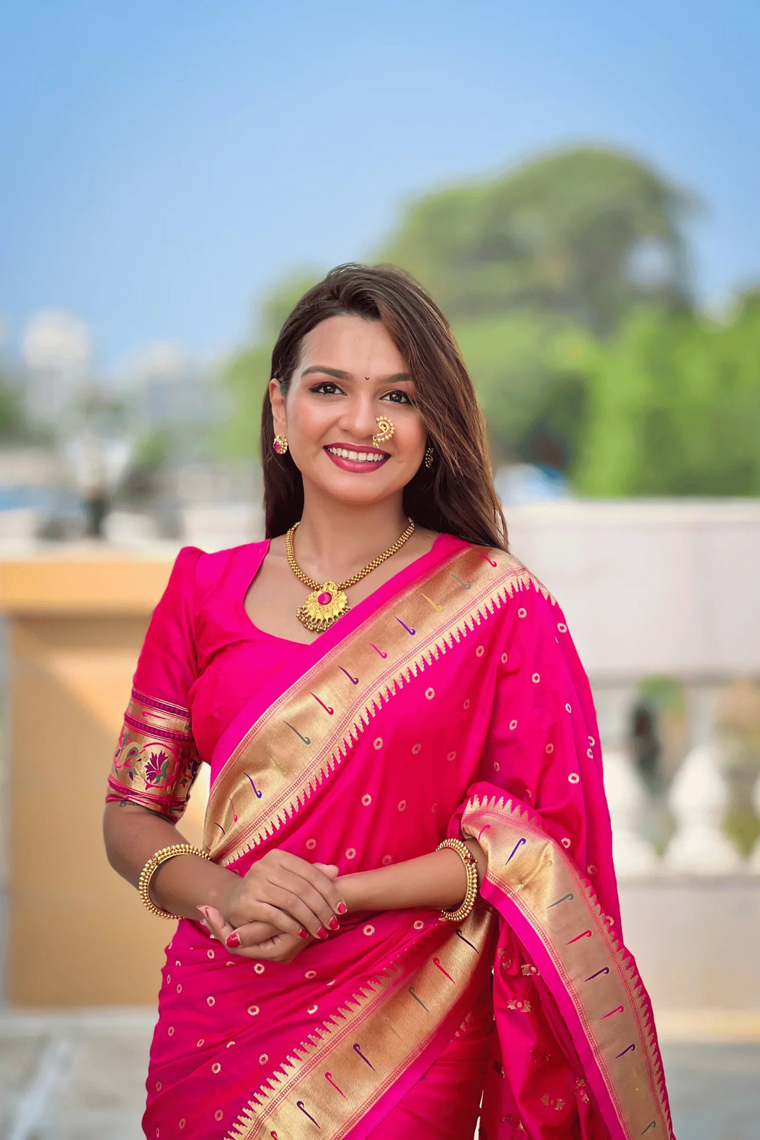 Introducing the Glamwiz Pink Paithani Banarasi Silk Saree. The saree has vibrant geometrical border with sophisticated pattern, ideal for office wear and social gatherings.