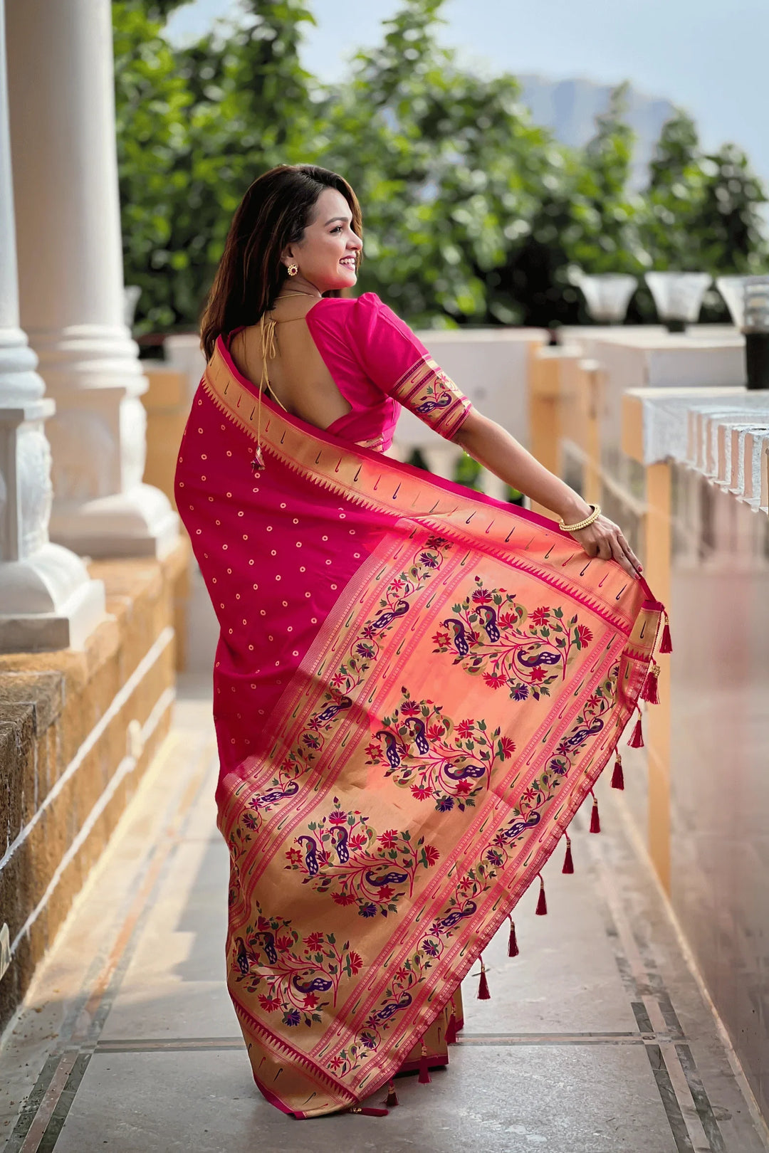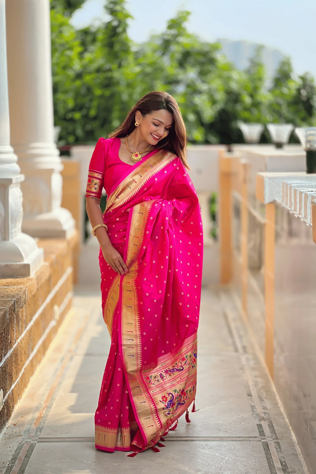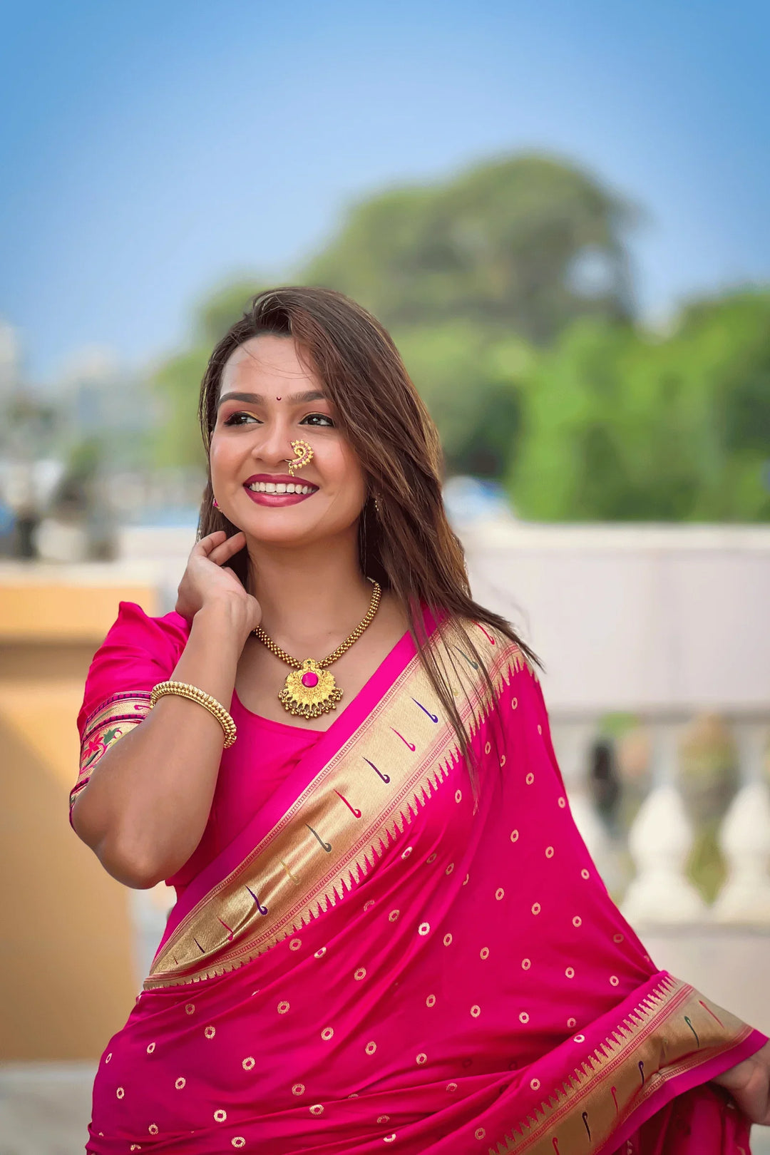Introducing the Glamwiz Pink Paithani Banarasi Silk Saree. The saree has vibrant geometrical border with sophisticated pattern, ideal for office wear and social gatherings.