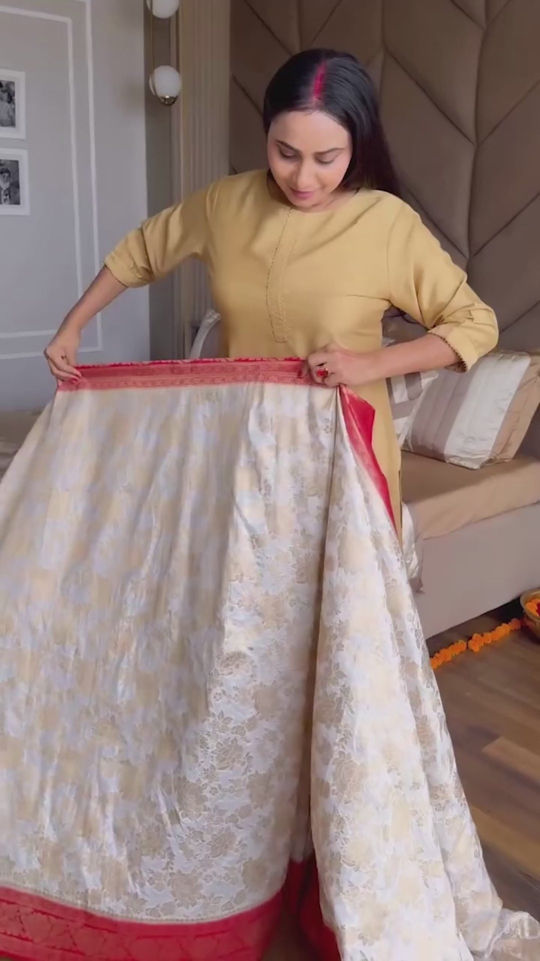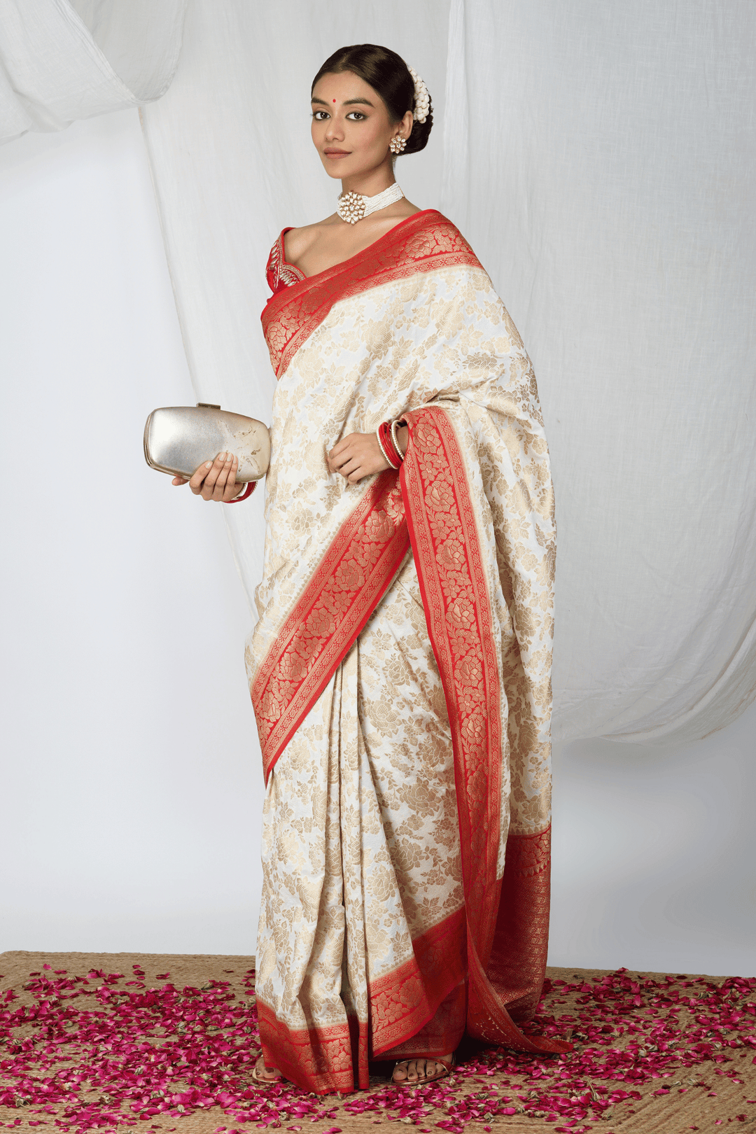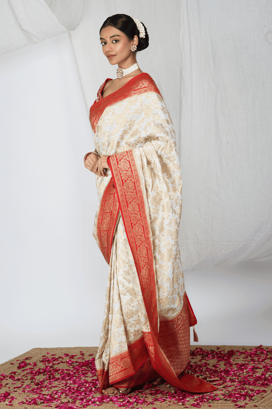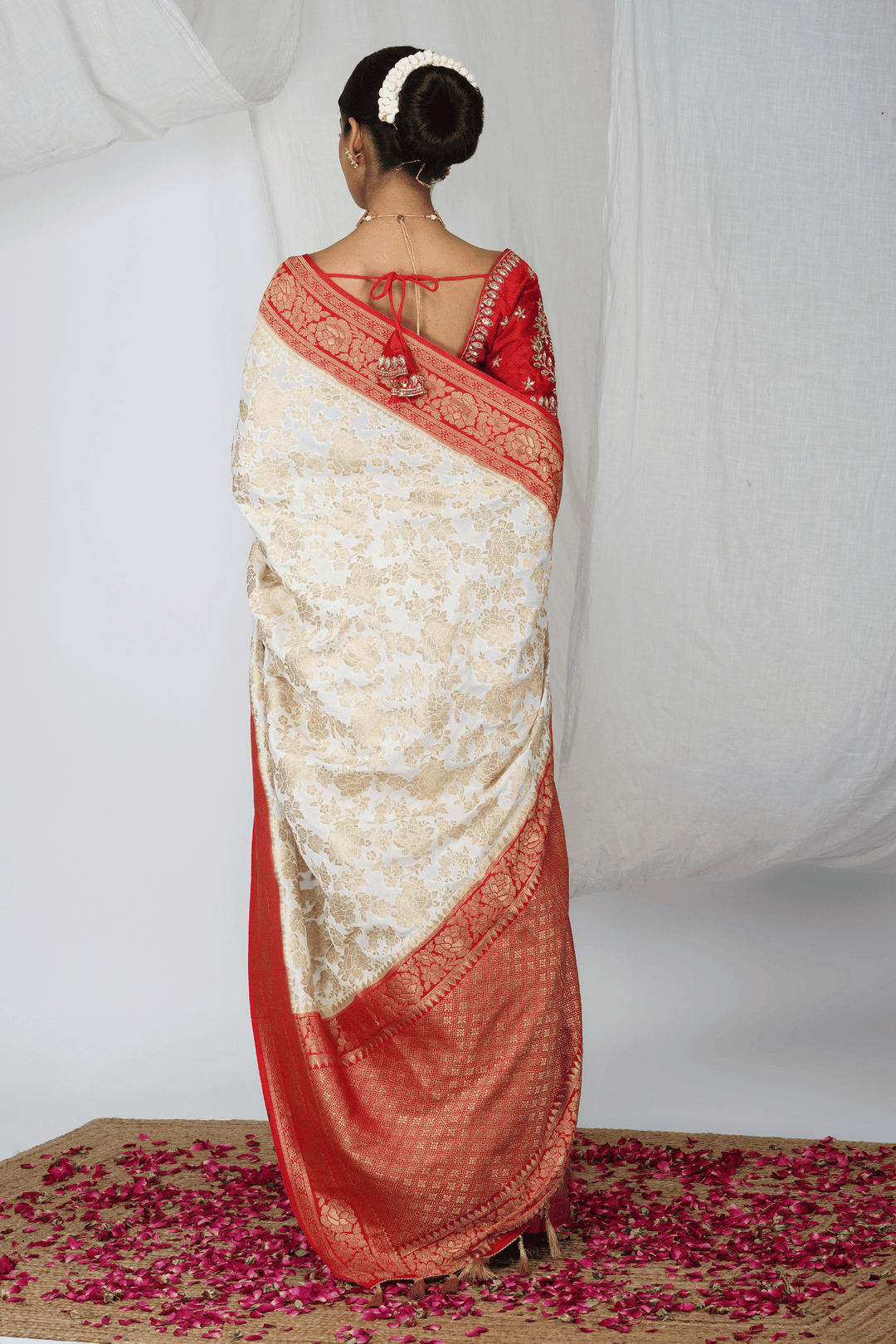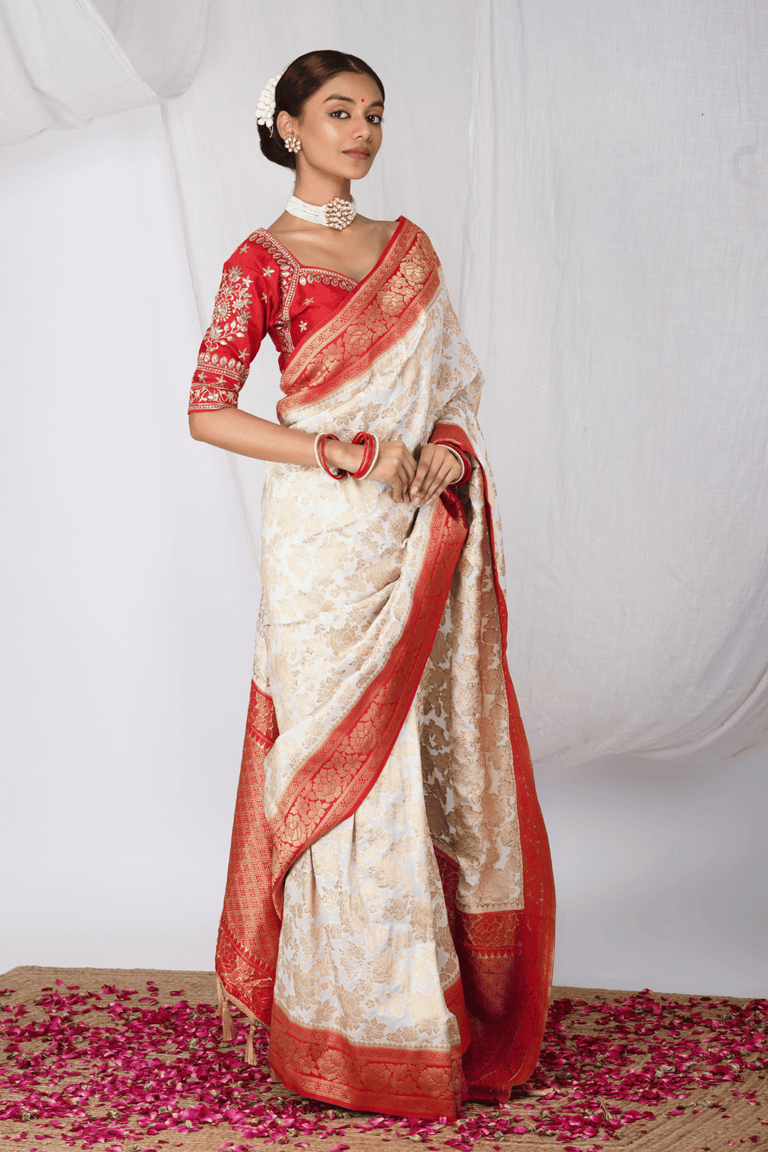 - One "Laal Paar" Ready to wear White & Red Silk Saree.
