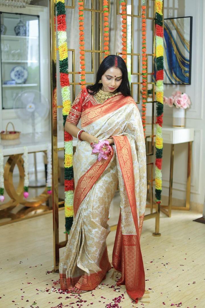Featuring Glamwiz Laal Paar, a stunning ready-to-wear white and red silk saree, perfect for celebrating Durga Puja. This elegant saree features a striking combination of white and red, symbolizing purity and power. This ready-to-wear saree come along with unstitched blouse 1 mtr.