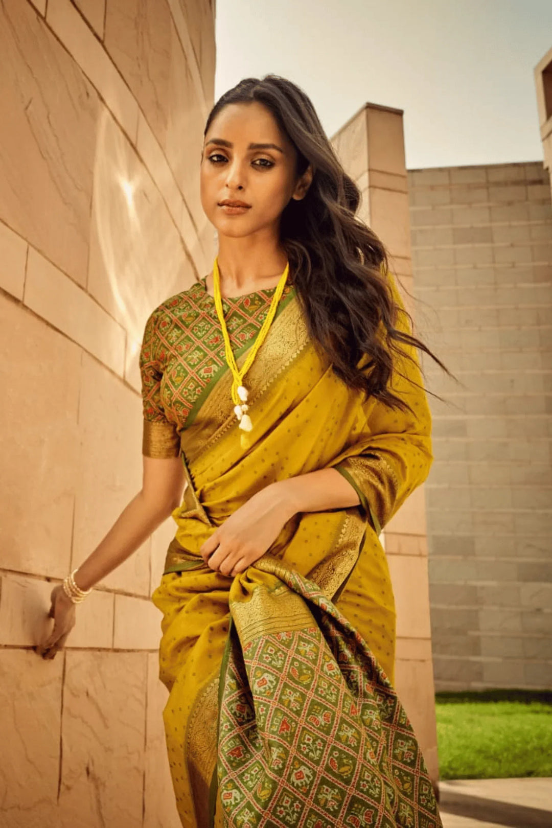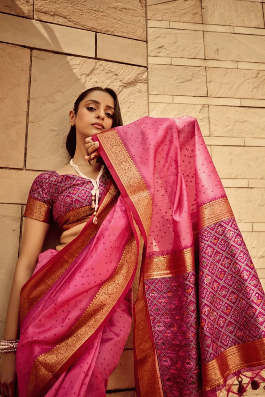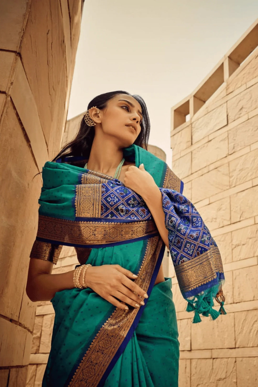 Drape yourself in the elegance of a Patola Silksā a pre-stitched Raw Silk saree with Patola weaving. This saree is a perfect blend of traditional craftsmanship and modern ease, designed for the woman who owns every room she walks into.