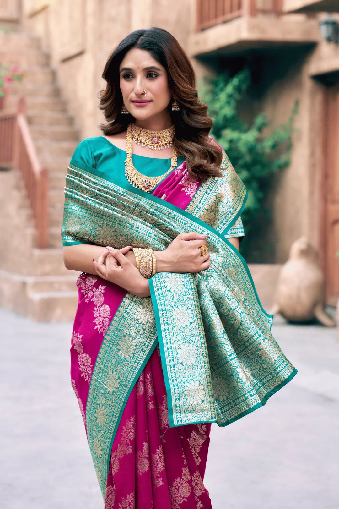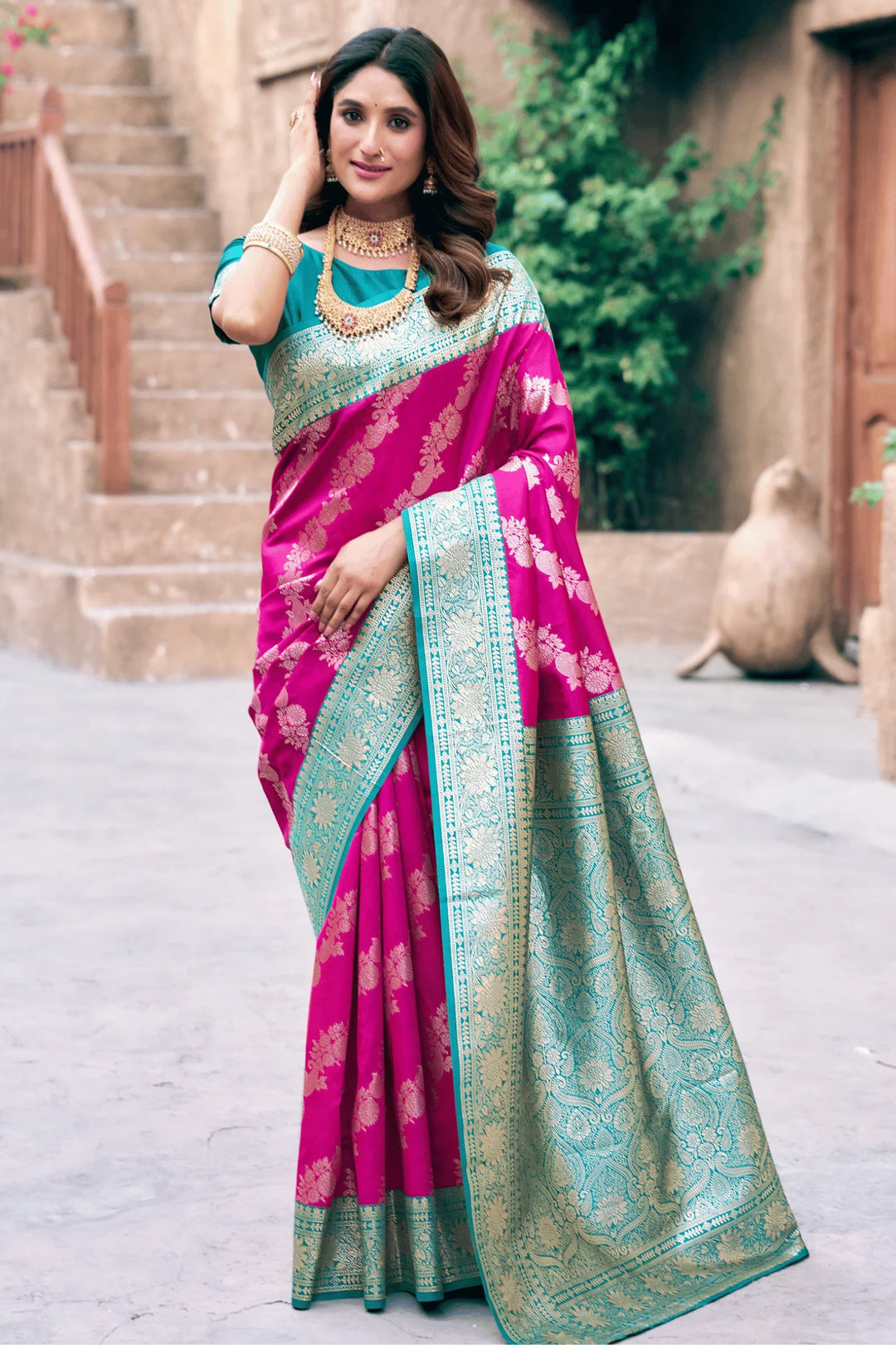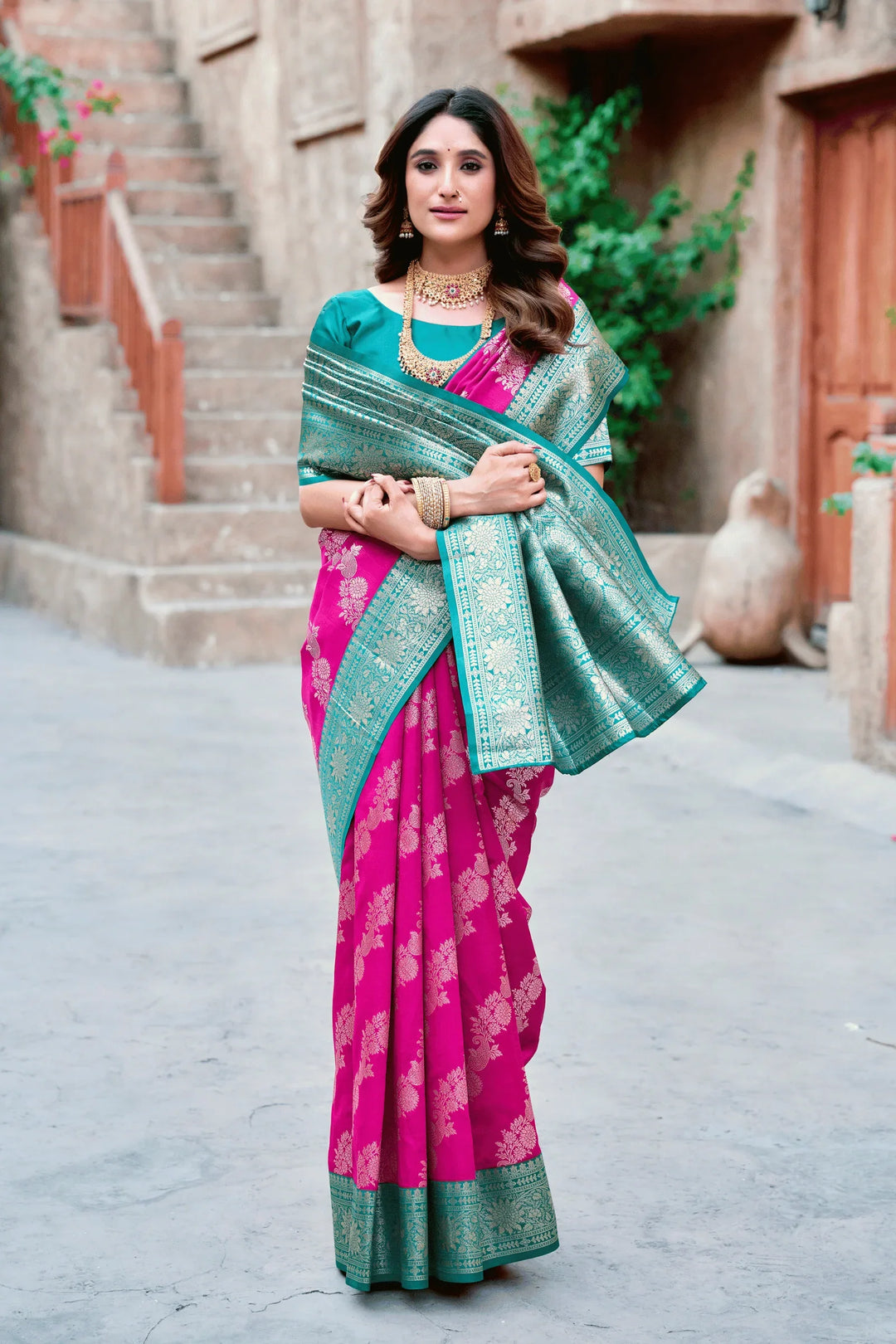 Introducing Glamwiz Ready To Wear Banarasi Silk Saree. Premium weaving Silk Saree with silver zari Motif design pattern and rich Contrast pallu.