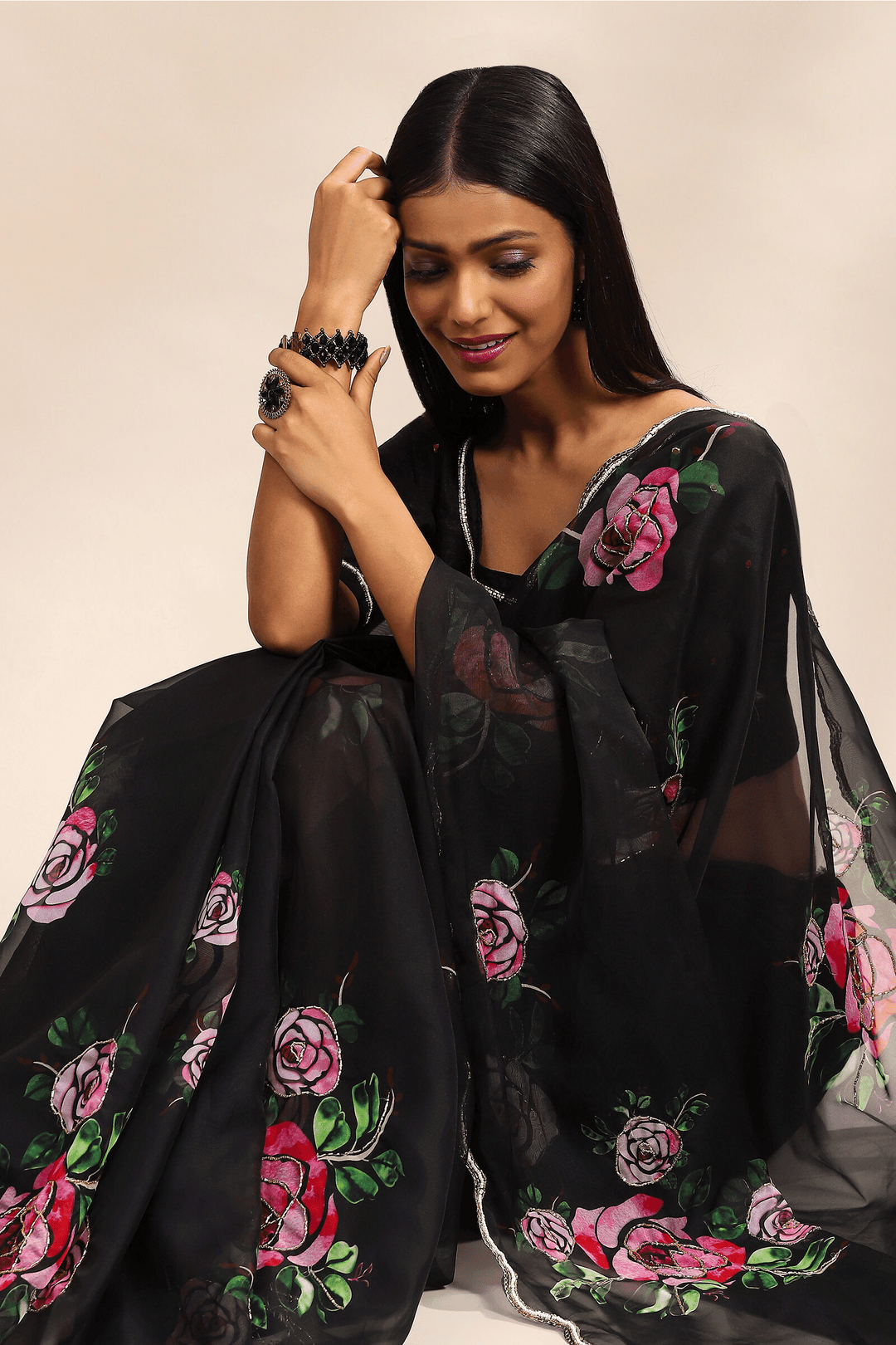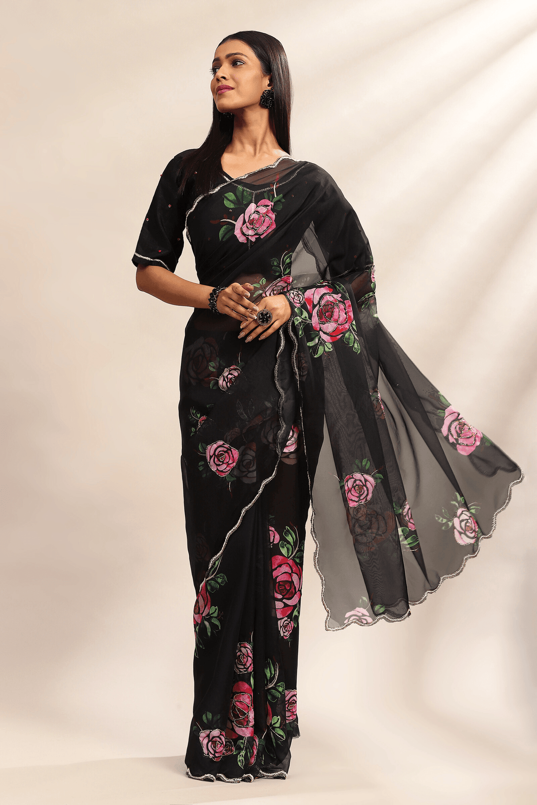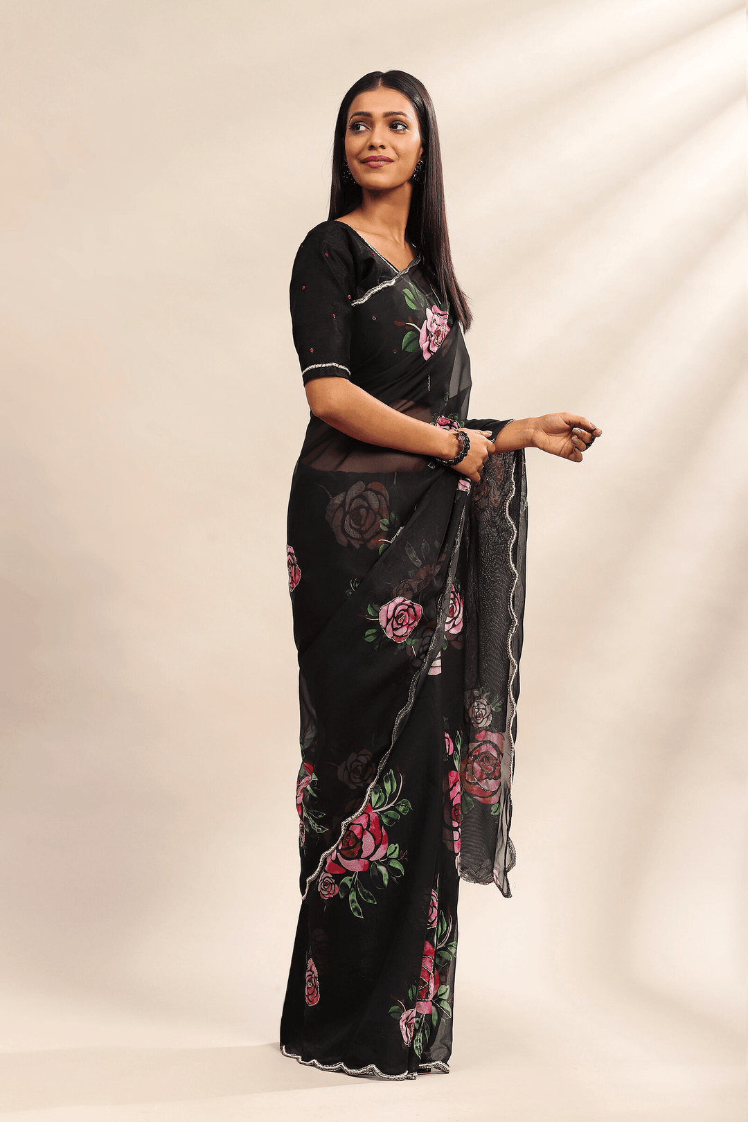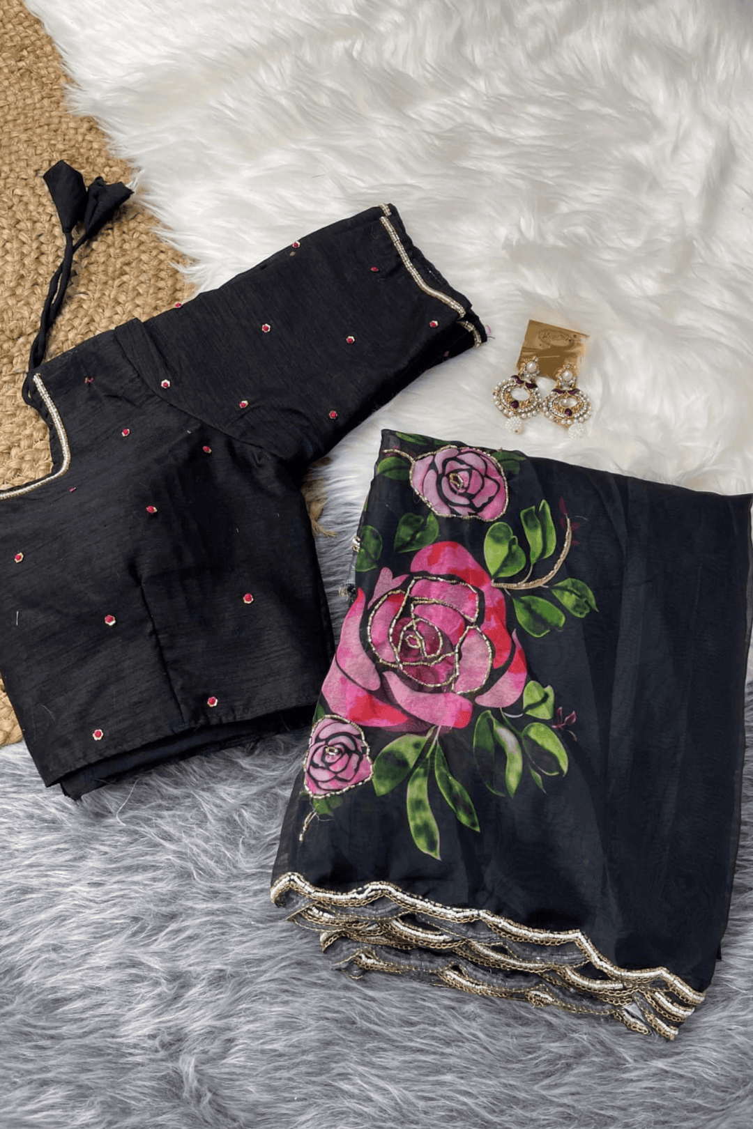 Introducing our Black Bloom Floral Printed saree in soft Organza with handwork and floral work across the saree. No draping hassle, just slip into this Organza Saree and own the moment with our show-stopping Ready to wear saree.