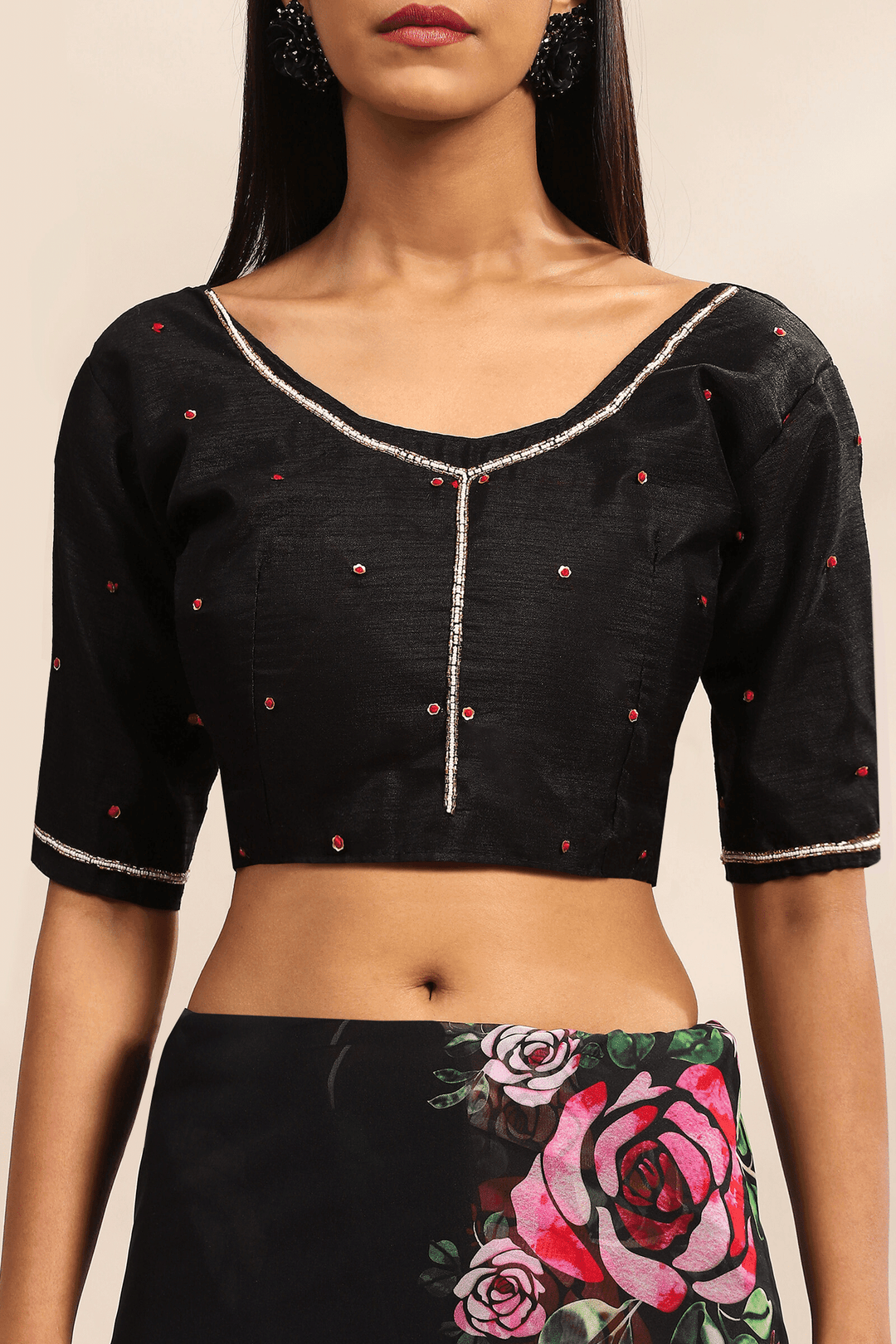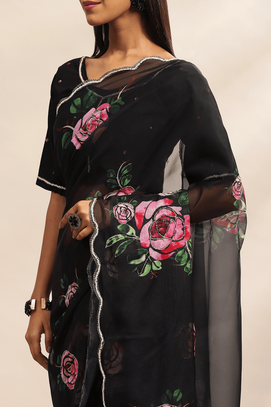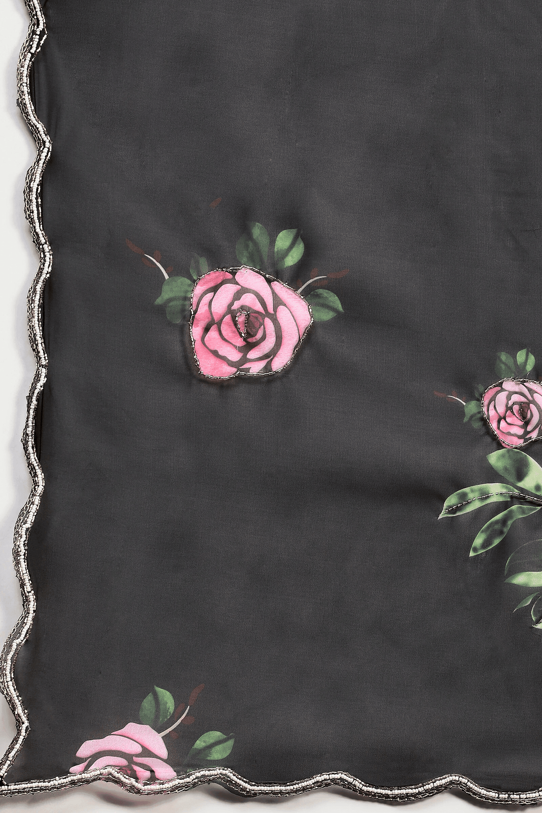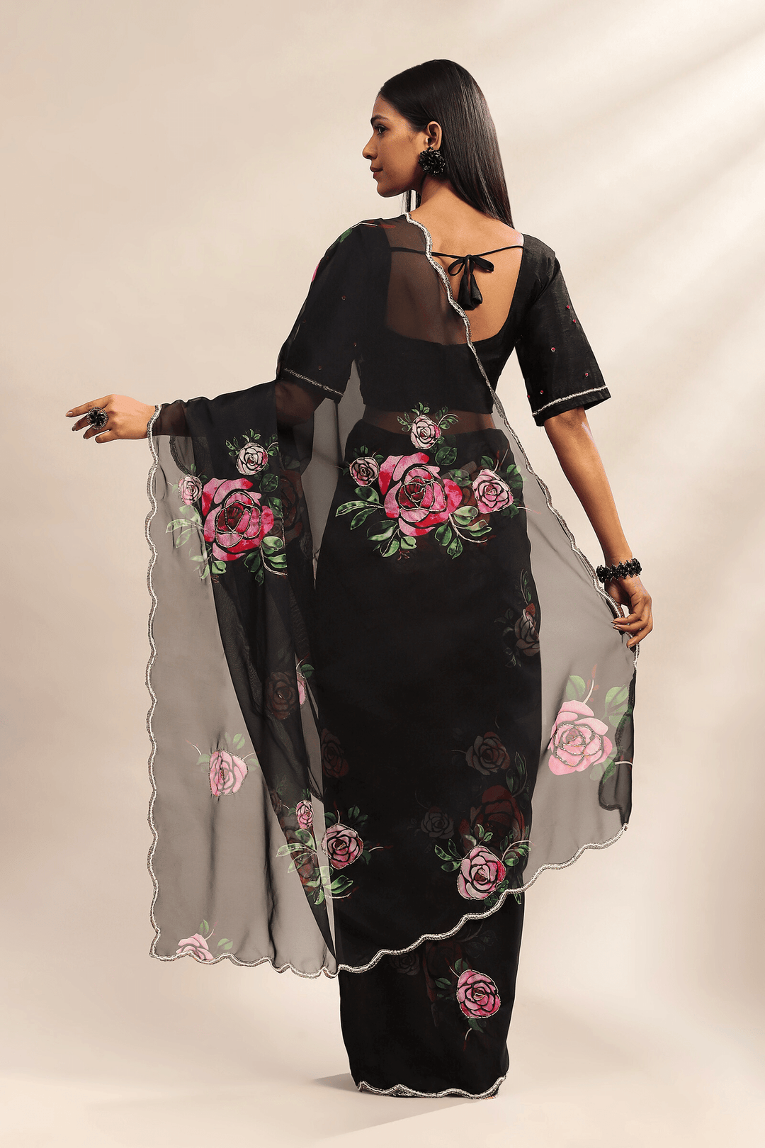 Introducing our Black Bloom Floral Printed saree in soft Organza with handwork and floral work across the saree. No draping hassle, just slip into this Organza Saree and own the moment with our show-stopping Ready to wear saree.