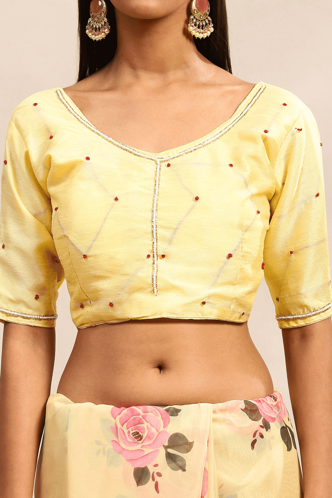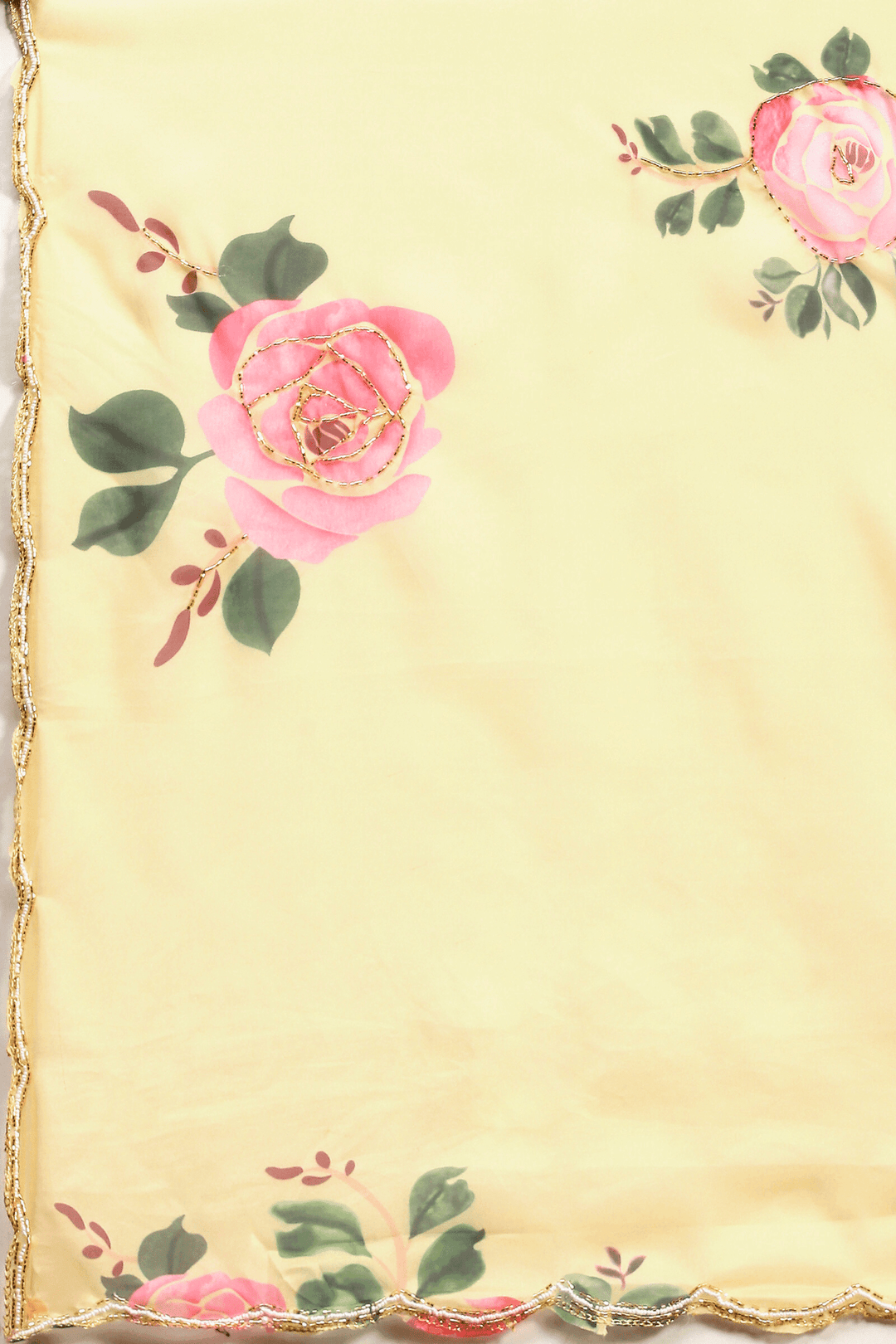 Introducing our Sunflower Printed saree in soft Organza with handwork and floral print across the saree. No draping hassle, just slip into this Organza Saree and own the moment with our show-stopping Ready to wear saree.