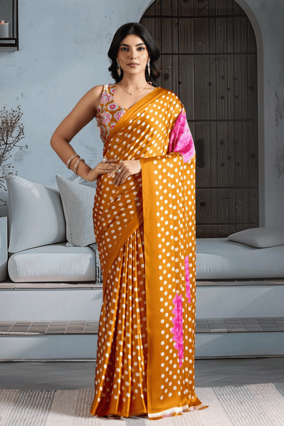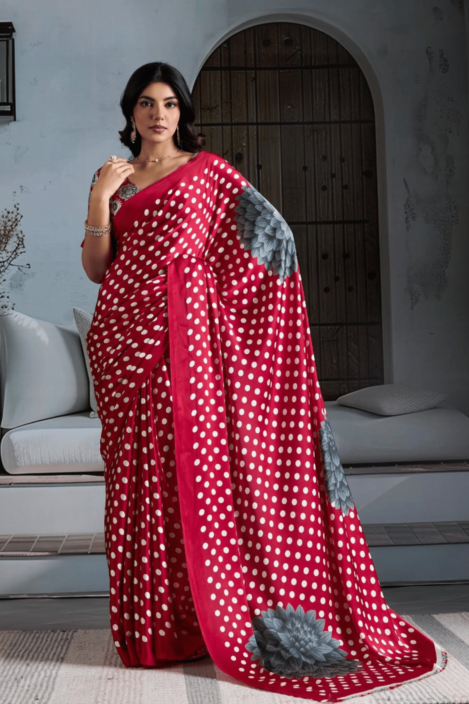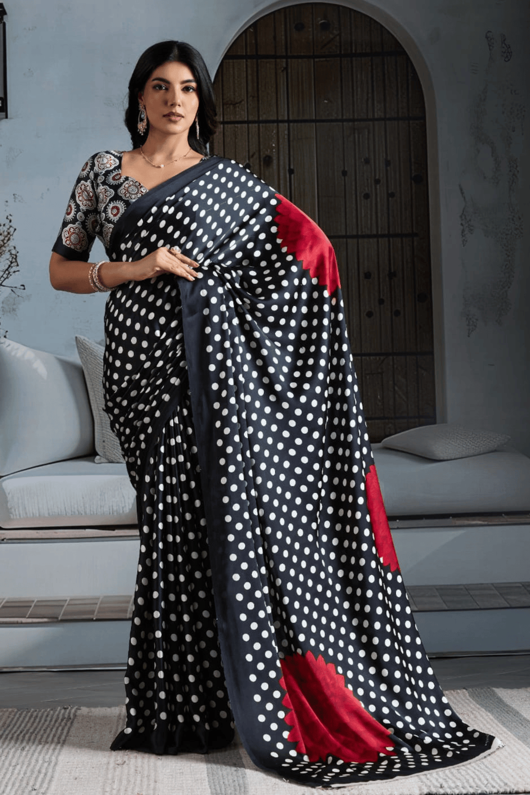 Introducing the Ajrakh Polka Petals Ready To Wear Satin Saree collection. Crafted from elegant Ajarakh-printed satin crepe, Featuring playful polka dots and bold floral patches, this saree adds a contemporary twist to classic Ajrakh designs.