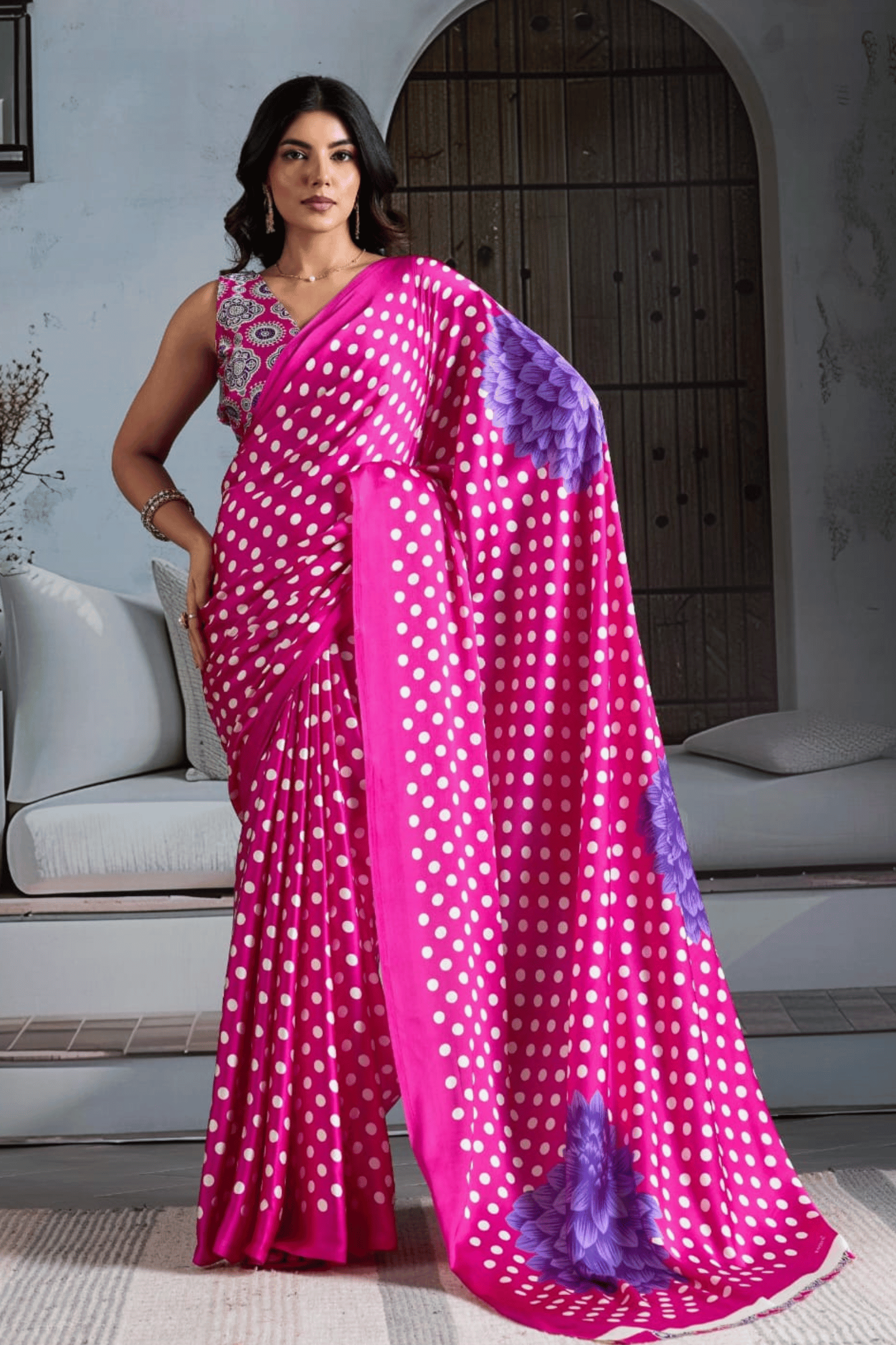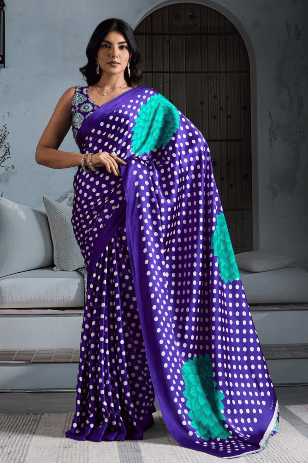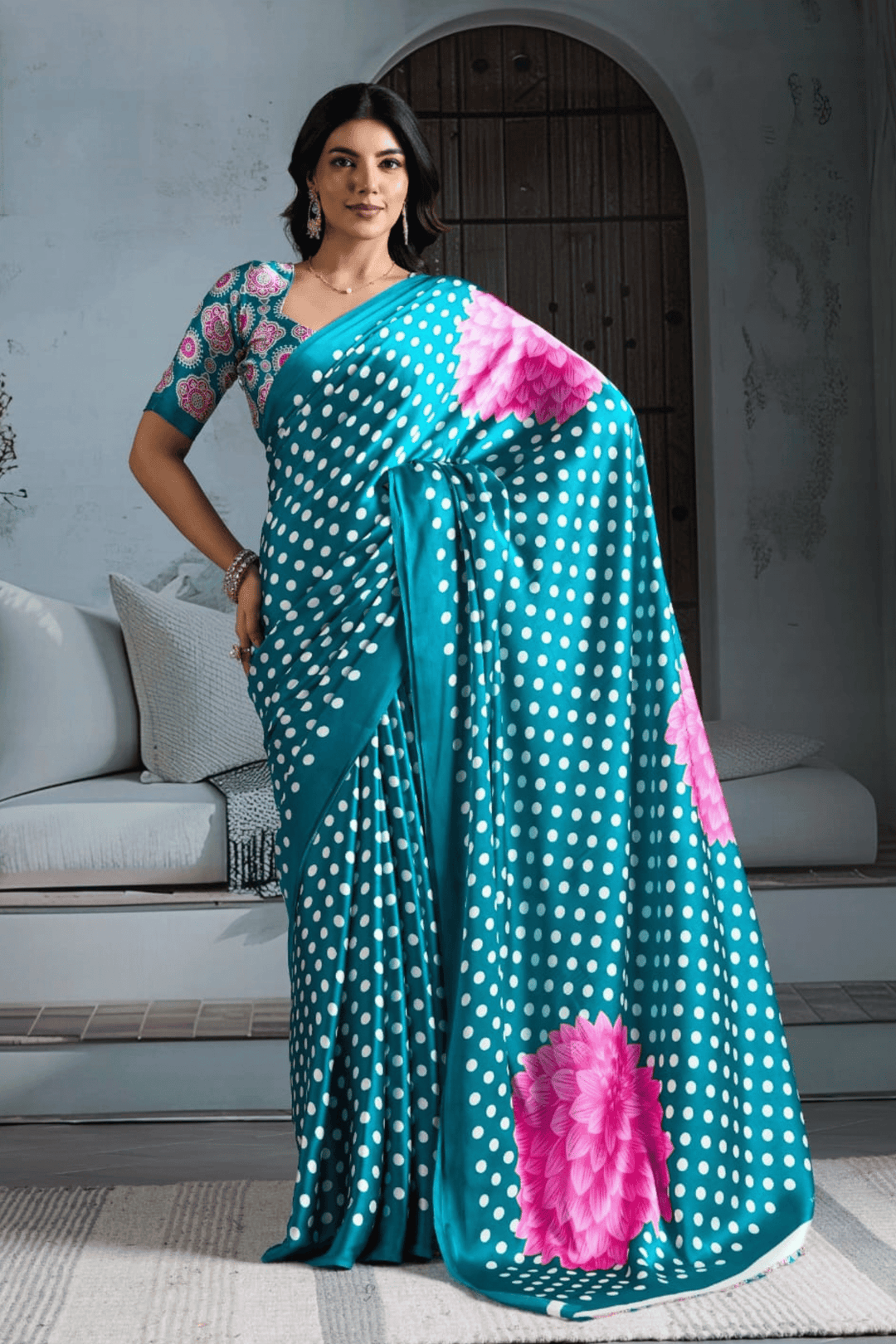 Introducing the Ajrakh Polka Petals Ready To Wear Satin Saree collection. Crafted from elegant Ajarakh-printed satin crepe, Featuring playful polka dots and bold floral patches, this saree adds a contemporary twist to classic Ajrakh designs.