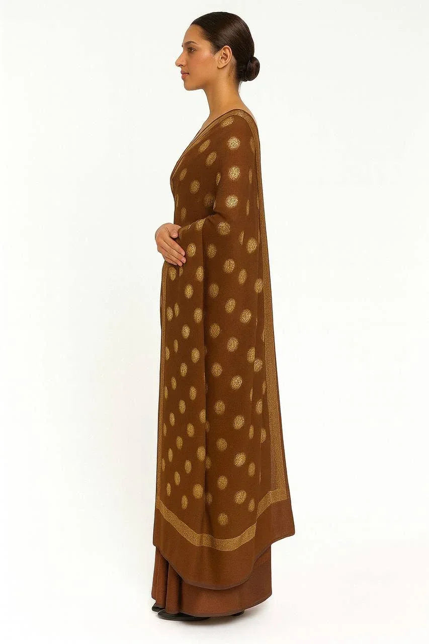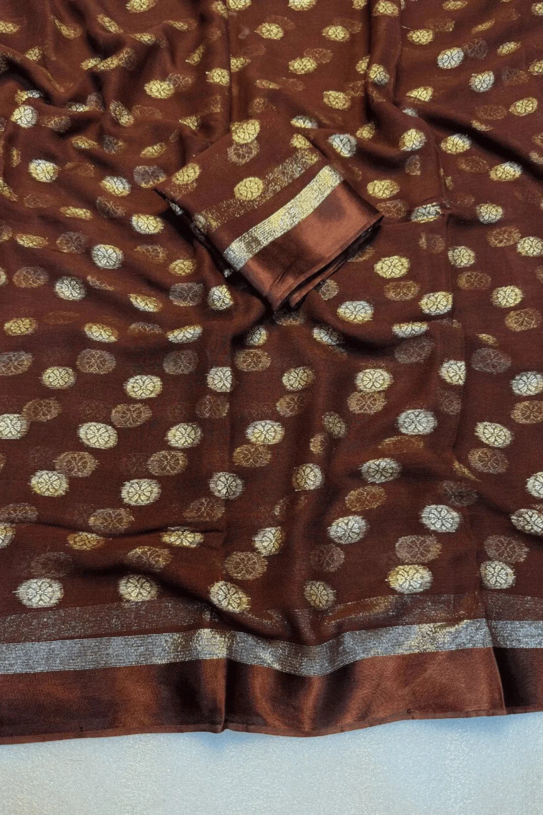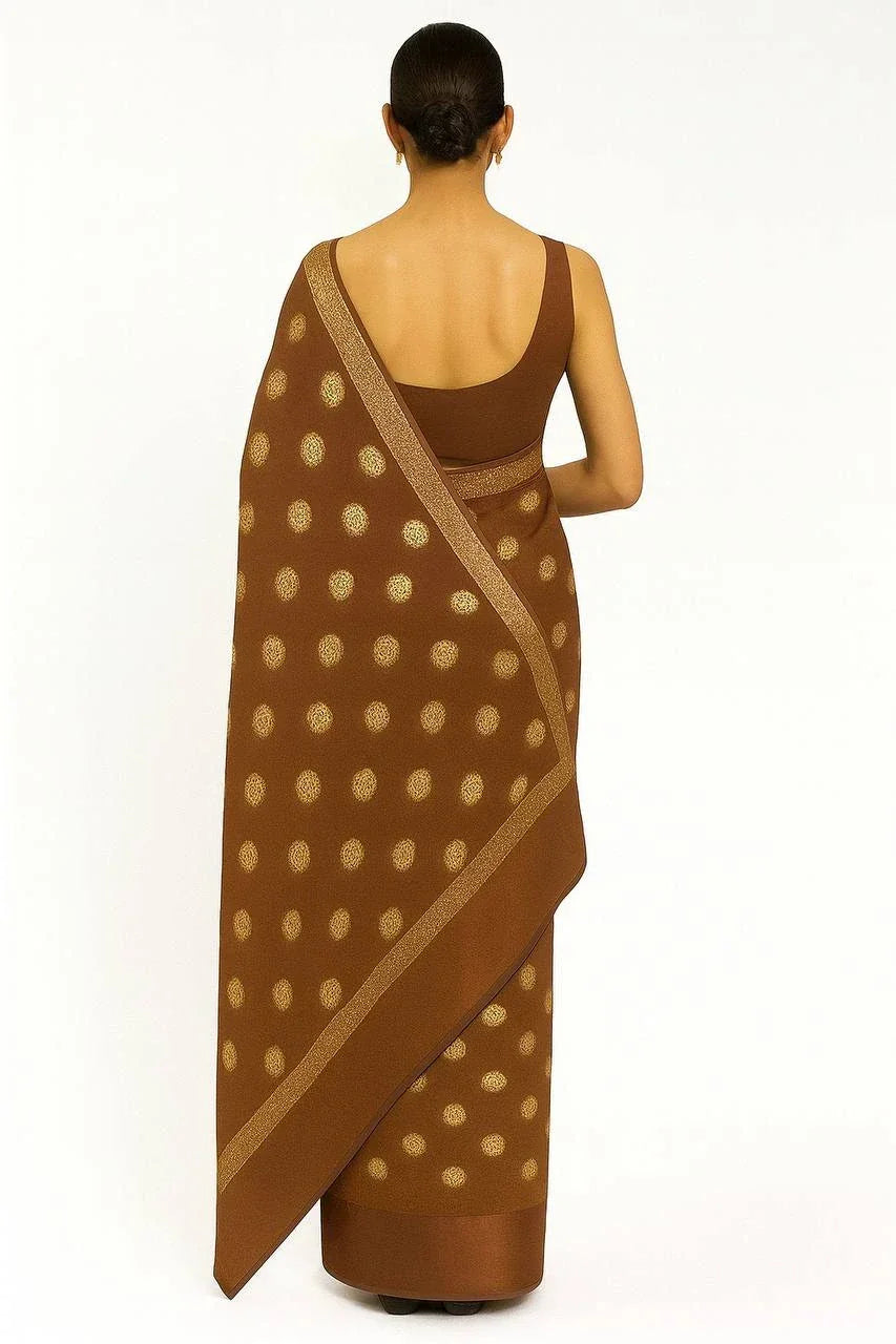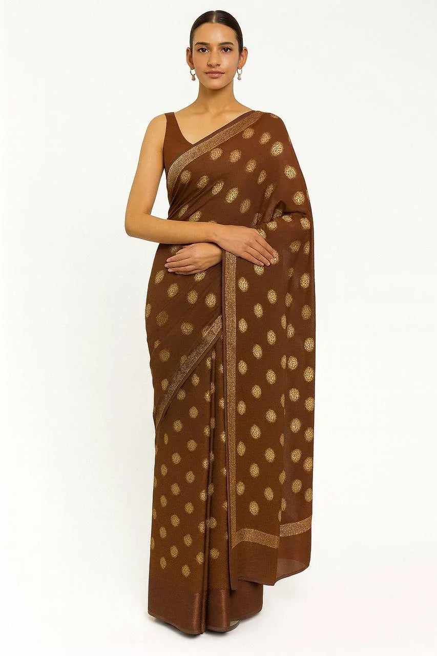 Introducing Glamwiz Ready to Wear Brown Viscose Georgette Saree. Step into the world of elegance with our beautiful Viscose Georgette sarees, meticulously crafted with exquisite embroidery work and stunning zari borders.