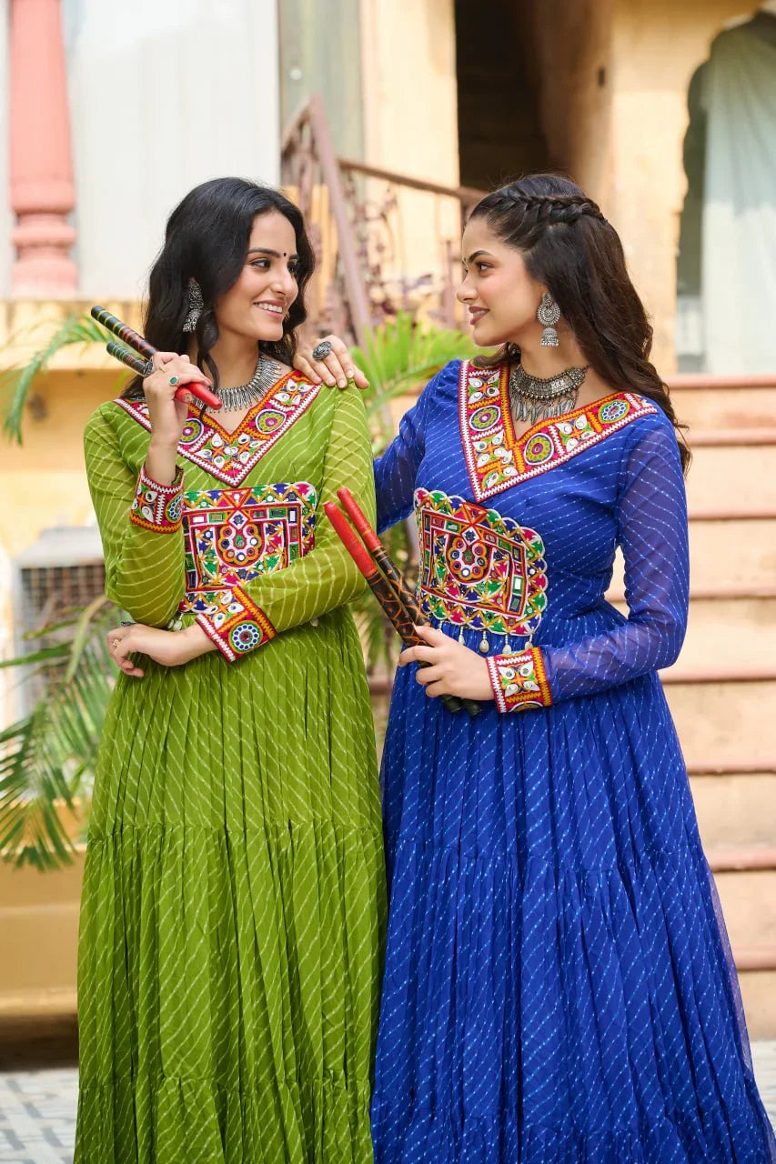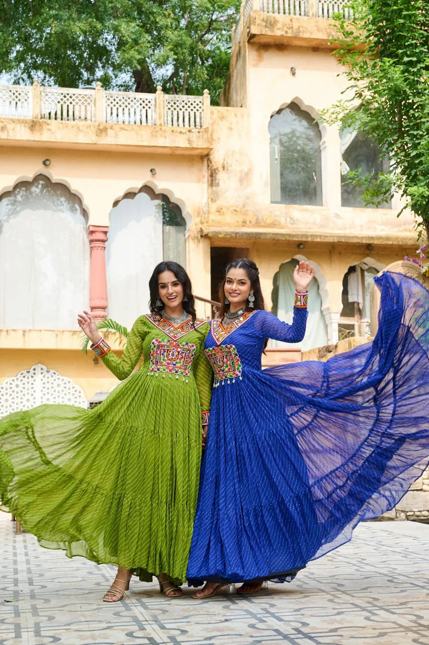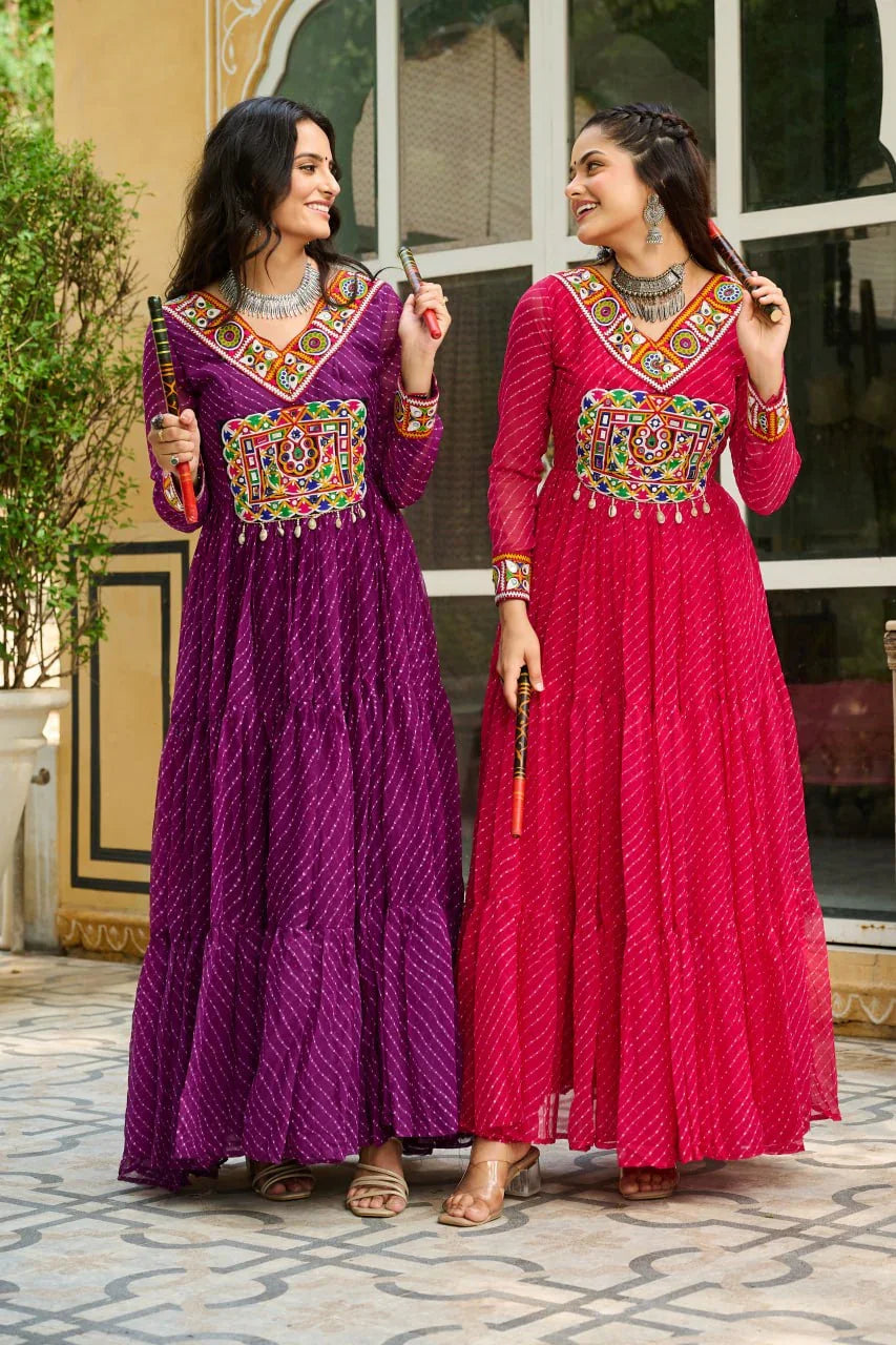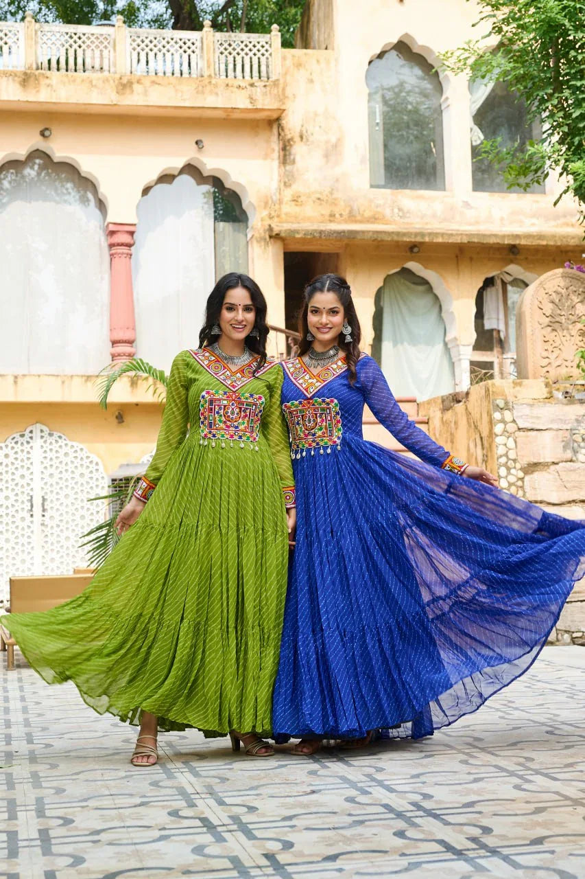 Adorn yourself in elegance with the Glamwiz Leheriya Print Anarkali Gown.
