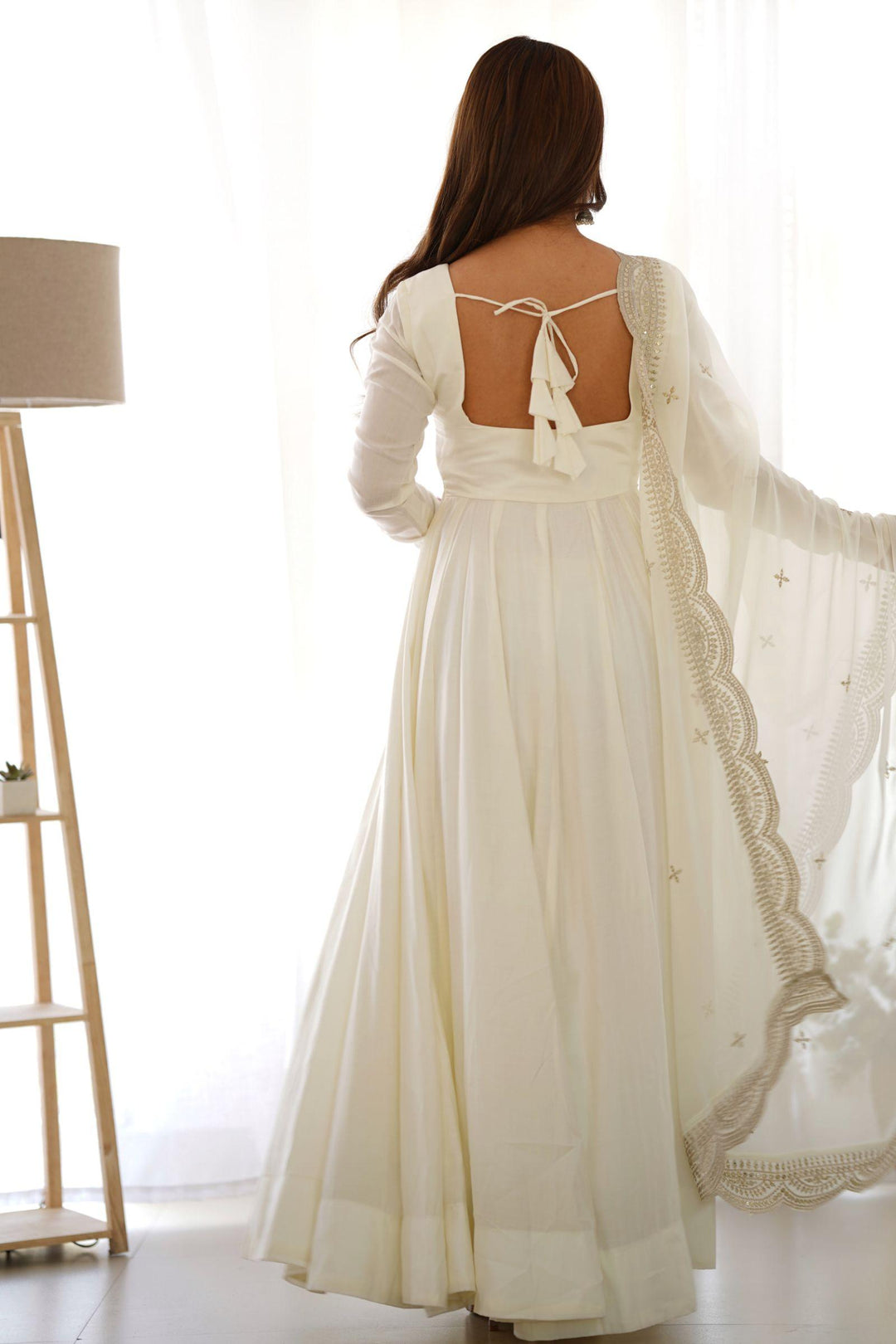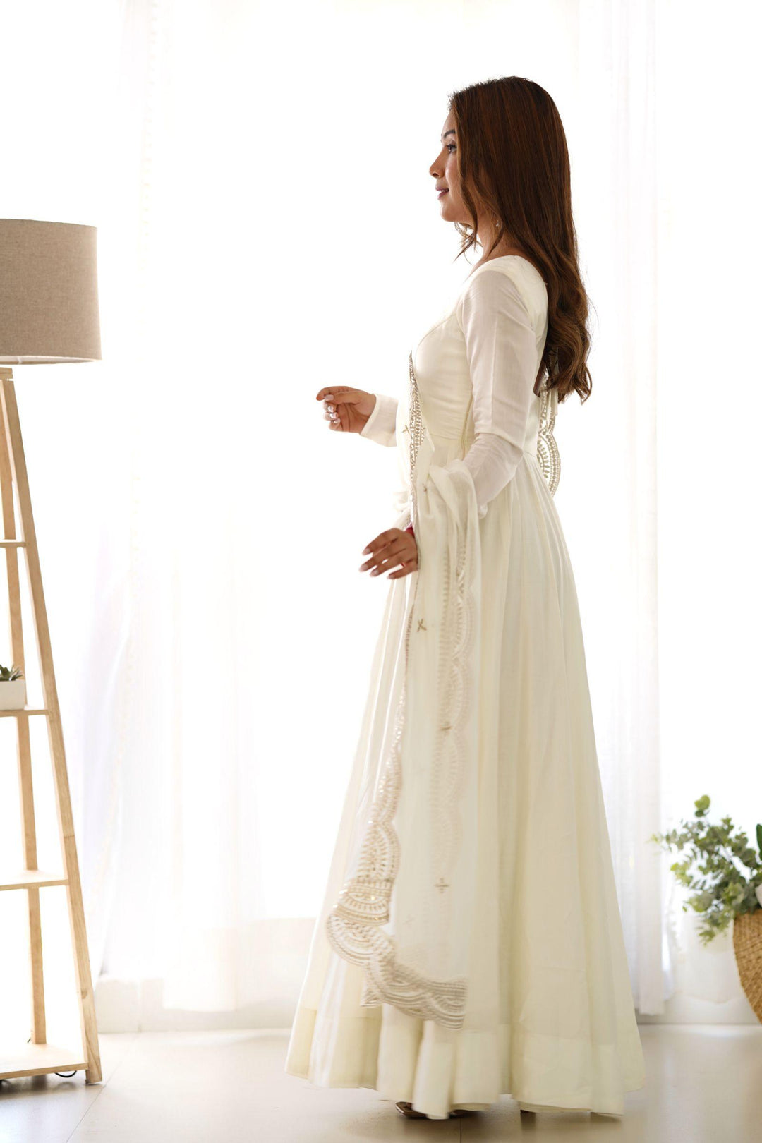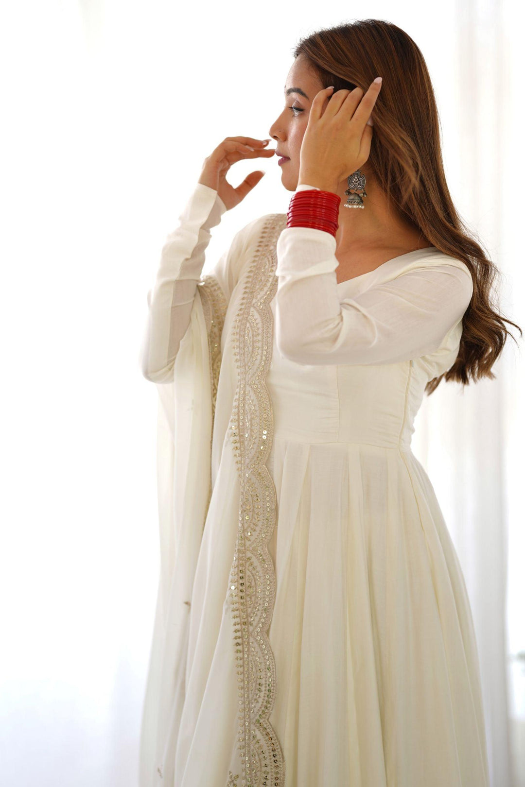 Introducing Glamwiz Serene White Anarkali Suit. Shop this lightweight white Anarkali suit, crafted in Chanderi (not pure) fabric ideal for daily wear or festive occasions.