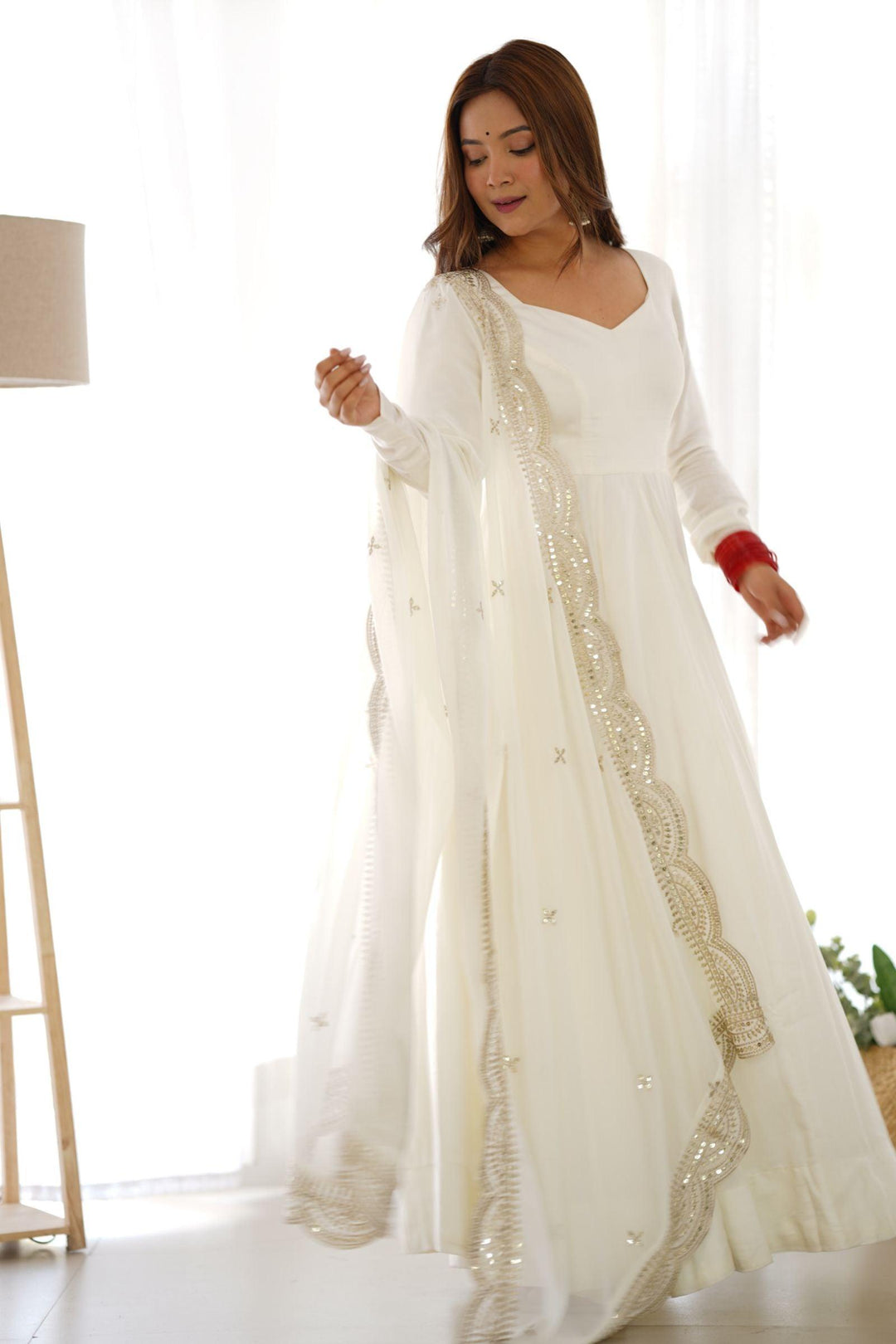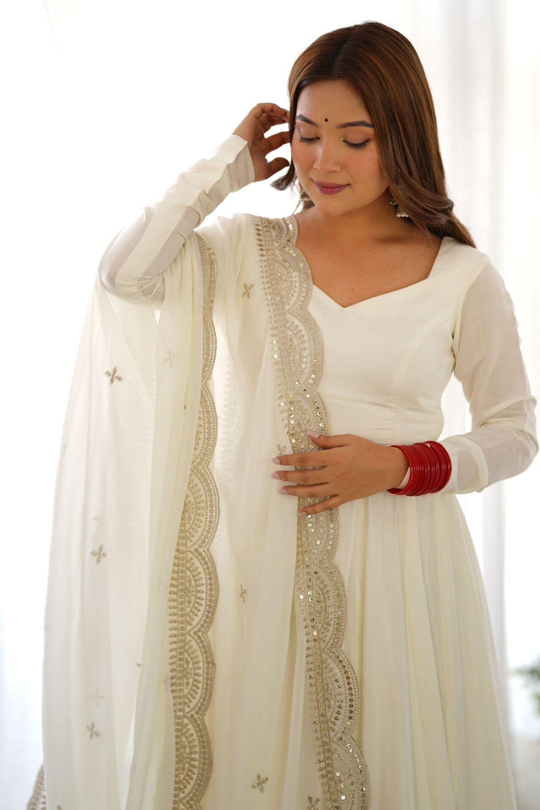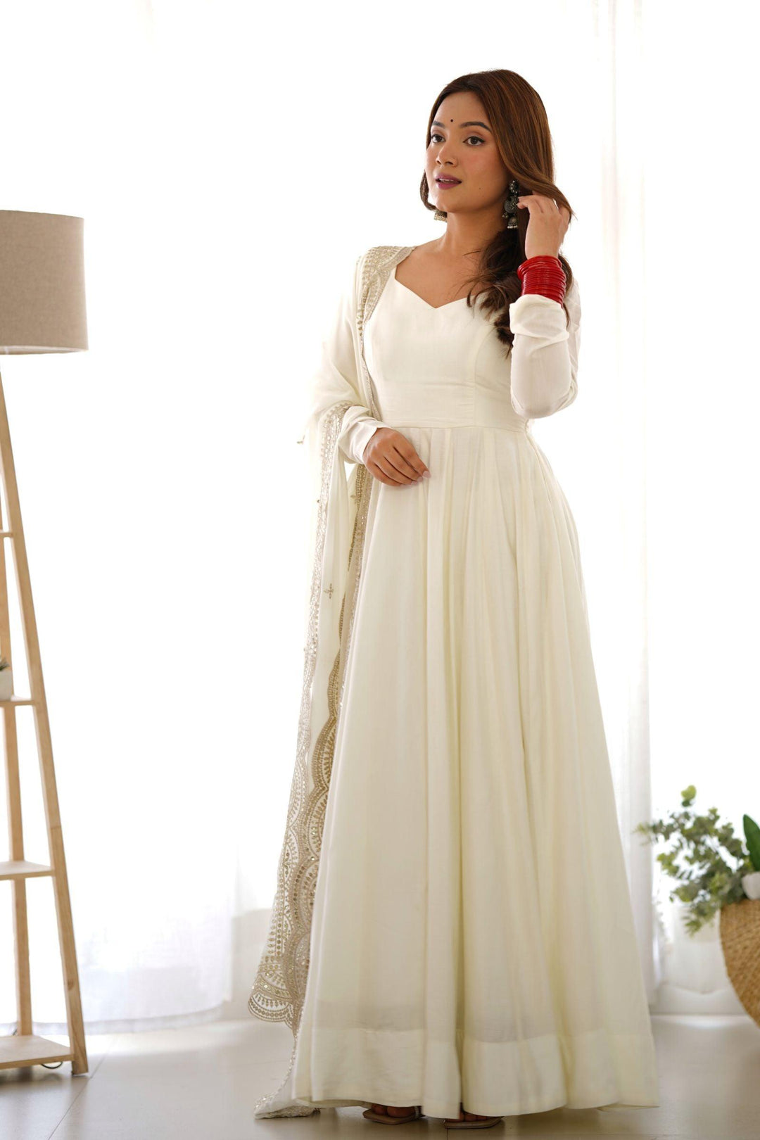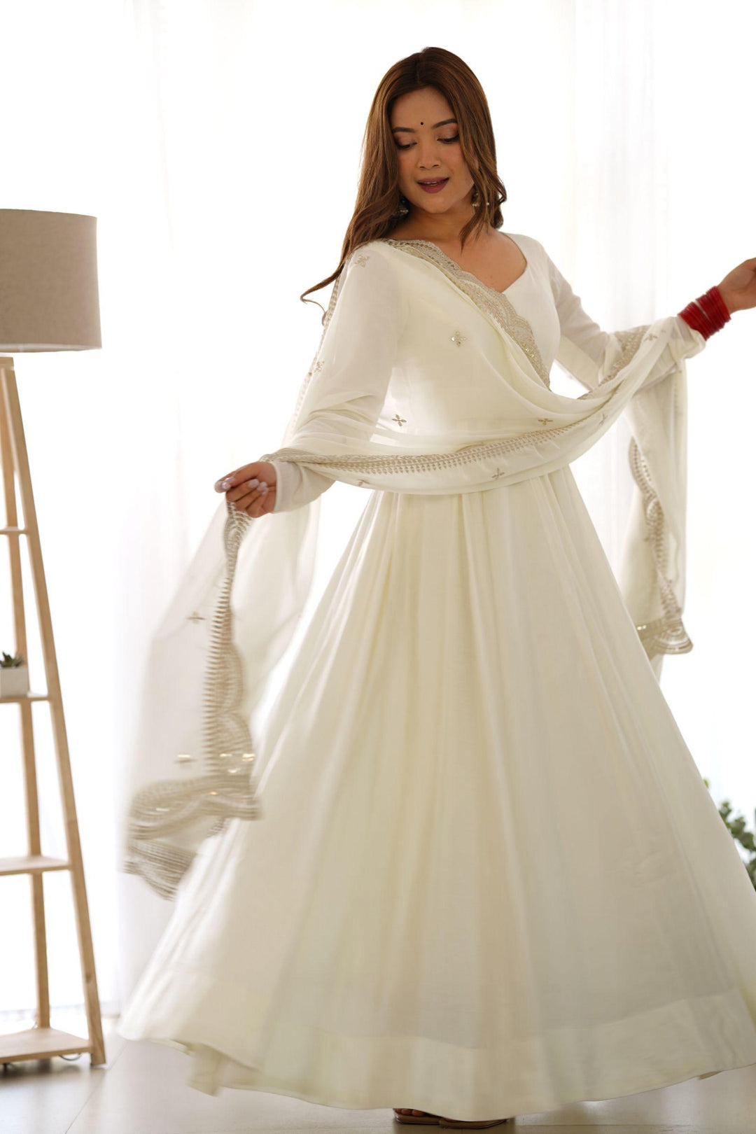 Introducing Glamwiz Serene White Anarkali Suit. Shop this lightweight white Anarkali suit, crafted in Chanderi (not pure) fabric ideal for daily wear or festive occasions.