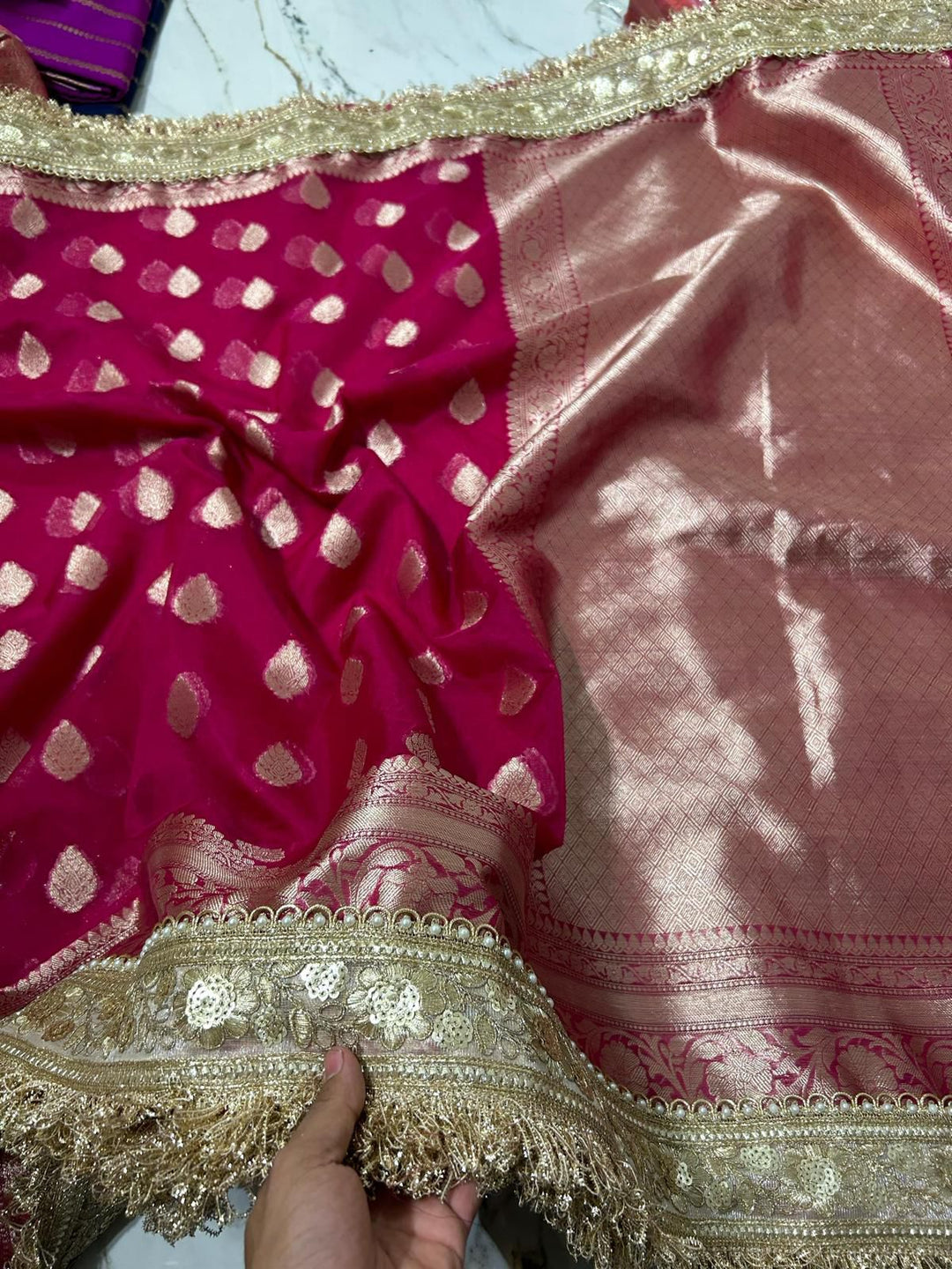 Indulge in regal elegance with the Gulabi Adaa Ready-to-Wear Hot Pink Tissue Saree. This exquisite masterpiece is crafted from the finest quality silk, adorned with intricate zari work and timeless Banarasi motifs. The rich, vibrant red hue and opulent design make it the perfect choice for your special day.